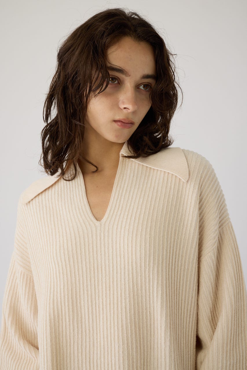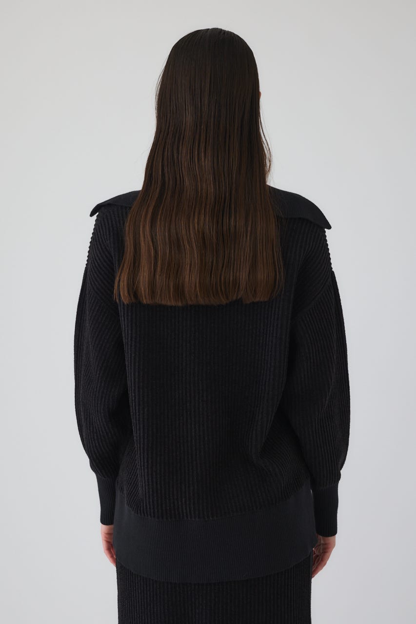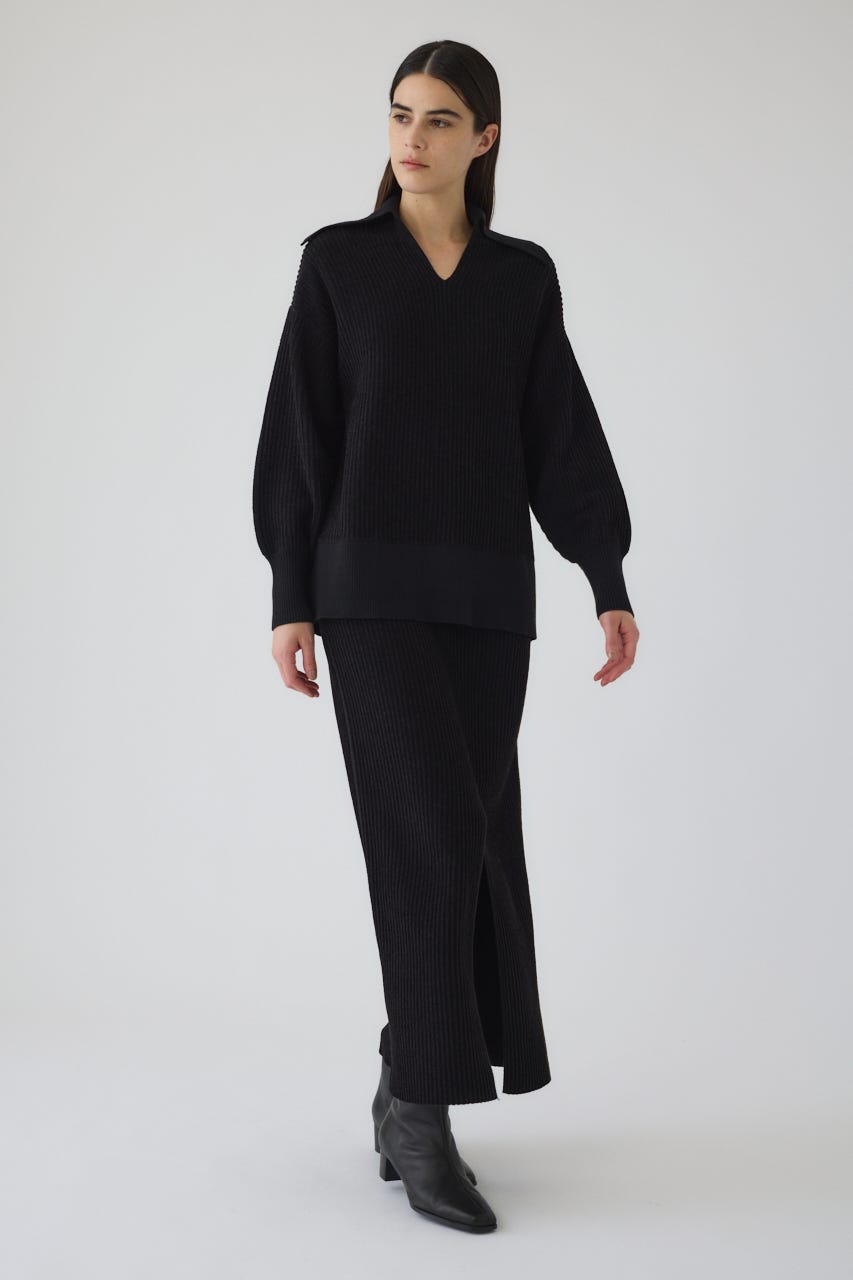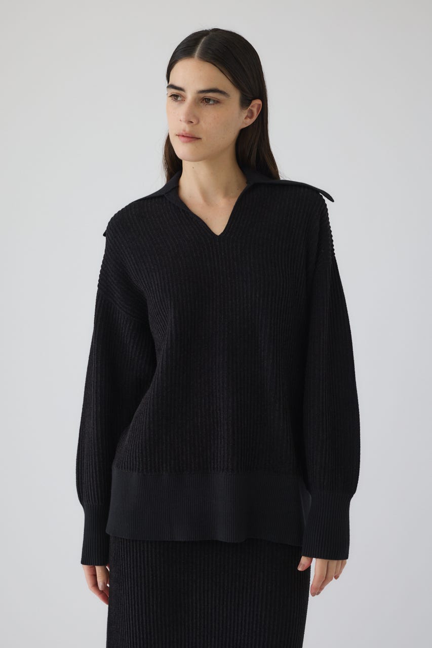 ■POINT:タック編みの表情豊かな編み地と、顔周りを華やかに見せる大きめの襟が特徴のニットプルオーバー。
