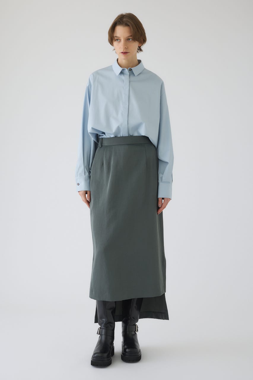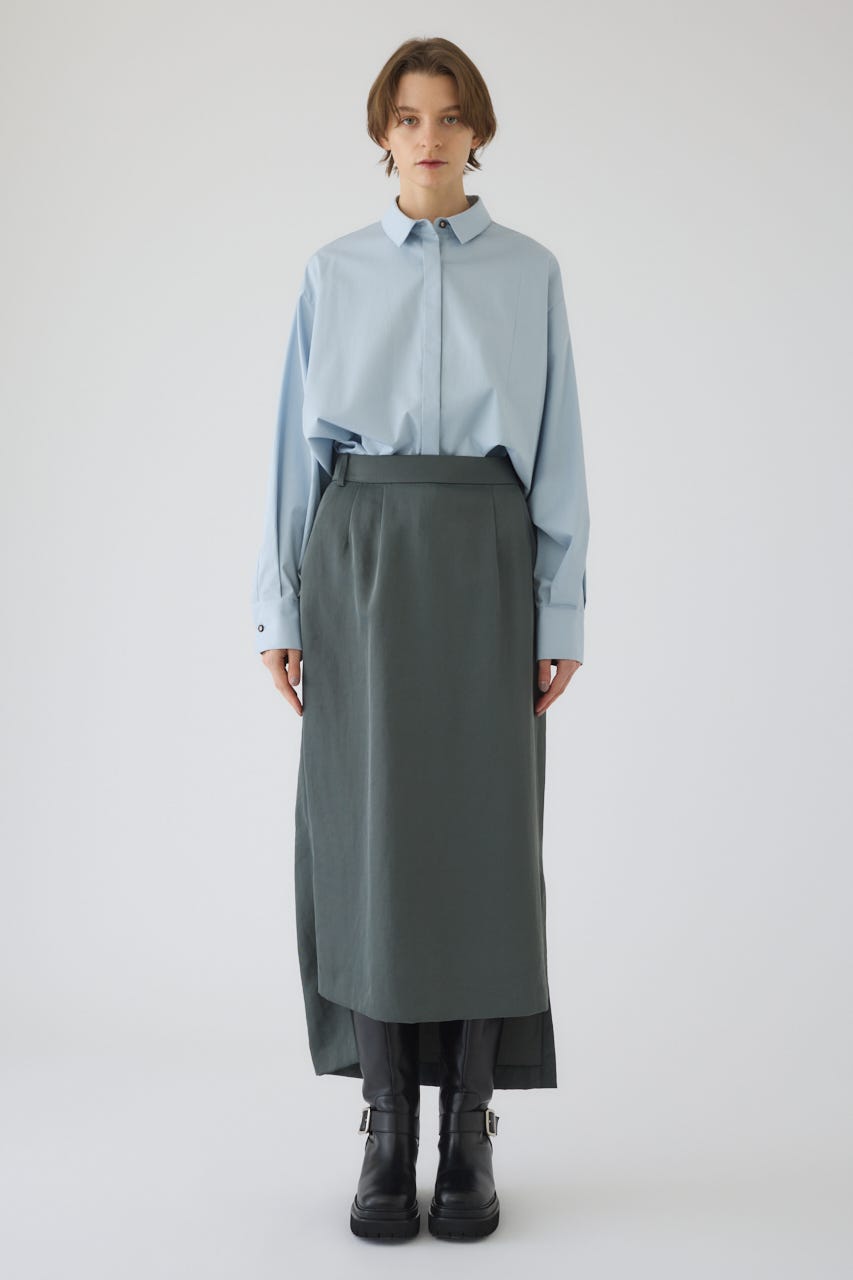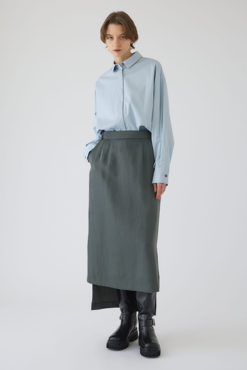 ■STYLING:フロントスリットの抜け感を活かし、ハイウエストのパンツやスカートと合わせるのがおすすめです。