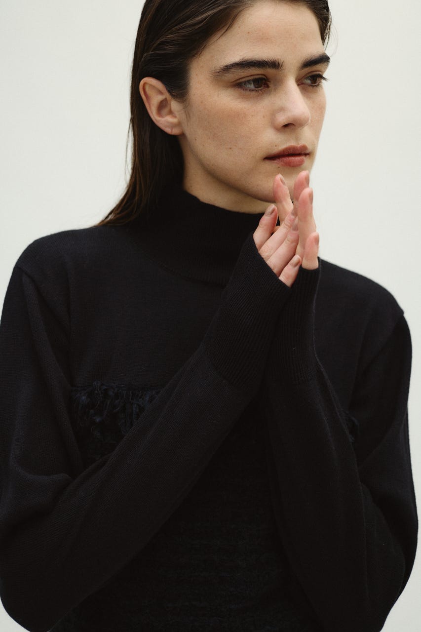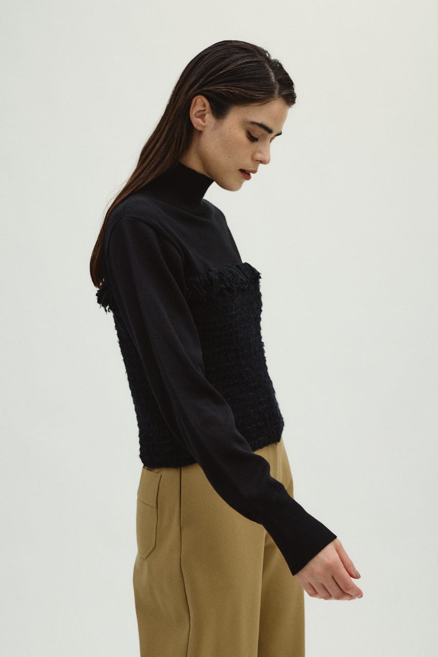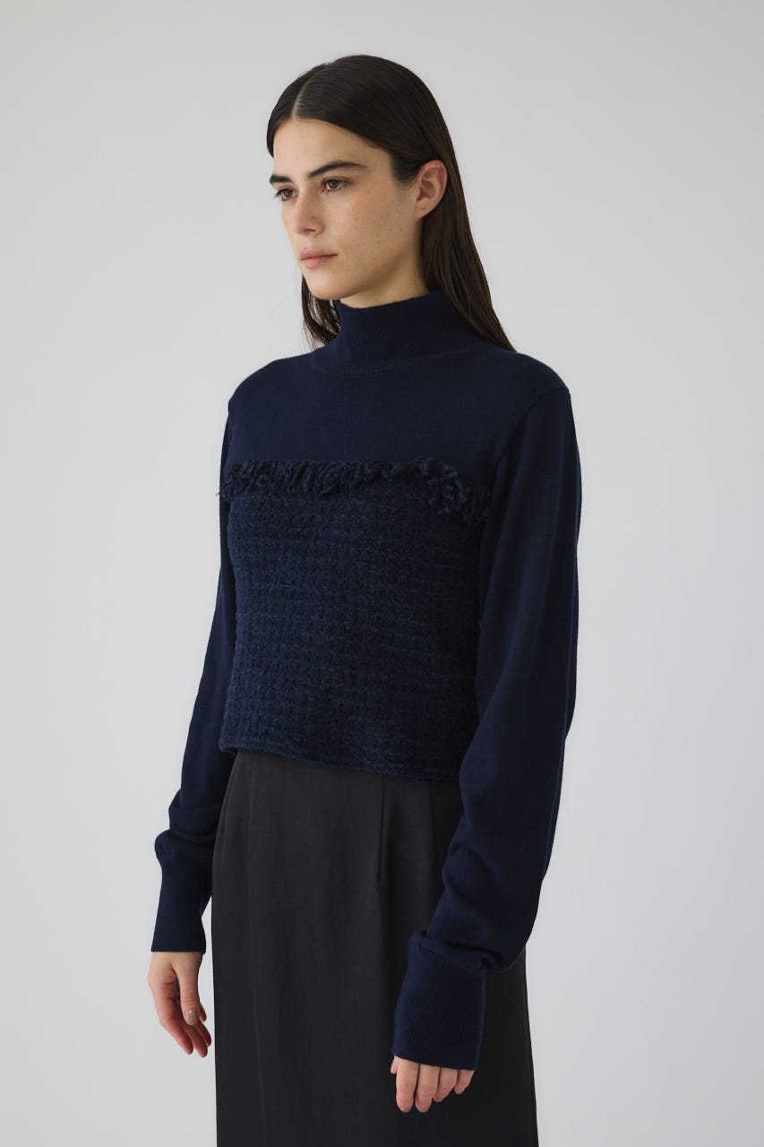 滑らかな天竺編みのハイゲージニットに表情豊かなツイード調のニット地をドッキング。