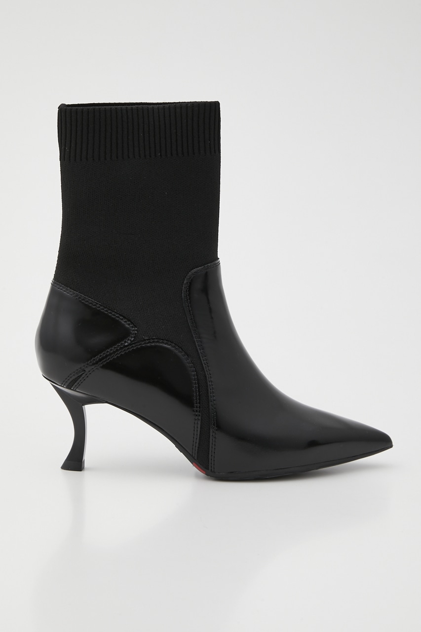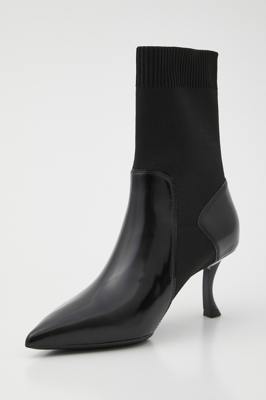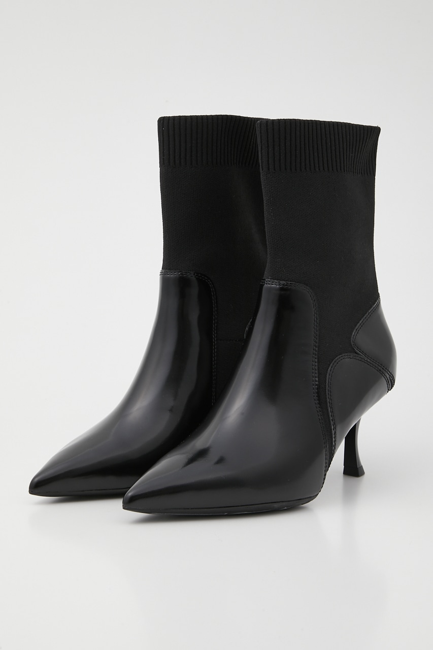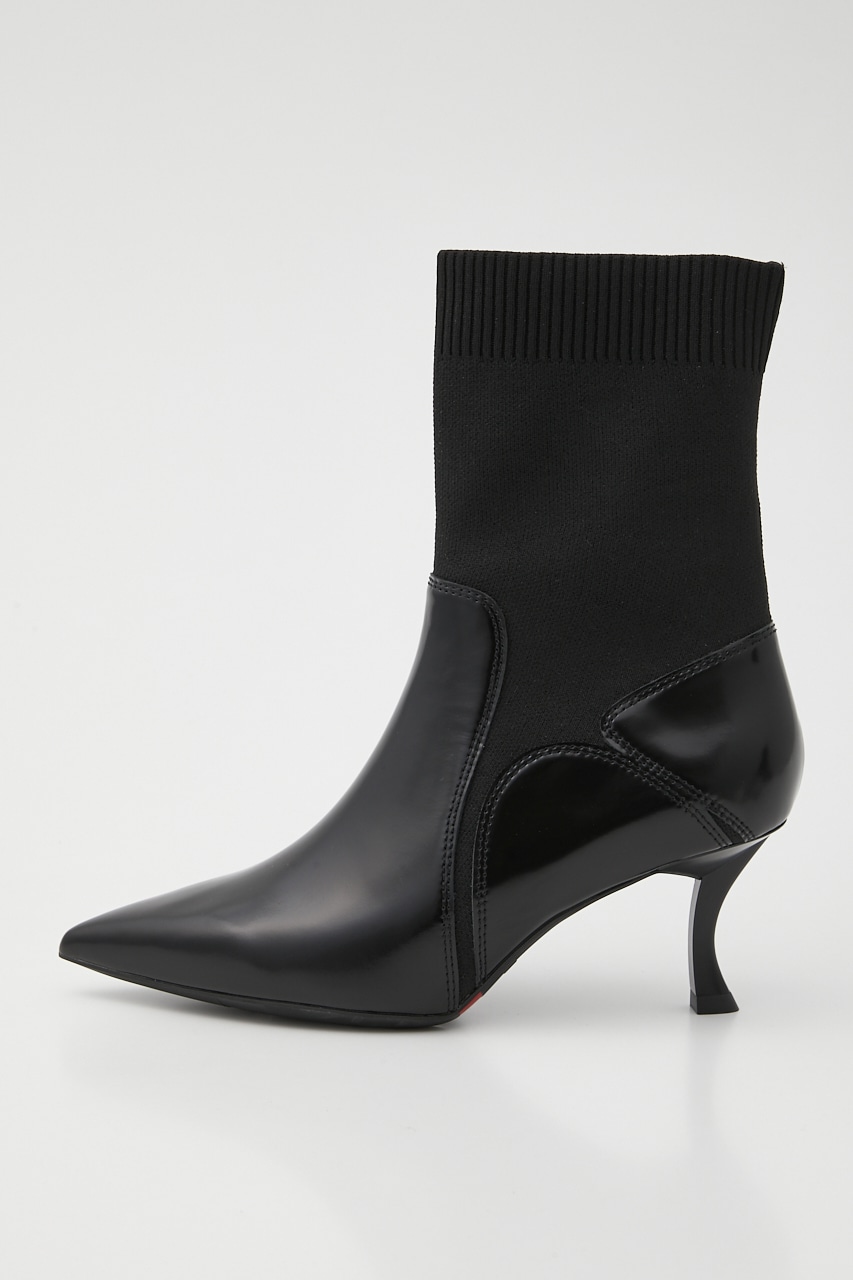 シックで洗練させれた印象のポインテッドコンビブーティー。あか抜け感のあるハイセンスな花びらのようなカットワークが粋なポイント。脚に沿うフォルムとニット地で、程良くスパイスのきいたスタイリッシュでグルービーなデザインです。
