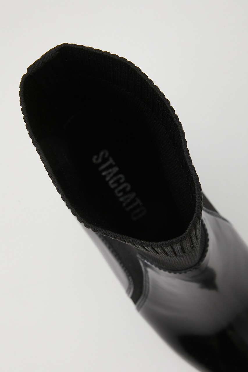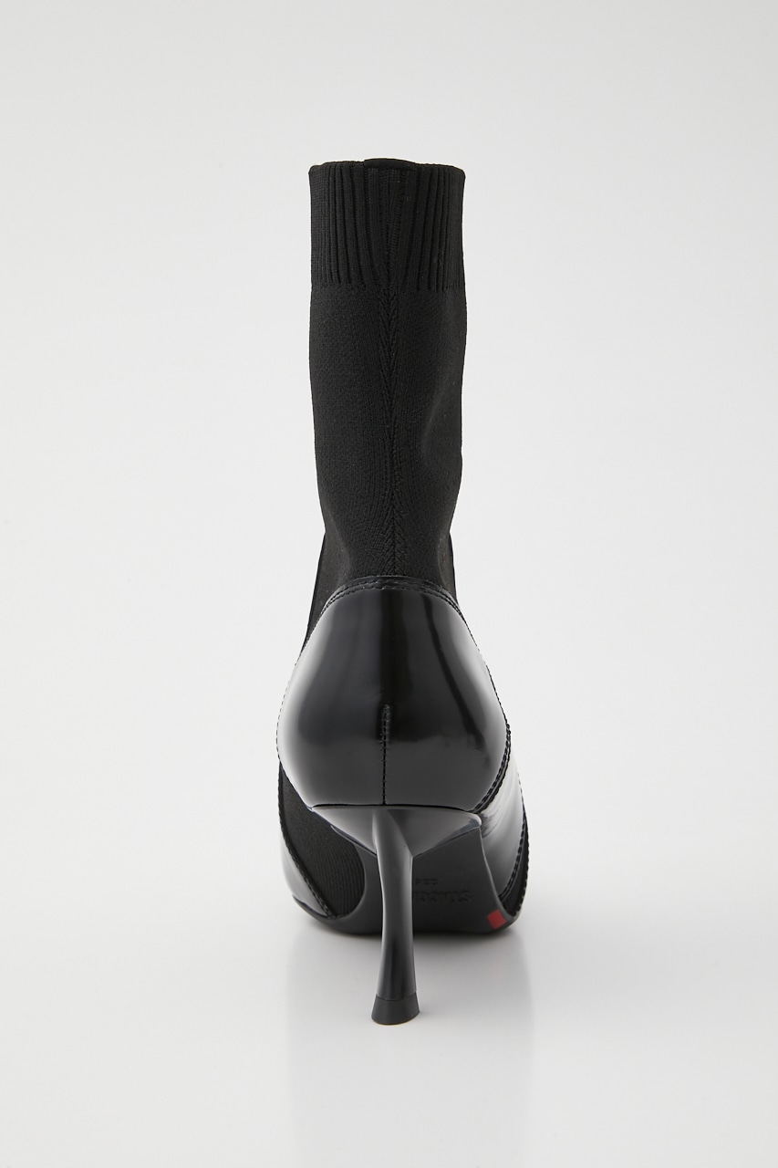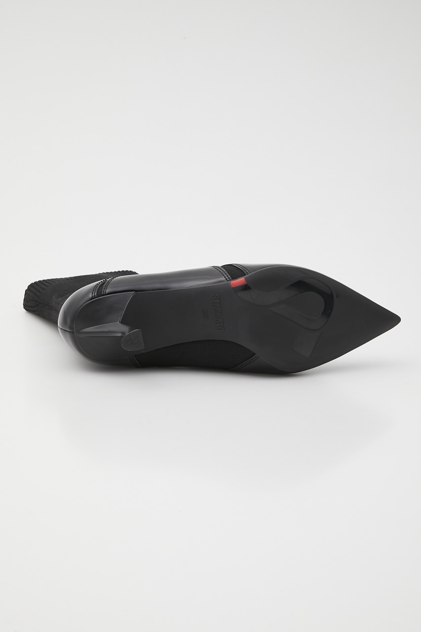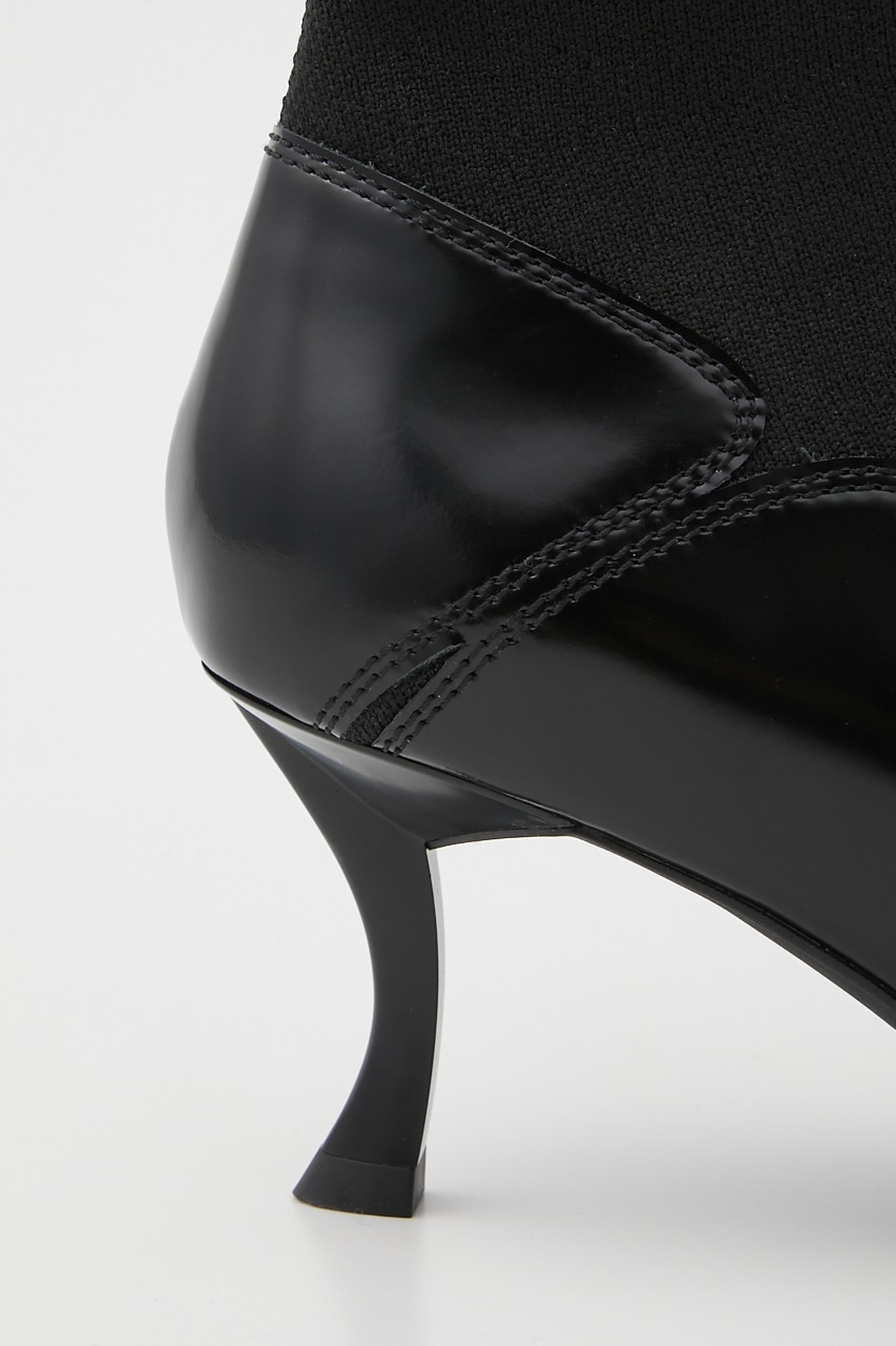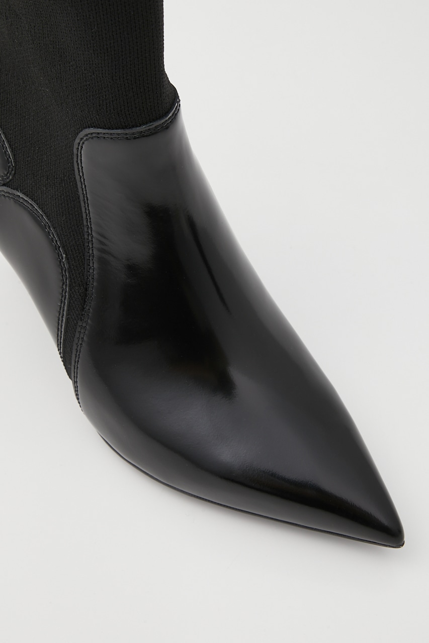 シックで洗練させれた印象のポインテッドコンビブーティー。あか抜け感のあるハイセンスな花びらのようなカットワークが粋なポイント。脚に沿うフォルムとニット地で、程良くスパイスのきいたスタイリッシュでグルービーなデザインです。