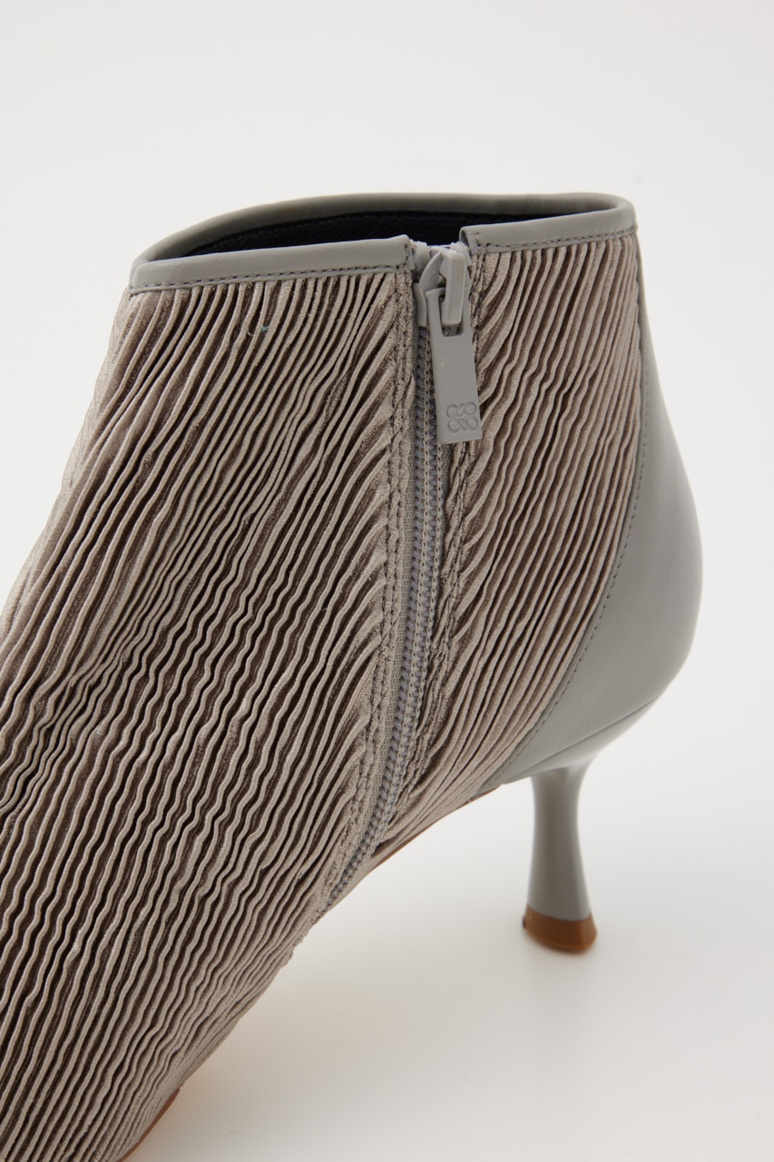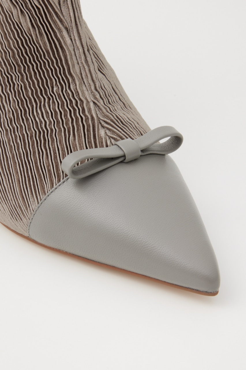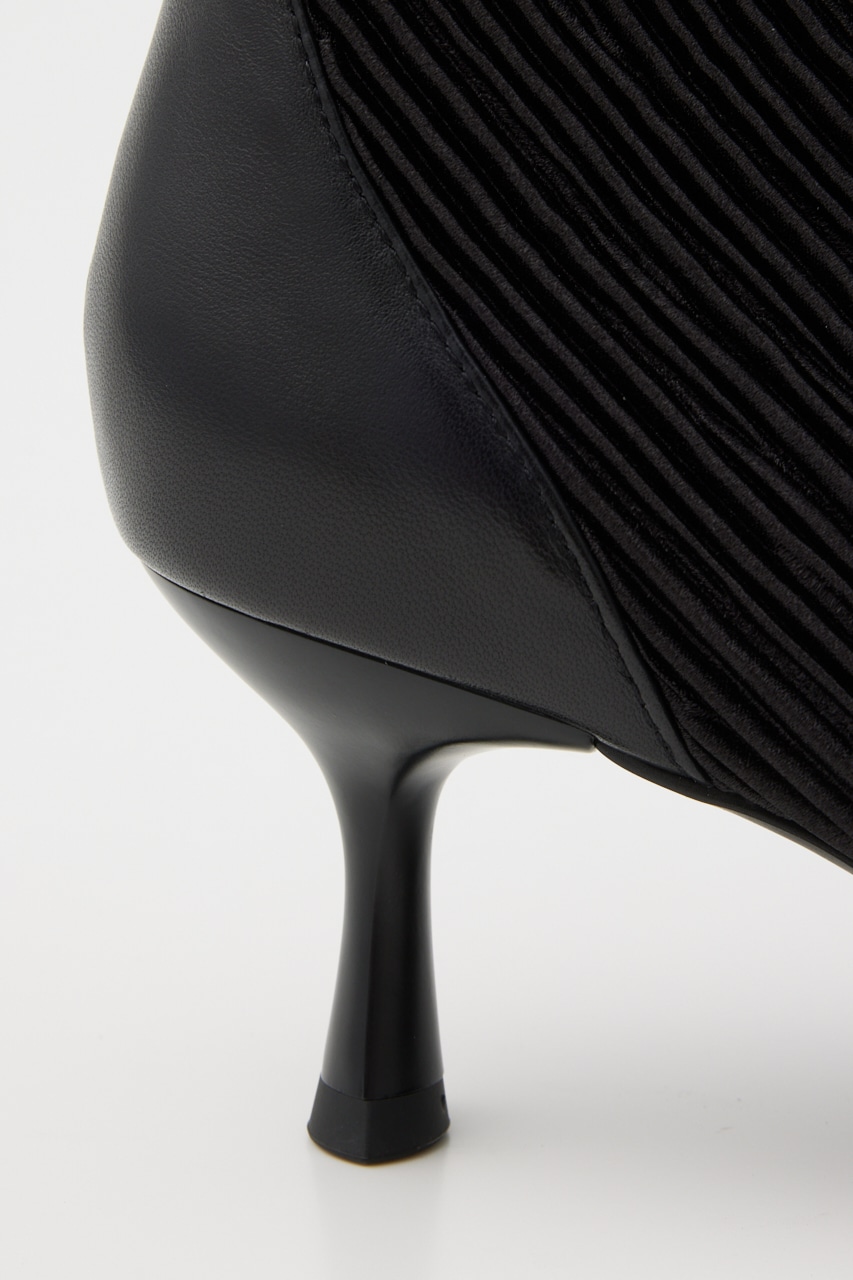 リュクスな雰囲気の雅やかなアンクルブーティー。優美な佇まいのシフォンのようにシャーリングされた立体的なリブデザインがフェミニンかつ気品が漂う。安定感のあるピンヒールにさり気ないミニマルなリボンもポイントです。