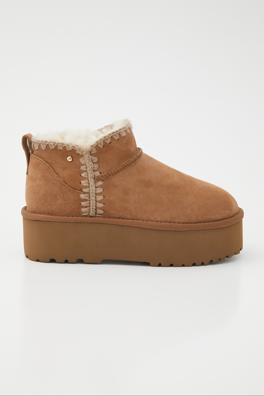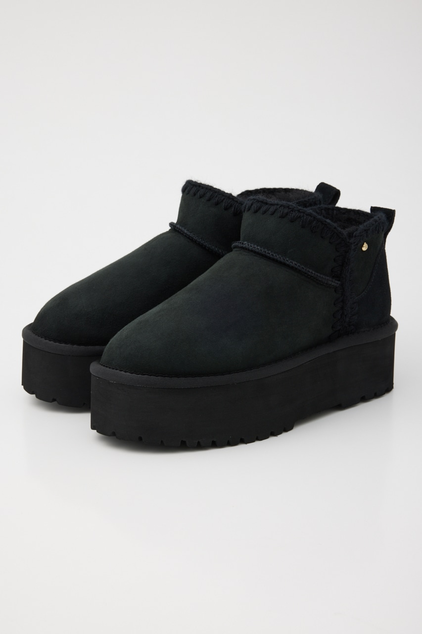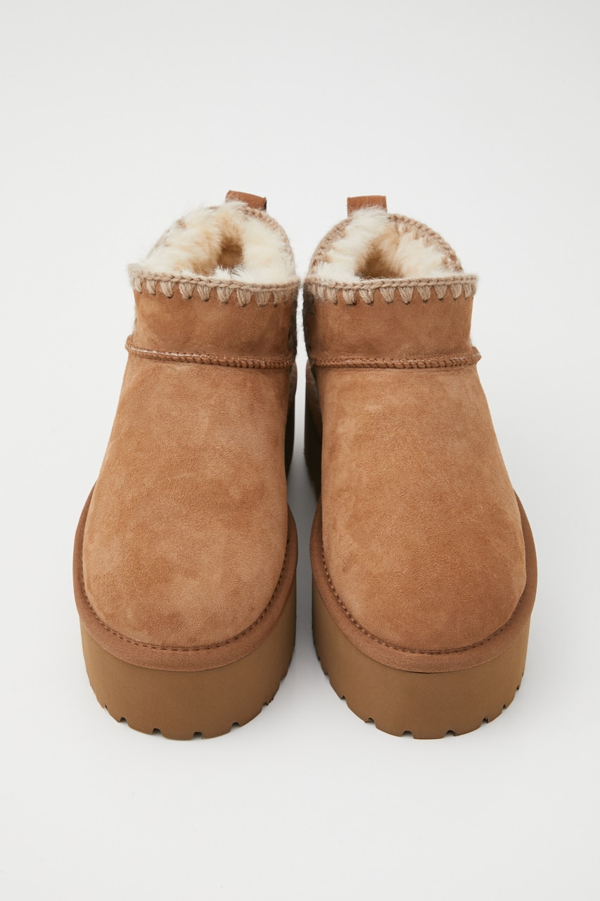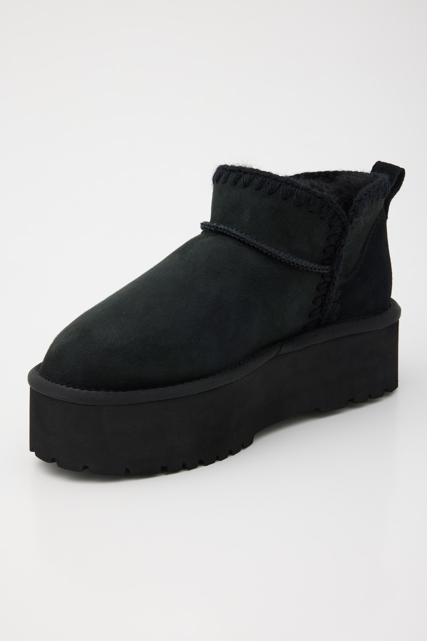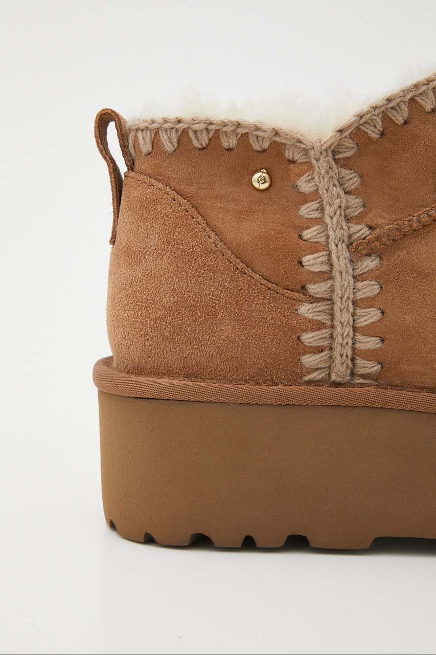 【GISELe 2024年1月号 P72,73掲載】 ボヘミアンな雰囲気のムートンブーツ。カントリー感も感じる太めステッチに、トレンドライクな厚底ソールが脚長効果も◎ライニングは吸湿性と放湿性・通気性に優れたシープスキンで快適&保温性も防寒対策もパッチリです。