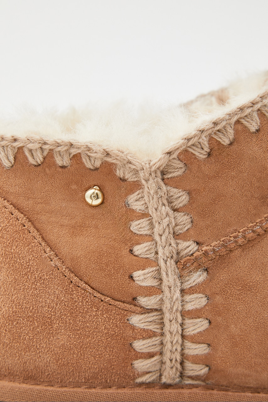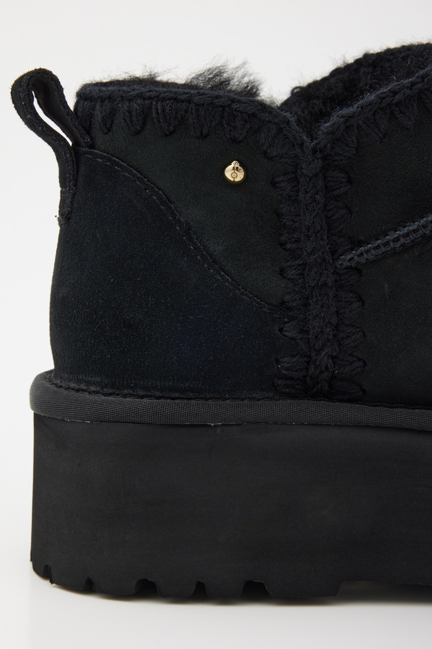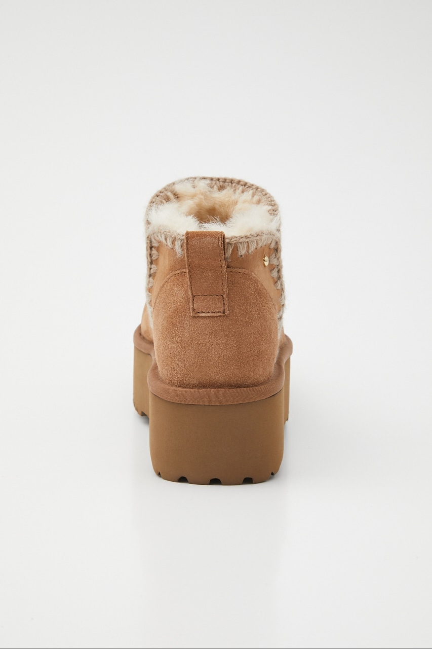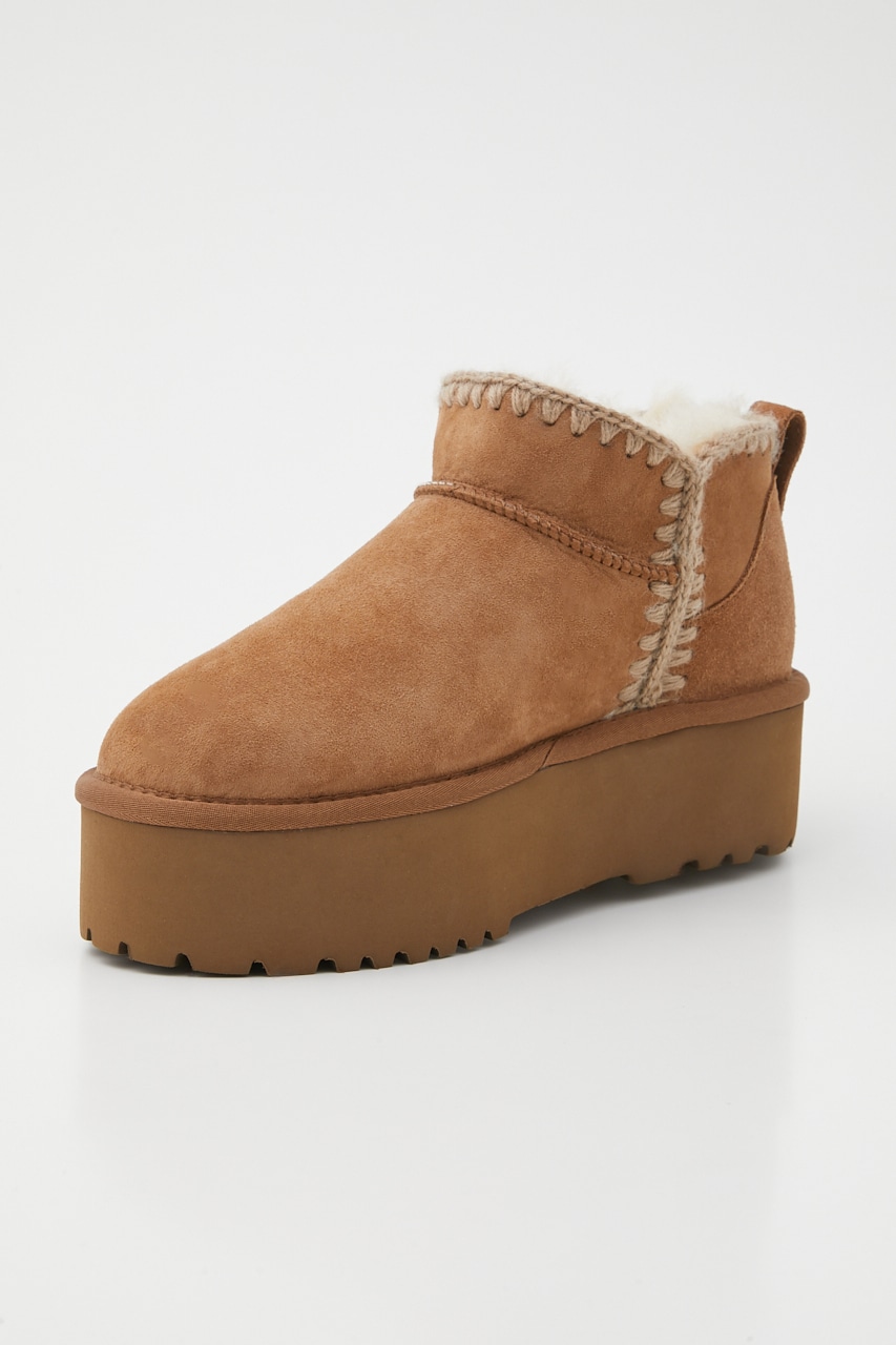【GISELe 2024年1月号 P72,73掲載】 ボヘミアンな雰囲気のムートンブーツ。カントリー感も感じる太めステッチに、トレンドライクな厚底ソールが脚長効果も◎ライニングは吸湿性と放湿性・通気性に優れたシープスキンで快適&保温性も防寒対策もパッチリです。