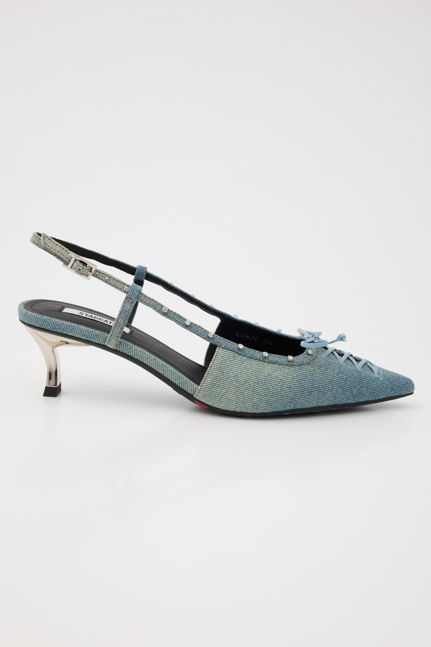 今旬なトレンドのデニムを落とし込んだ、おしゃれ・感度高めなバックスリングパンプス。変形されたシルバーヒールや辛口見えなレースアップデザインに細かなストーンをほどこした繊細なディテールが個性の光る、おすすめの1足。