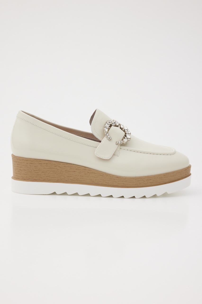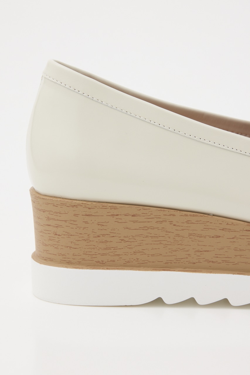 大人気の厚底シューズに新デザインが仲間入り!オリジナリティ溢れる三日月型のサークルビジューをあしらったエレガント×カジュアルなデザイン。スリッポンタイプで履けるローファー風デザインに、脚長効果も絶大なウッド調のウェッジソール×ホワイトのシャークソールのプラットフォームも人気のポイント。スタイリングを選ばない、パンツスタイルにもワンピースでも相抜群です。