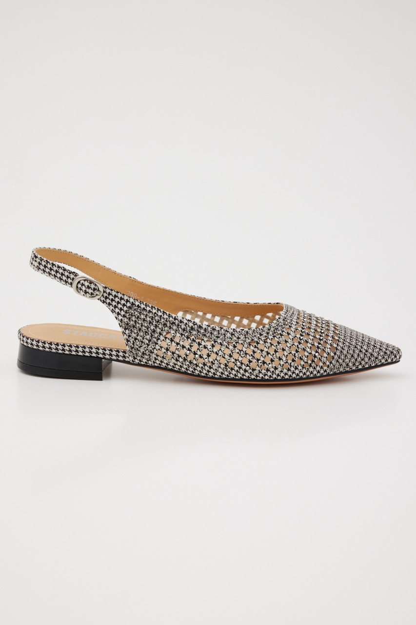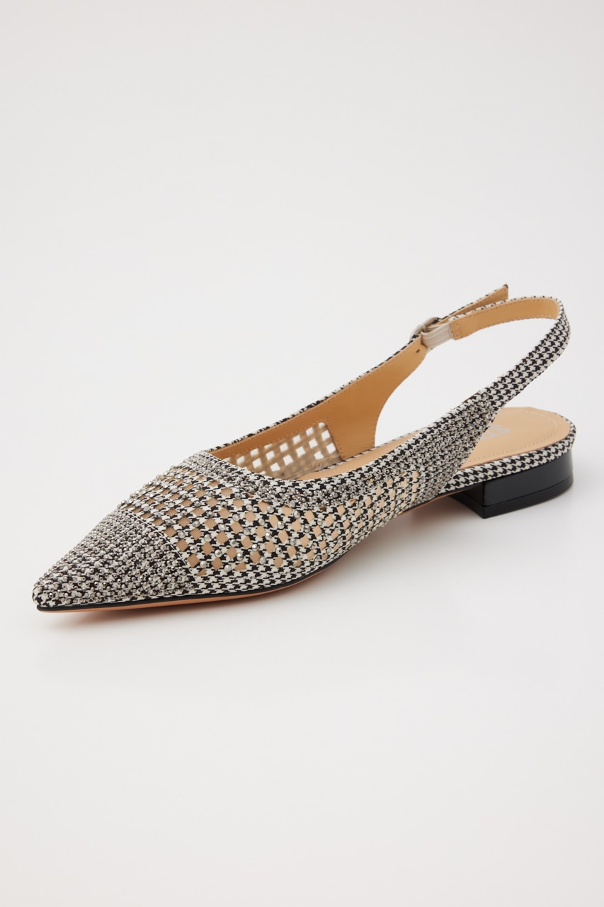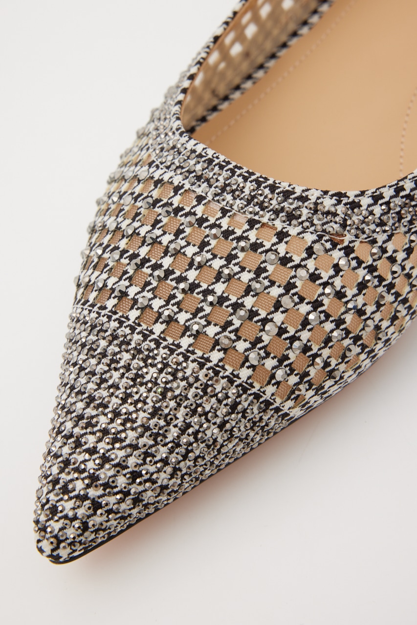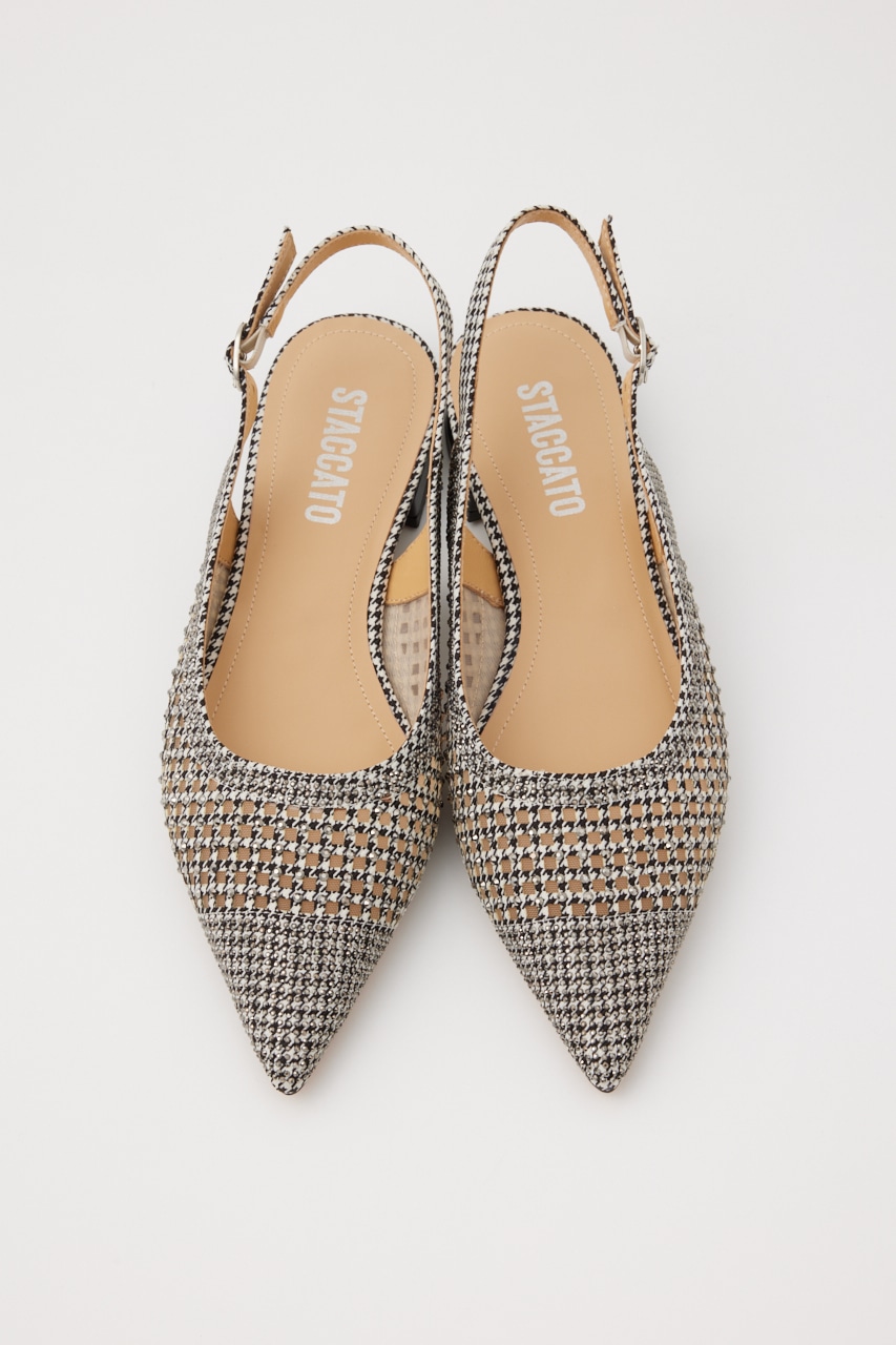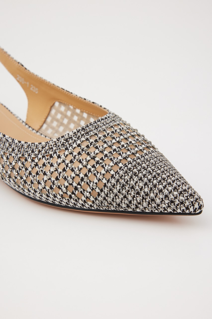 レトロクラシックな雰囲気の、さらりとしたメッシュ地にモノトーンカラーをベースにした千鳥格子柄上には1粒ずつストーンを装飾した、細かなディテールの精緻なデザインが光る。スタイリッシュなポインテッドトゥに、スリングバックタイプなのでサンダル感覚でも履いていただけます。
