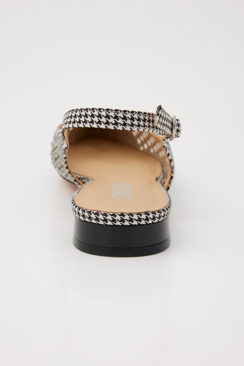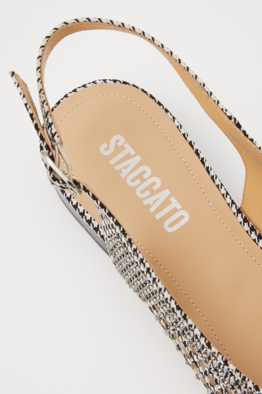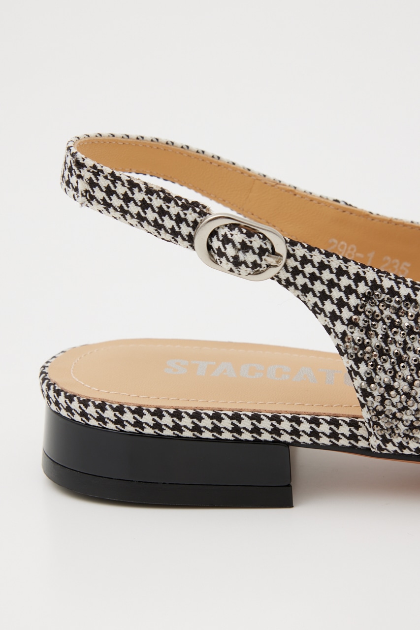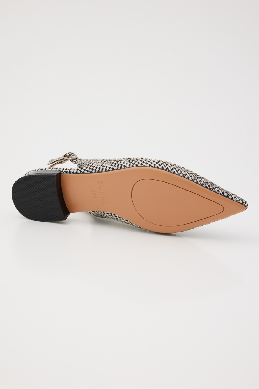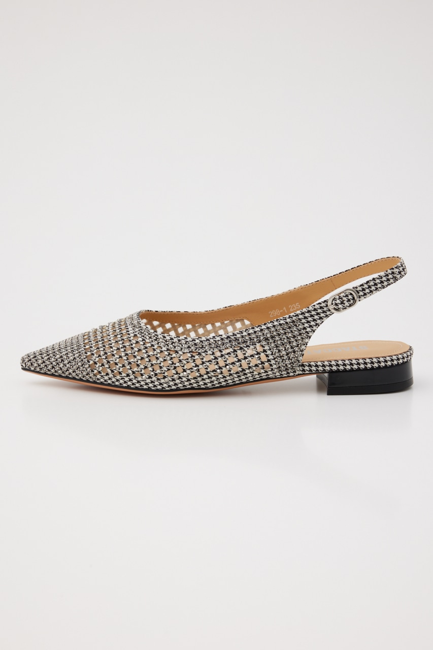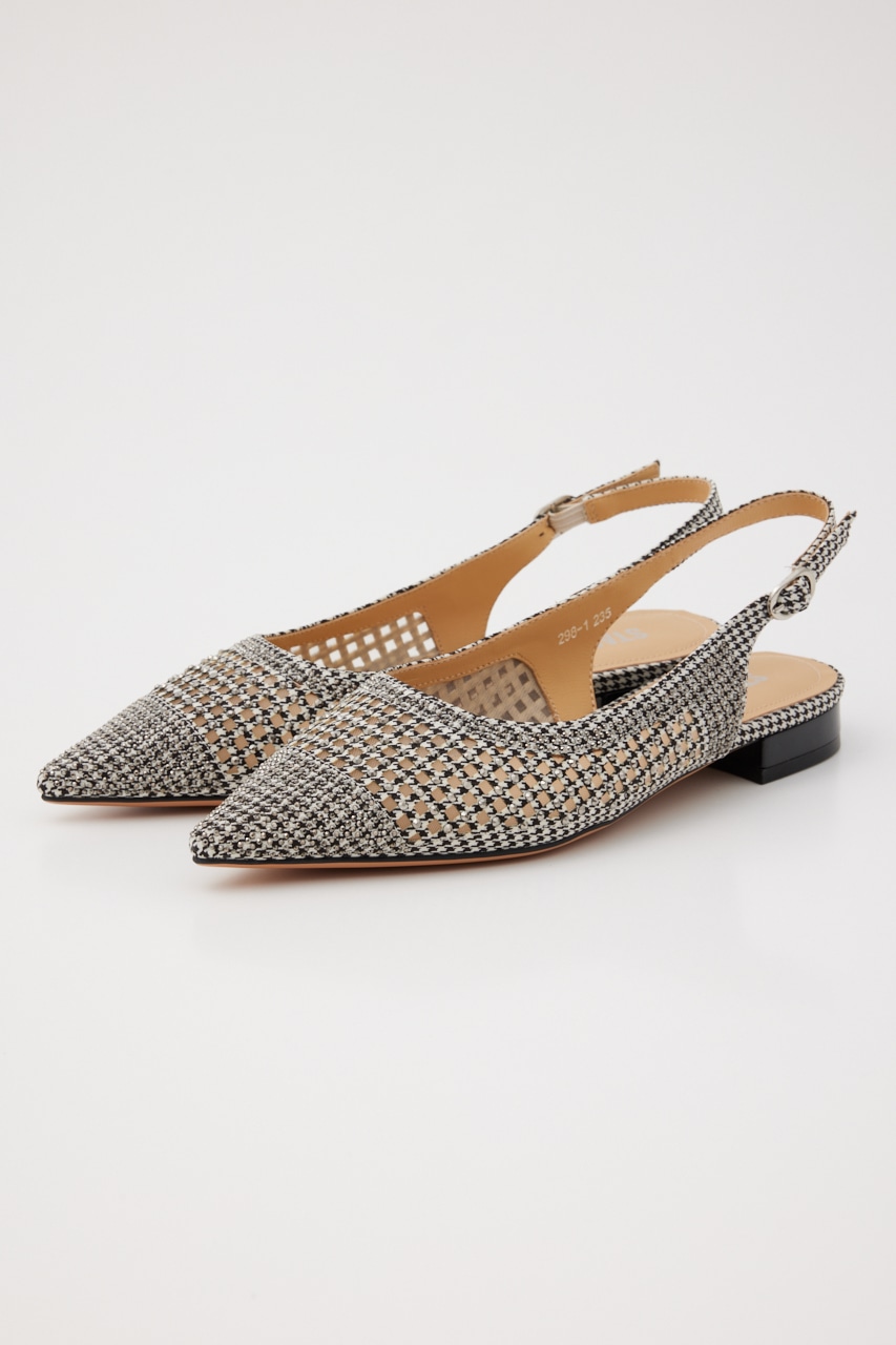 レトロクラシックな雰囲気の、さらりとしたメッシュ地にモノトーンカラーをベースにした千鳥格子柄上には1粒ずつストーンを装飾した、細かなディテールの精緻なデザインが光る。スタイリッシュなポインテッドトゥに、スリングバックタイプなのでサンダル感覚でも履いていただけます。