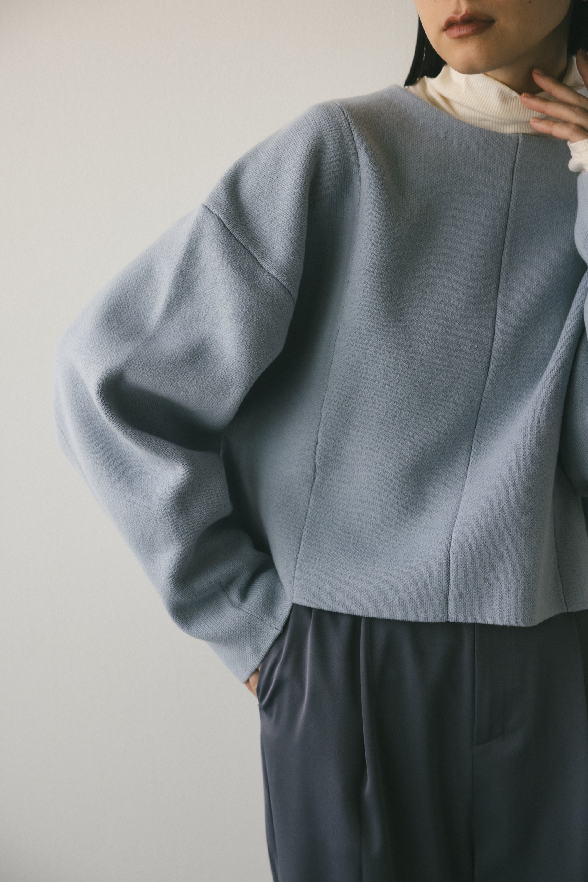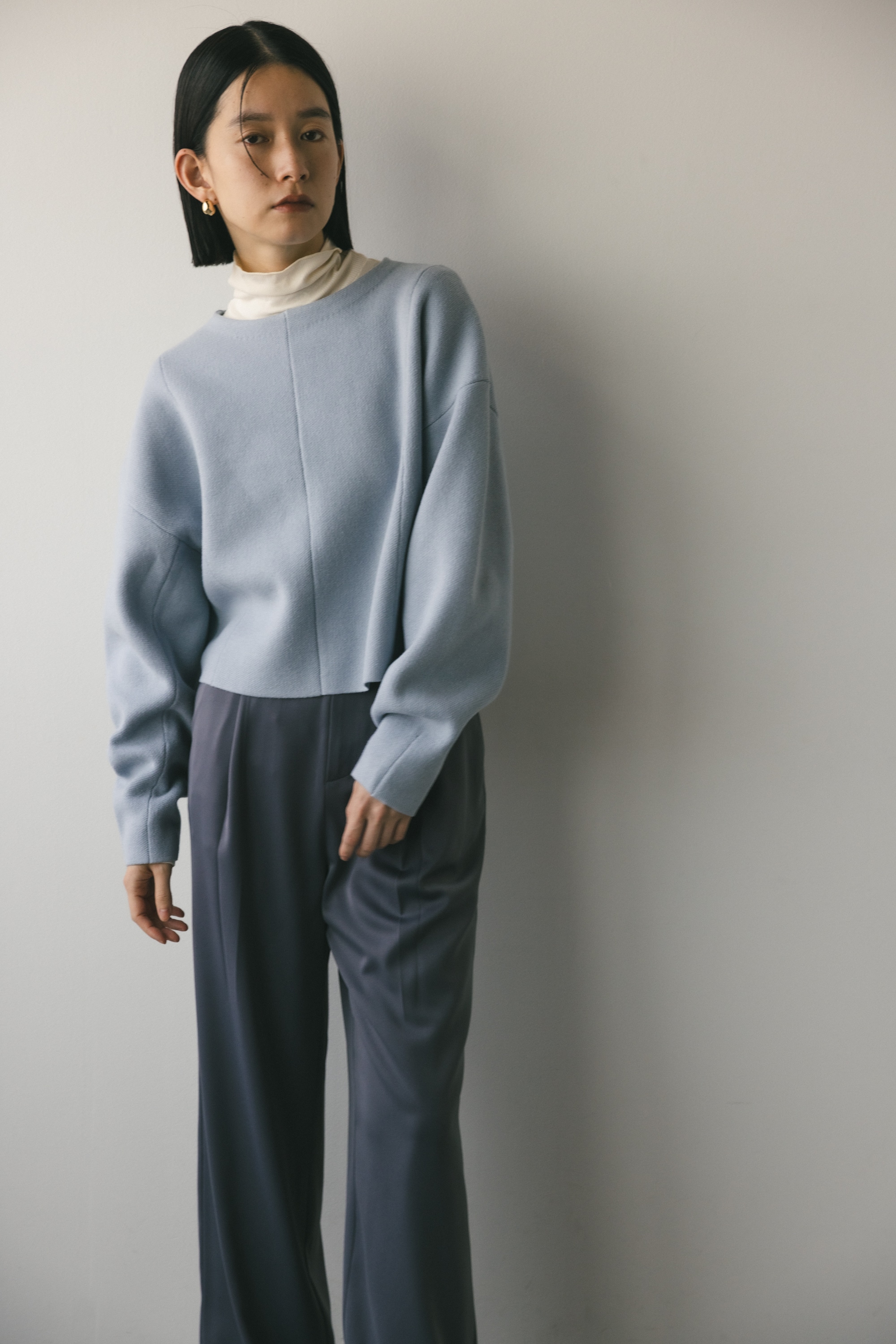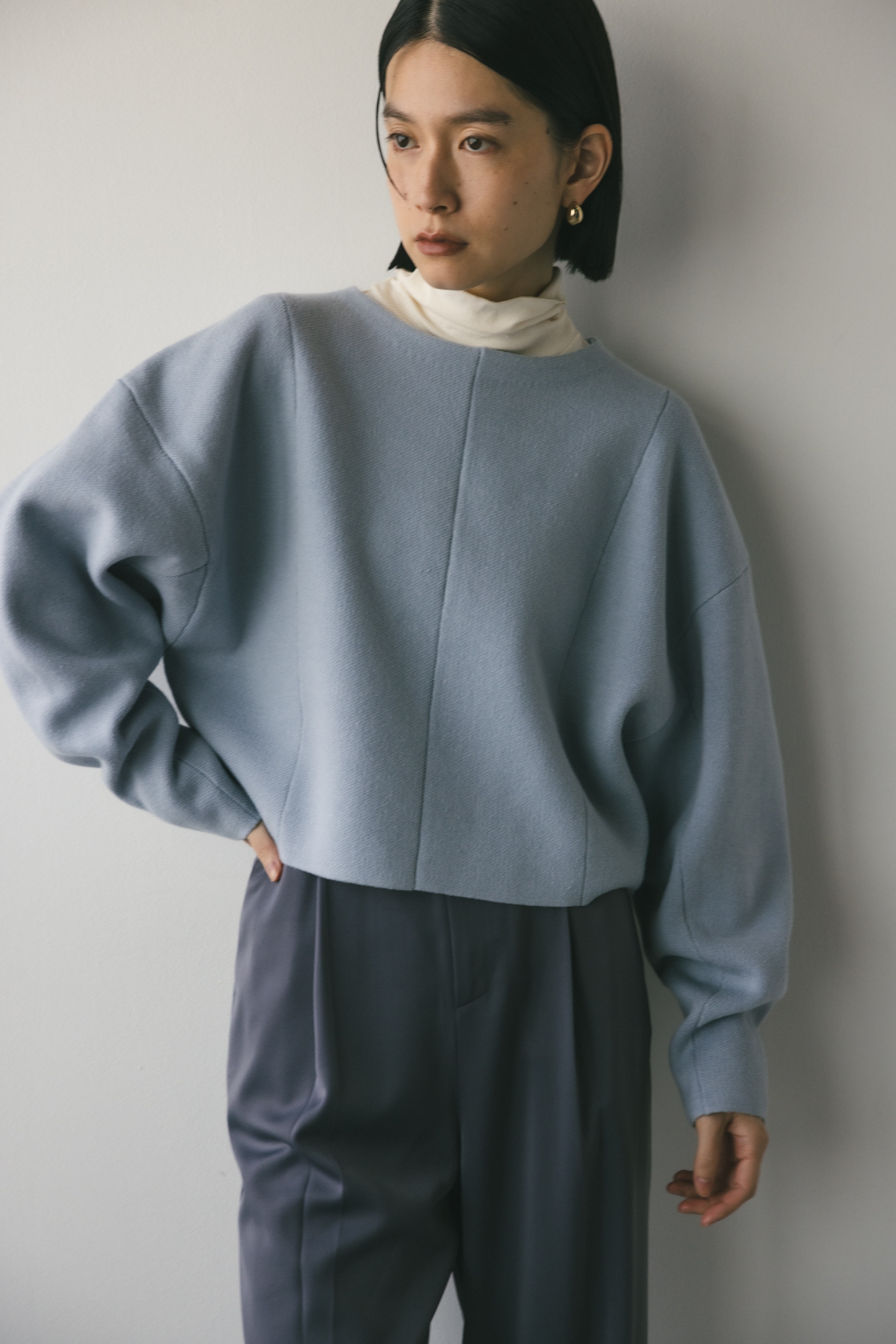 袖のカーブラインのシルエットがポイントのニットトップ。