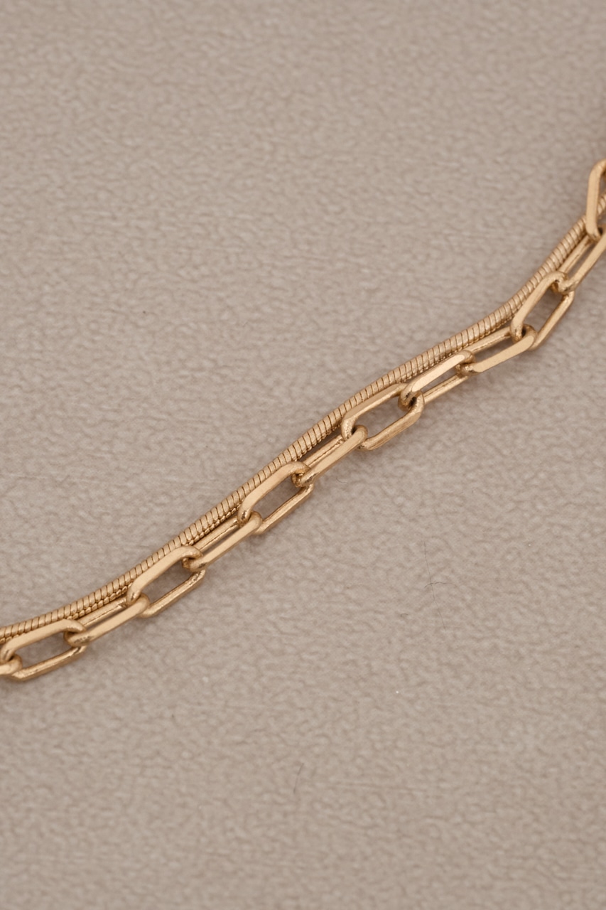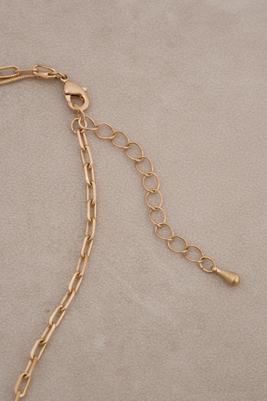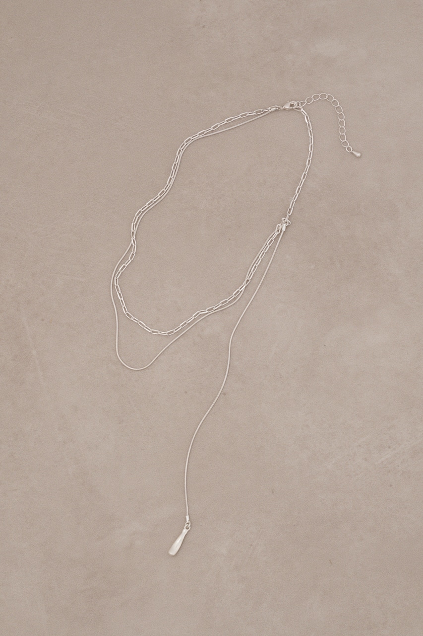 ・2種類のチェーンが組み合わさったレイヤードデザインとアシンメトリーデザインの揺れるドロップモチーフが目を惹くネックレス。