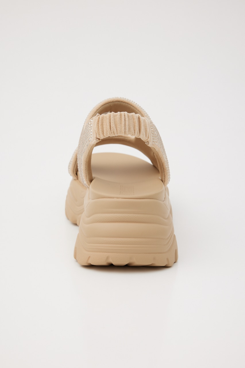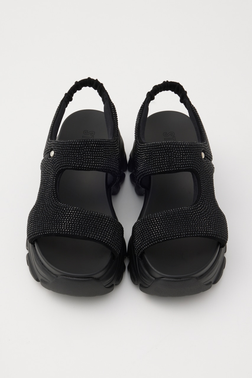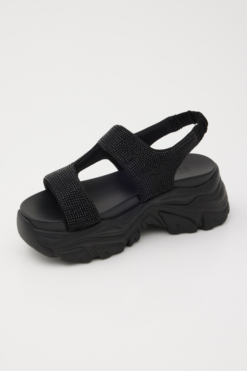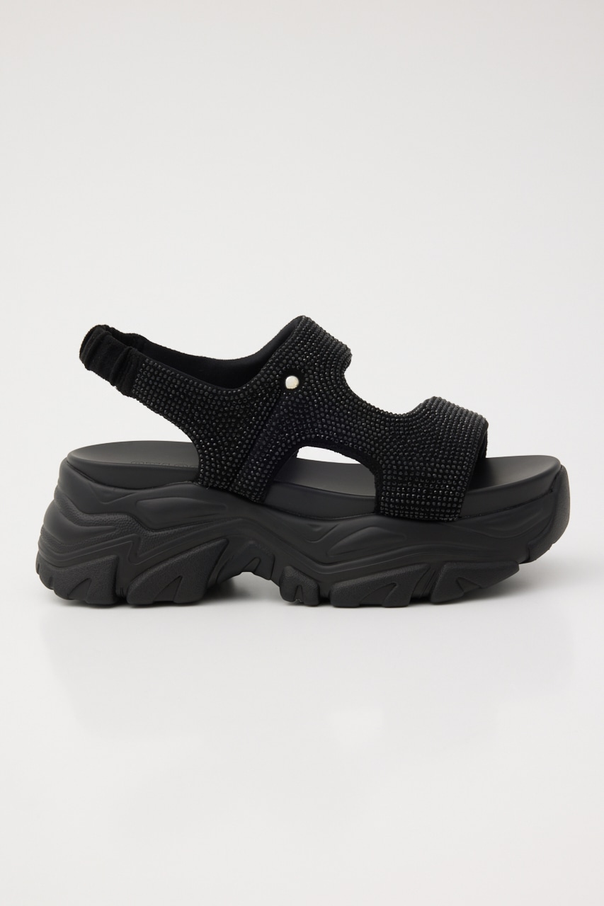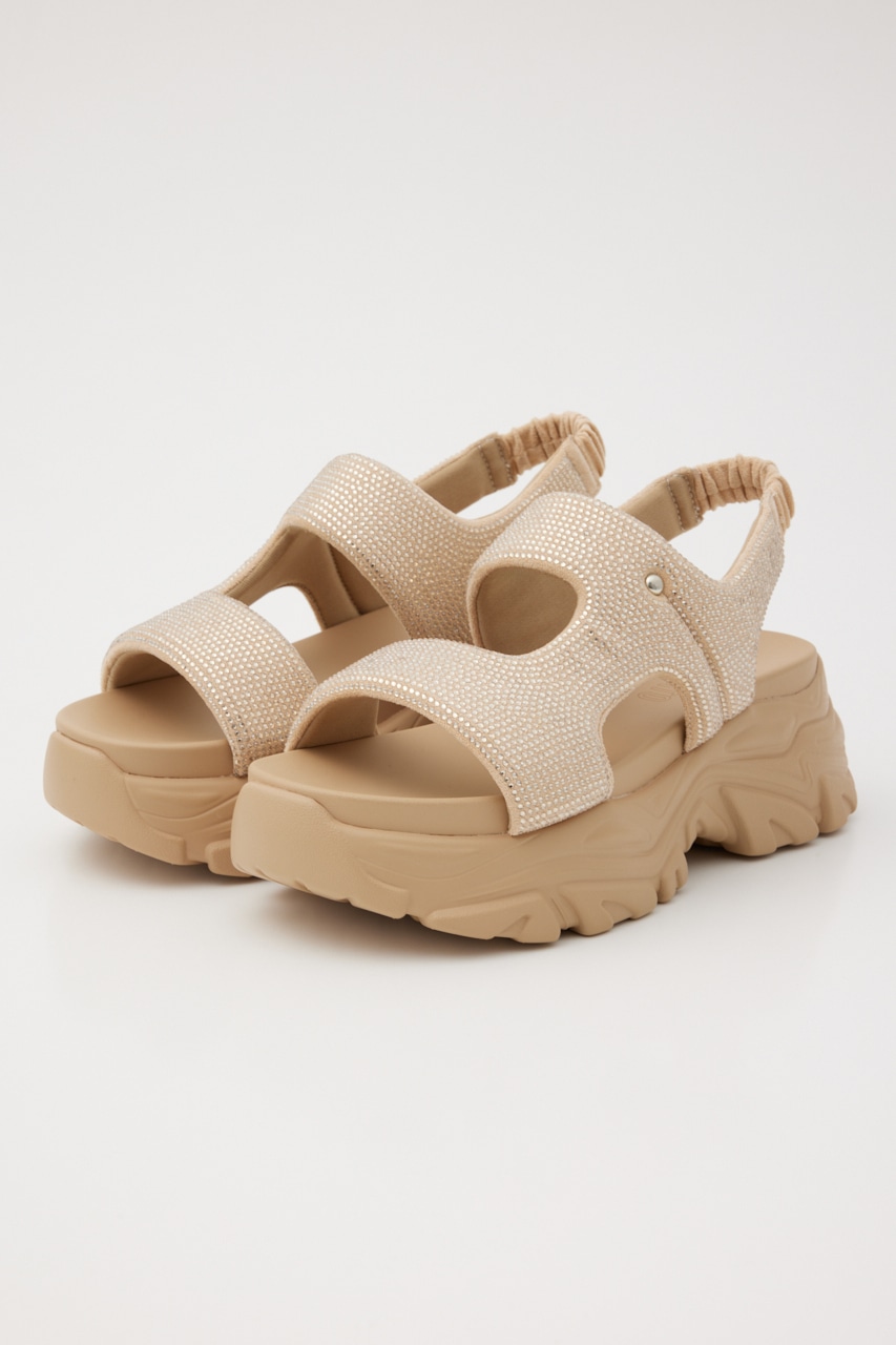 足元主役級な、スポーティー×エレガントが進化されたボリュームソールサンダル。あか抜け感のある洗練された印象に魅せてくれる、コントラストを利かせたすクリスタルトーンのトッピングと重厚感見えながら軽量&弾力があるごつめのソールが今っぽい、女性らしさとモードな雰囲気を併せ持った今季おすすめのサンダルです。