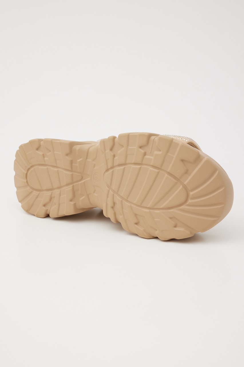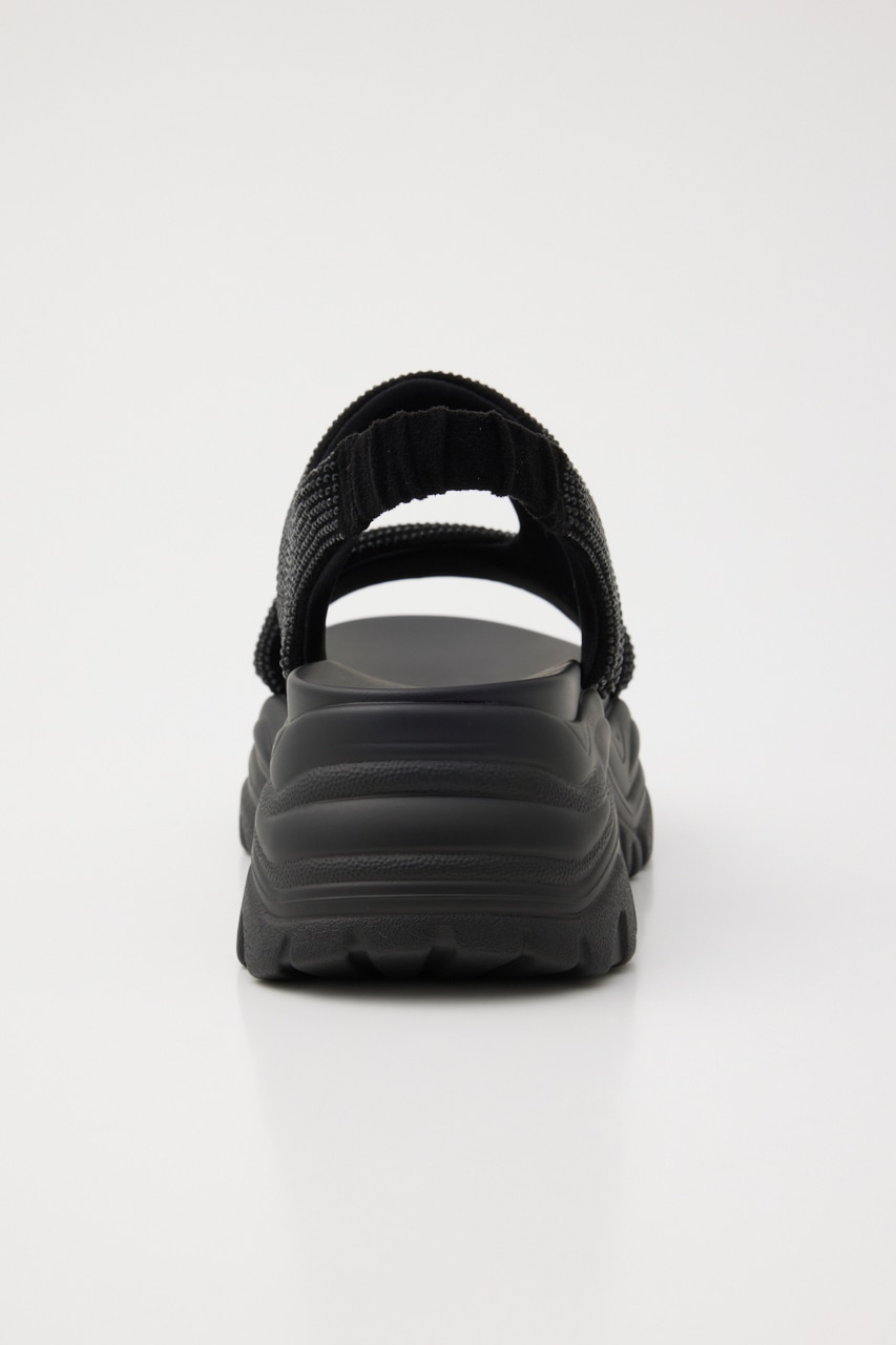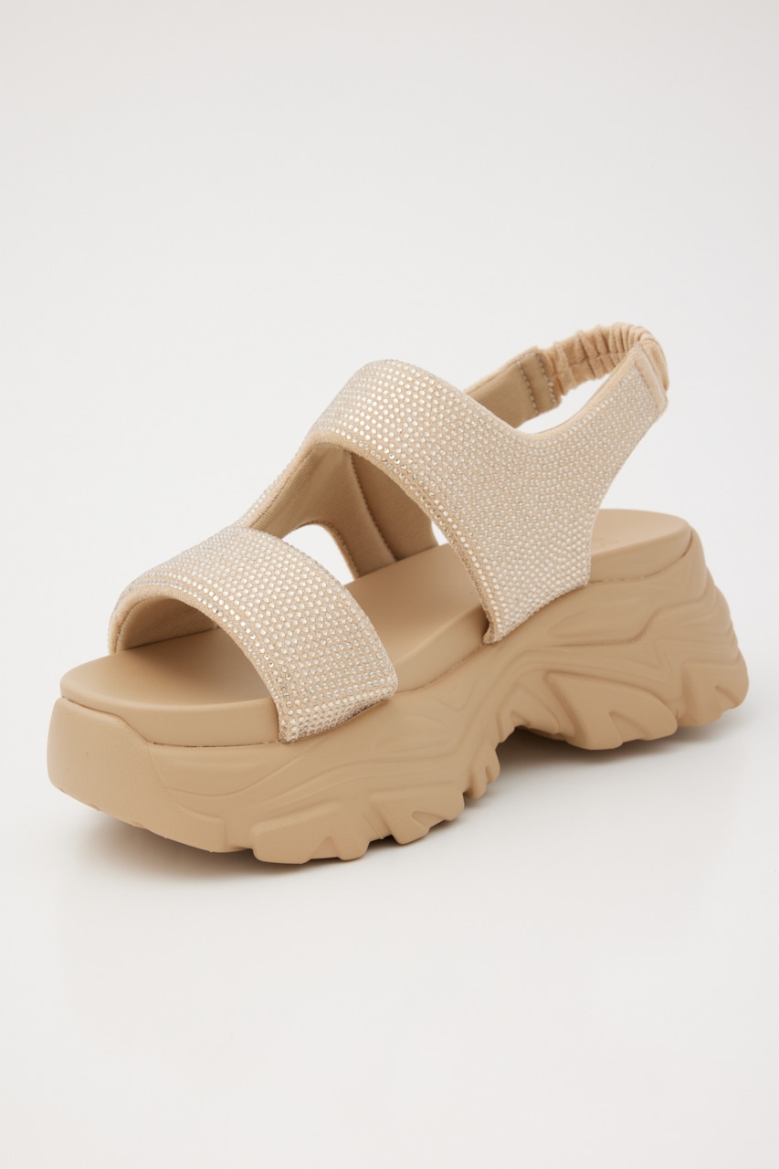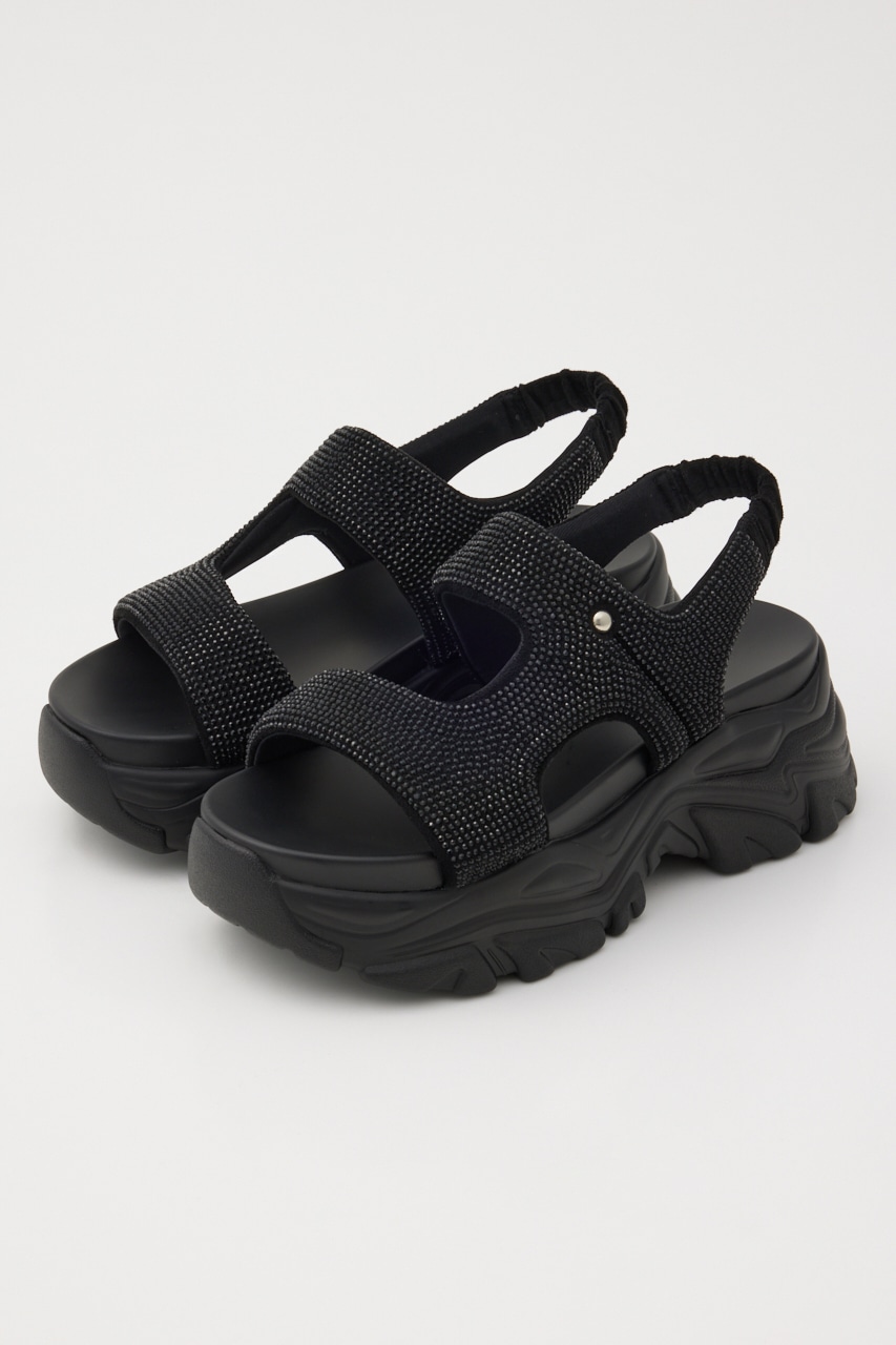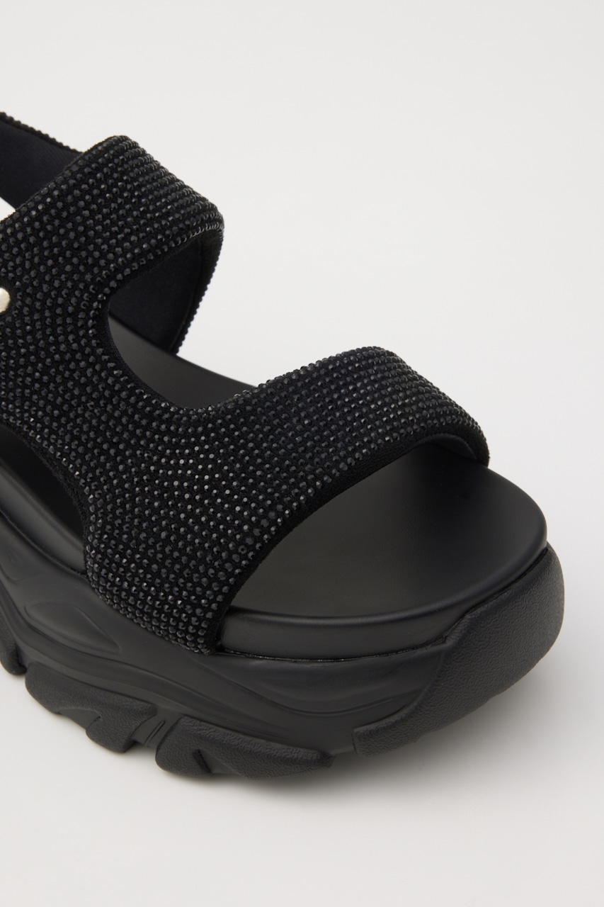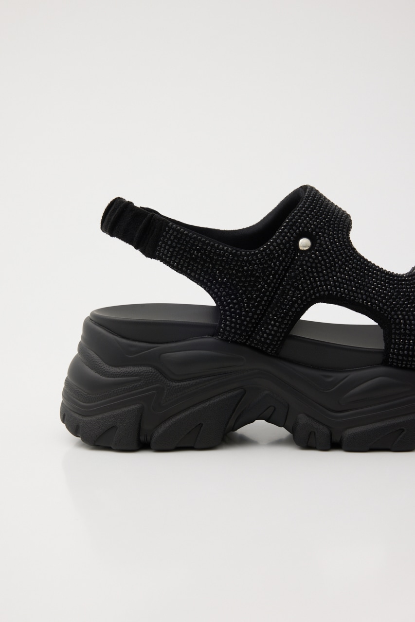 足元主役級な、スポーティー×エレガントが進化されたボリュームソールサンダル。あか抜け感のある洗練された印象に魅せてくれる、コントラストを利かせたすクリスタルトーンのトッピングと重厚感見えながら軽量&弾力があるごつめのソールが今っぽい、女性らしさとモードな雰囲気を併せ持った今季おすすめのサンダルです。
