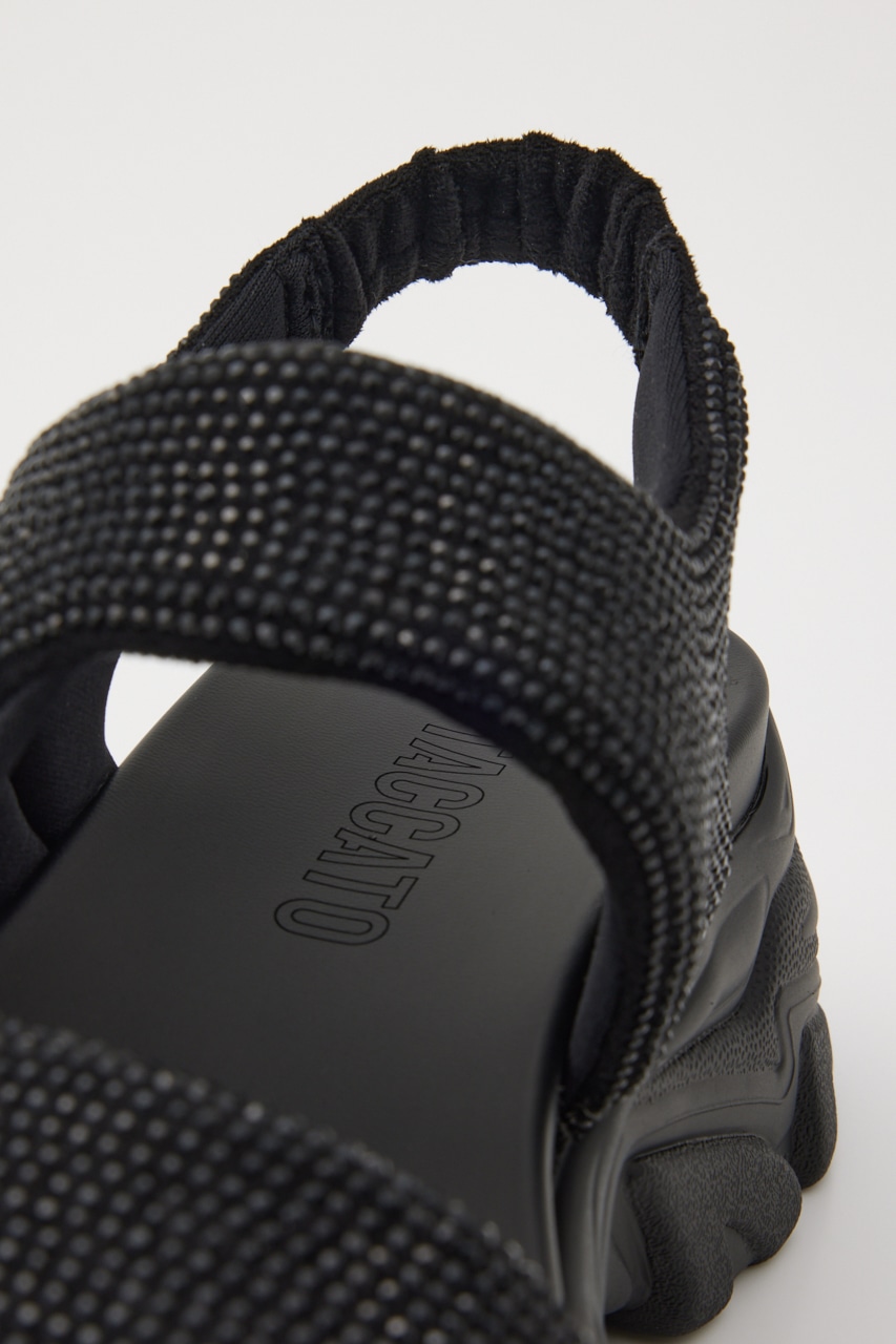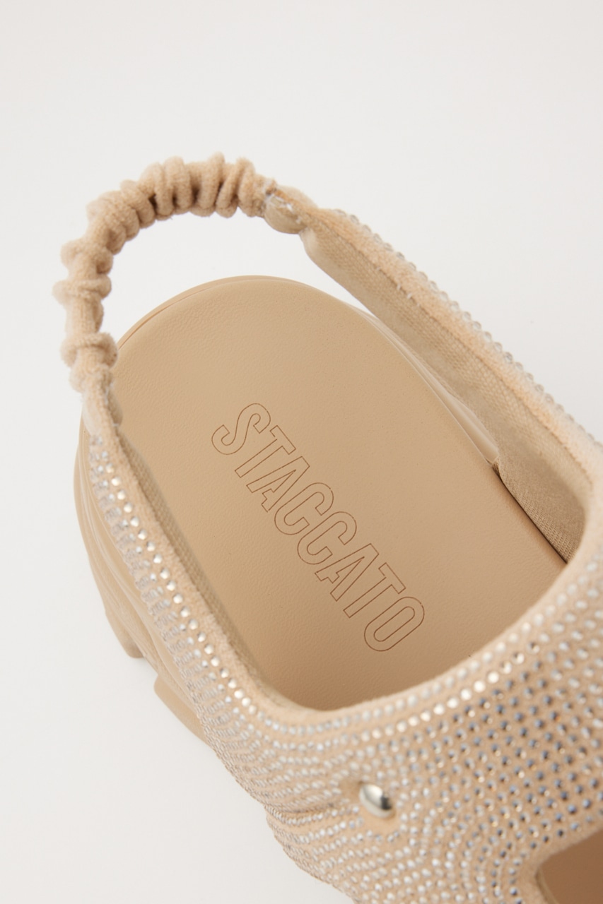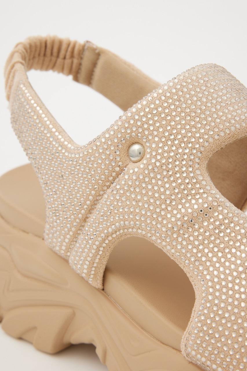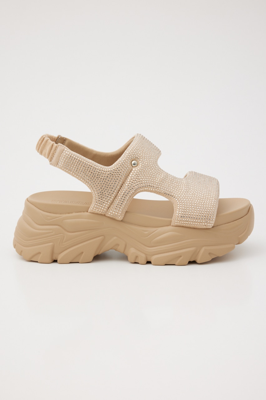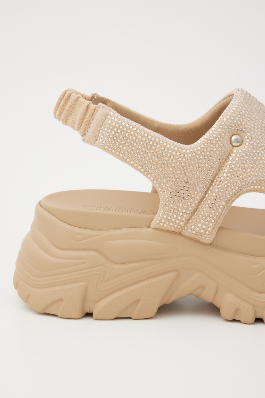足元主役級な、スポーティー×エレガントが進化されたボリュームソールサンダル。あか抜け感のある洗練された印象に魅せてくれる、コントラストを利かせたすクリスタルトーンのトッピングと重厚感見えながら軽量&弾力があるごつめのソールが今っぽい、女性らしさとモードな雰囲気を併せ持った今季おすすめのサンダルです。