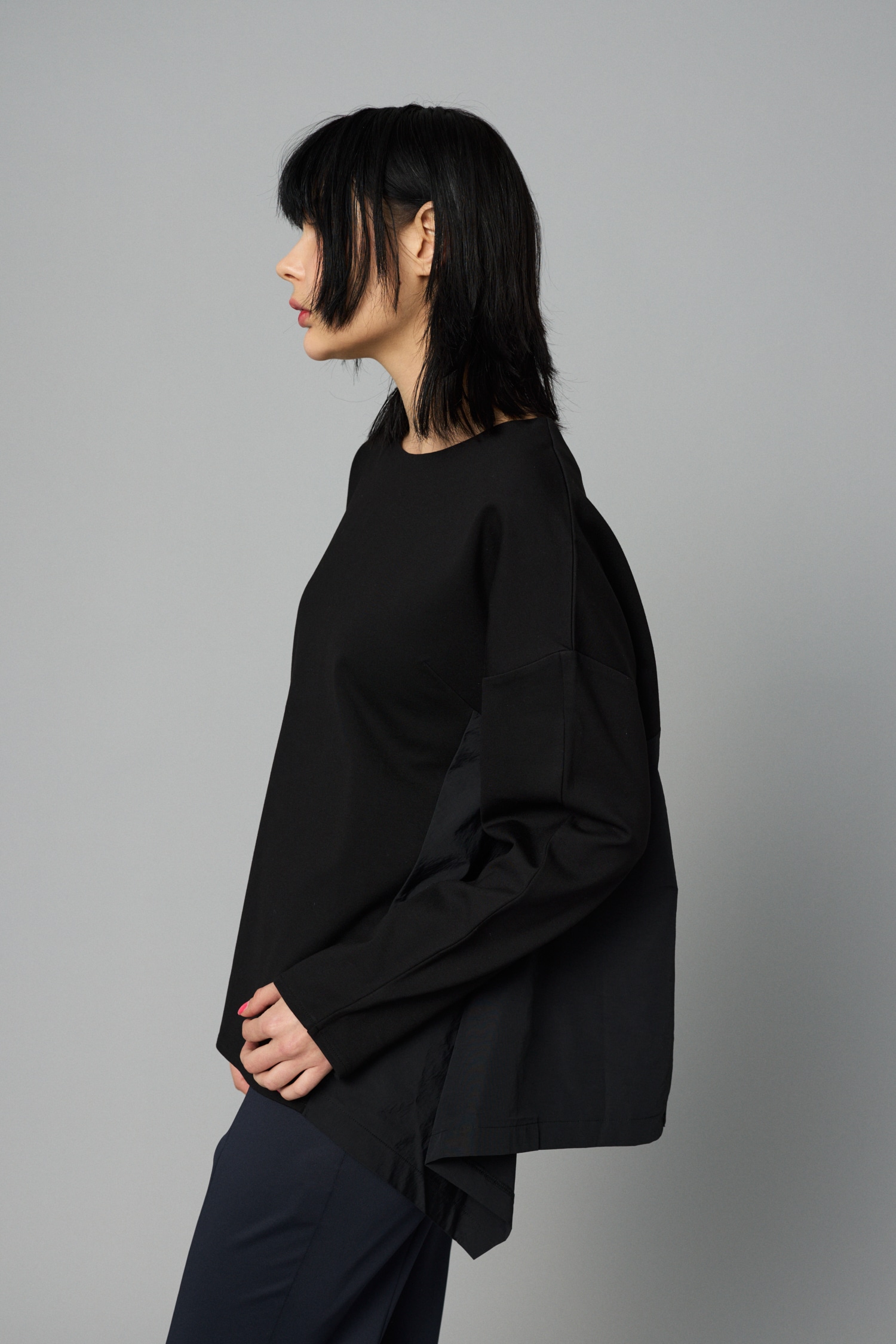ポンチと布帛素材のドッキングトップスで、体型カバーできるフレアーシルエットに仕上げました。