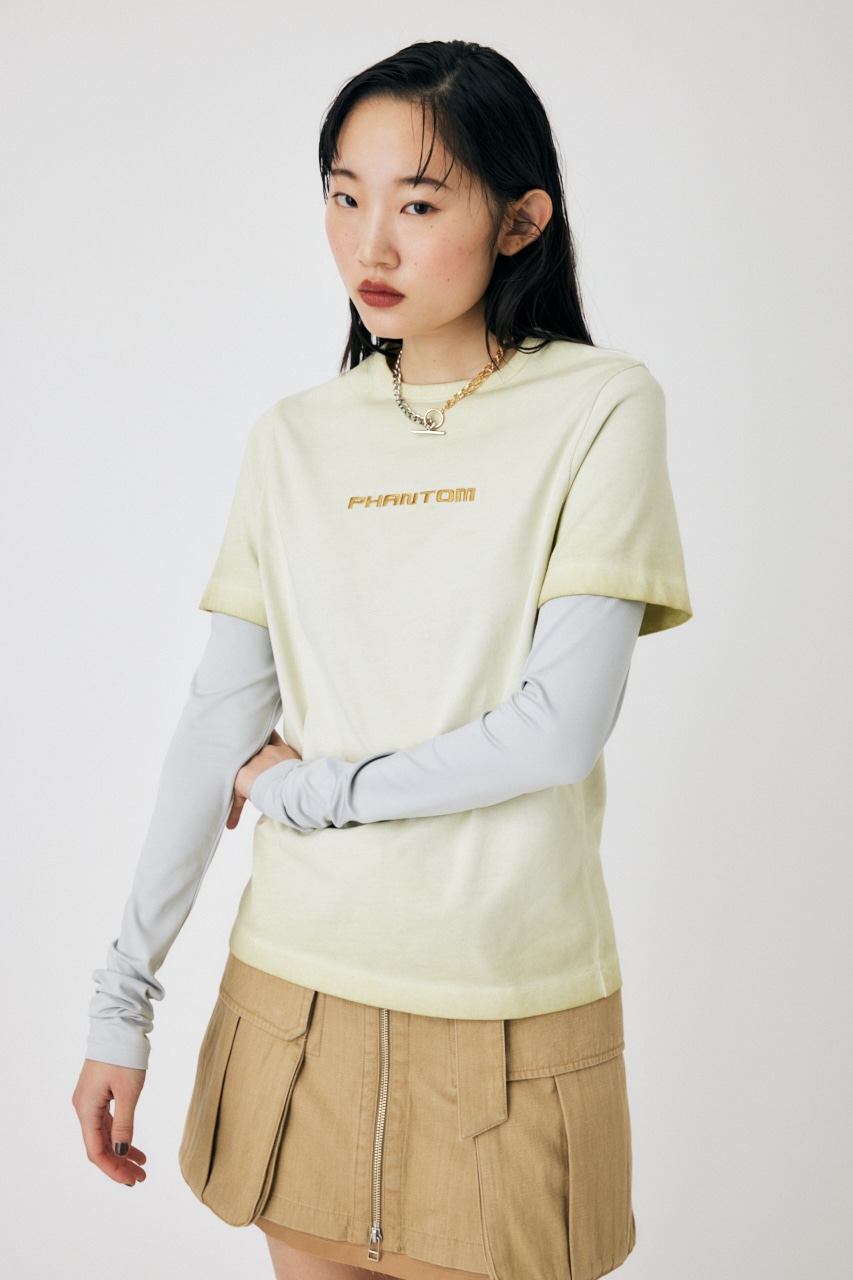 加工入りのTシャツに異素材の光沢あるロンTを組み合わせることで新鮮な見え方に。同色刺繍もポイントです。