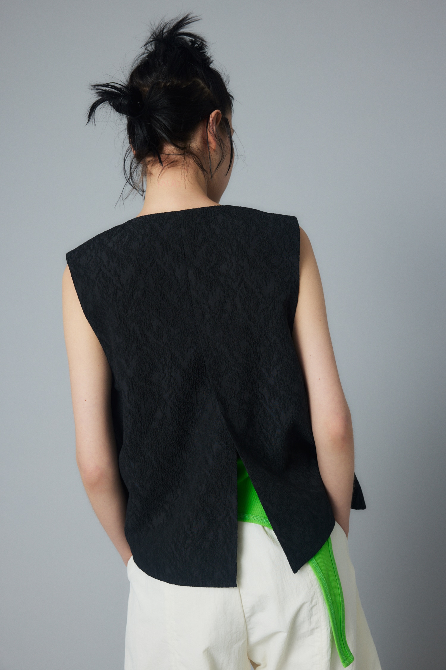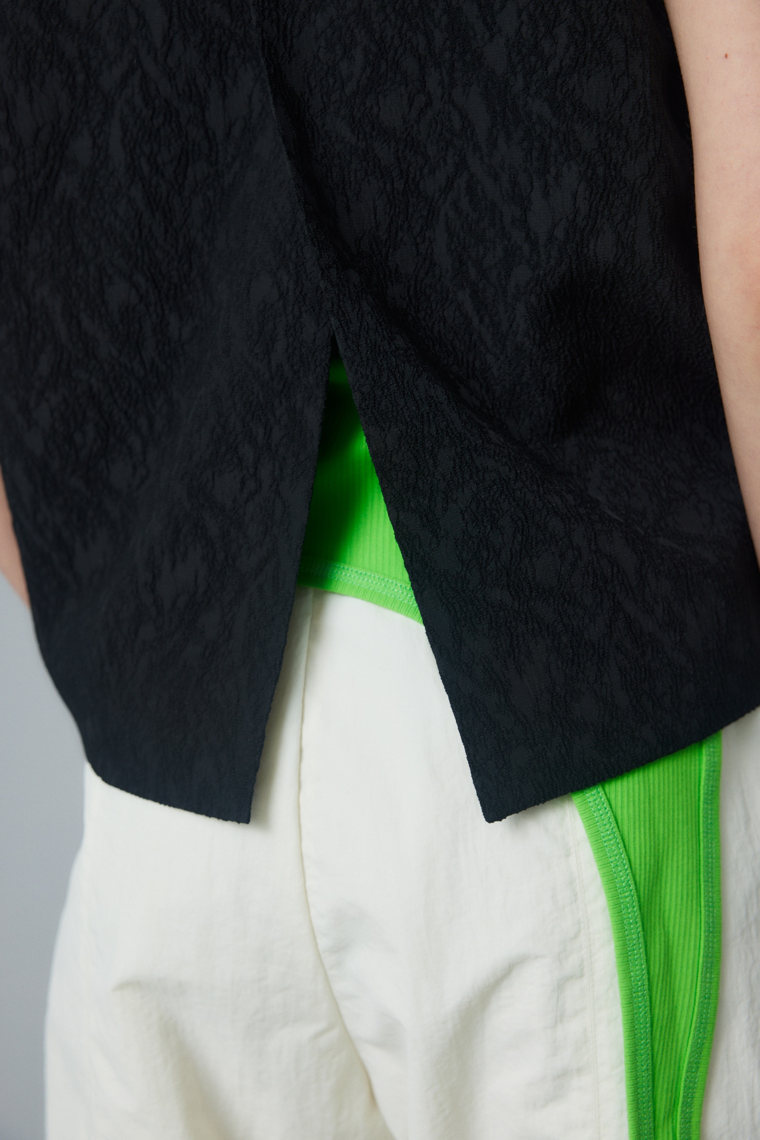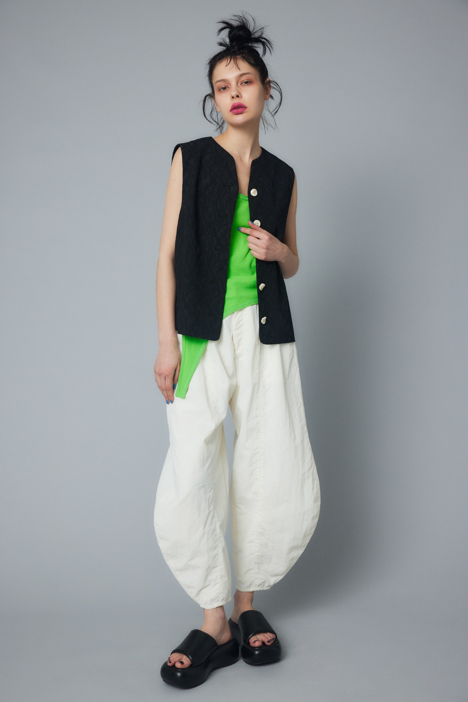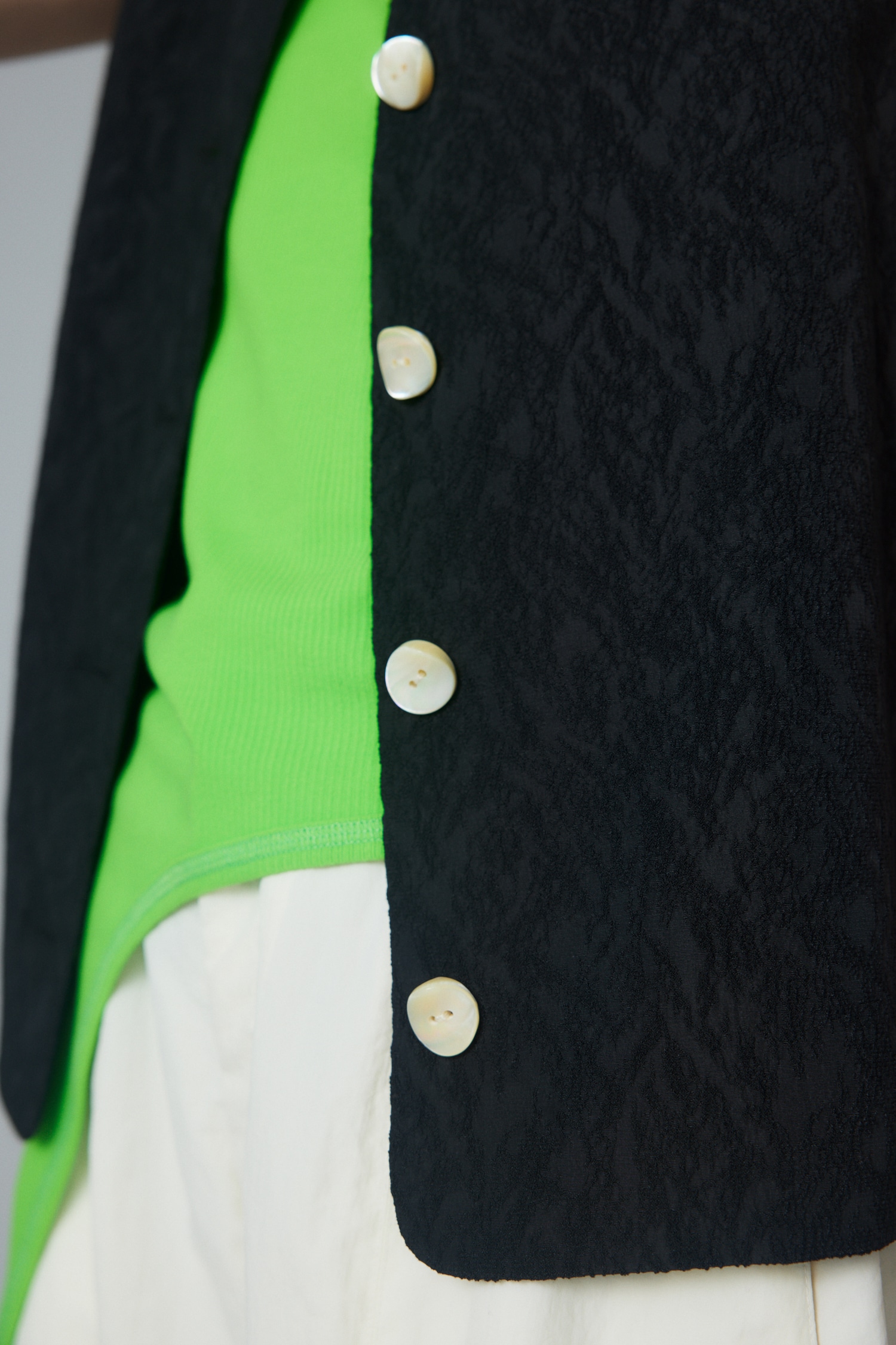 立体的なウネと適度なハリ感が特徴のストレッチジャガードを使用しており、古着にありそうなボタン使いを意識してビンテージライクな印象を持たせました。