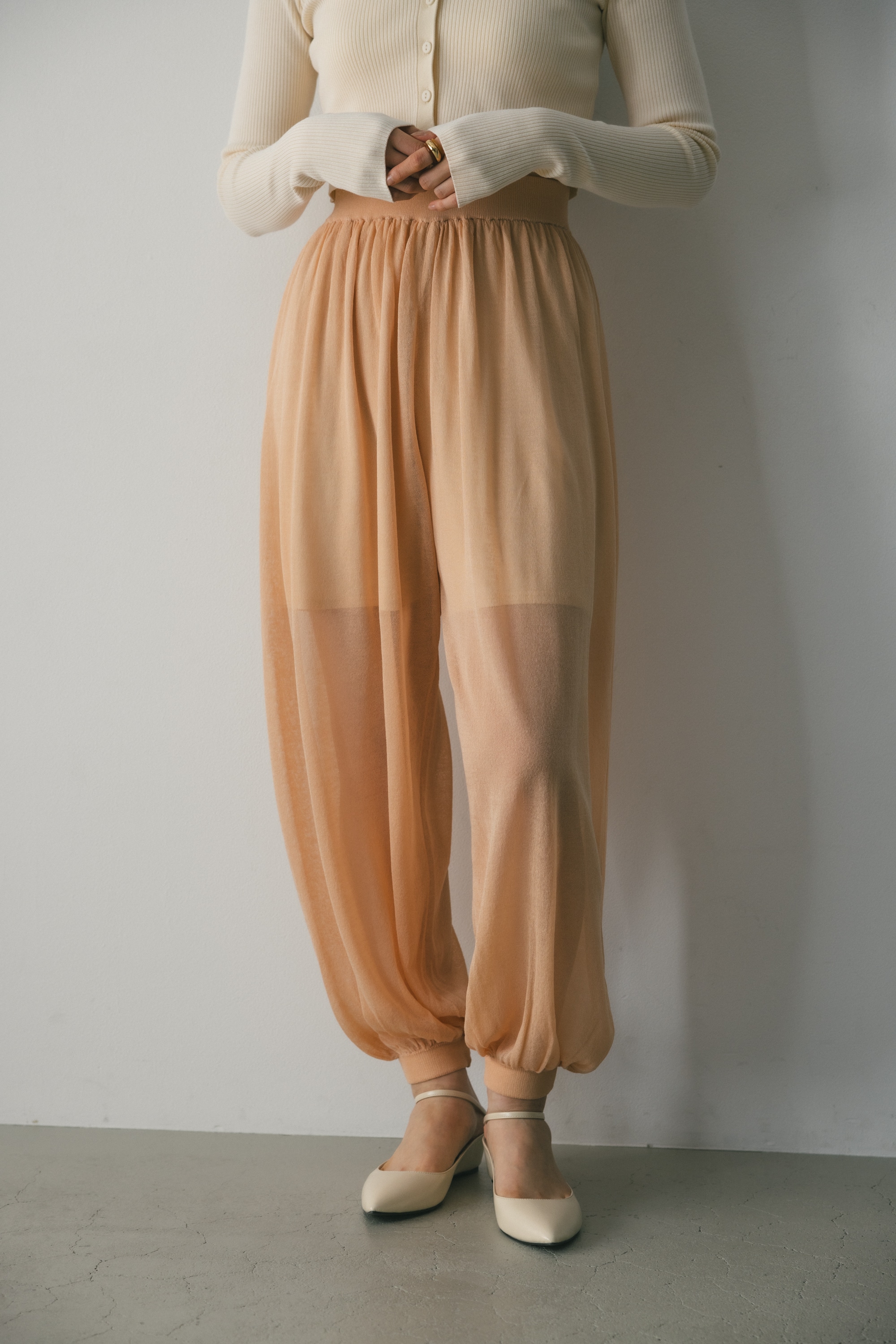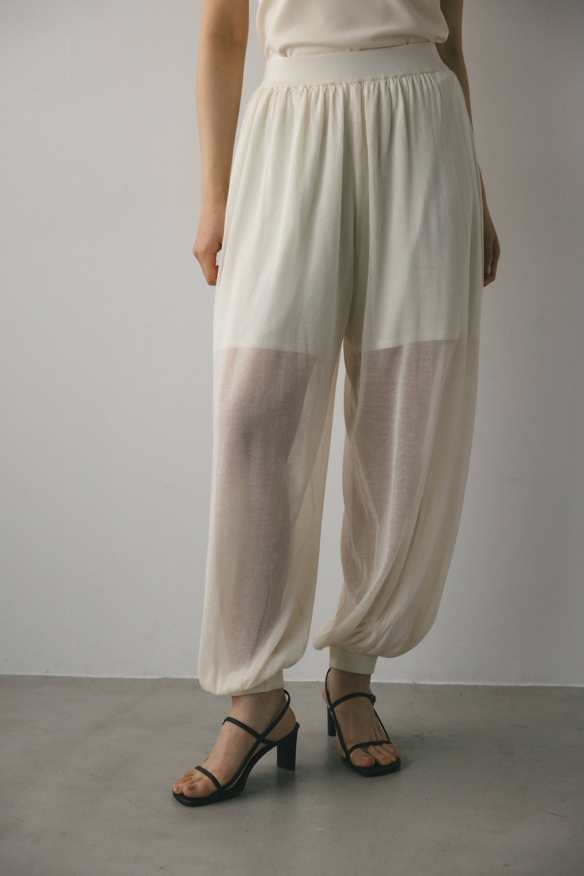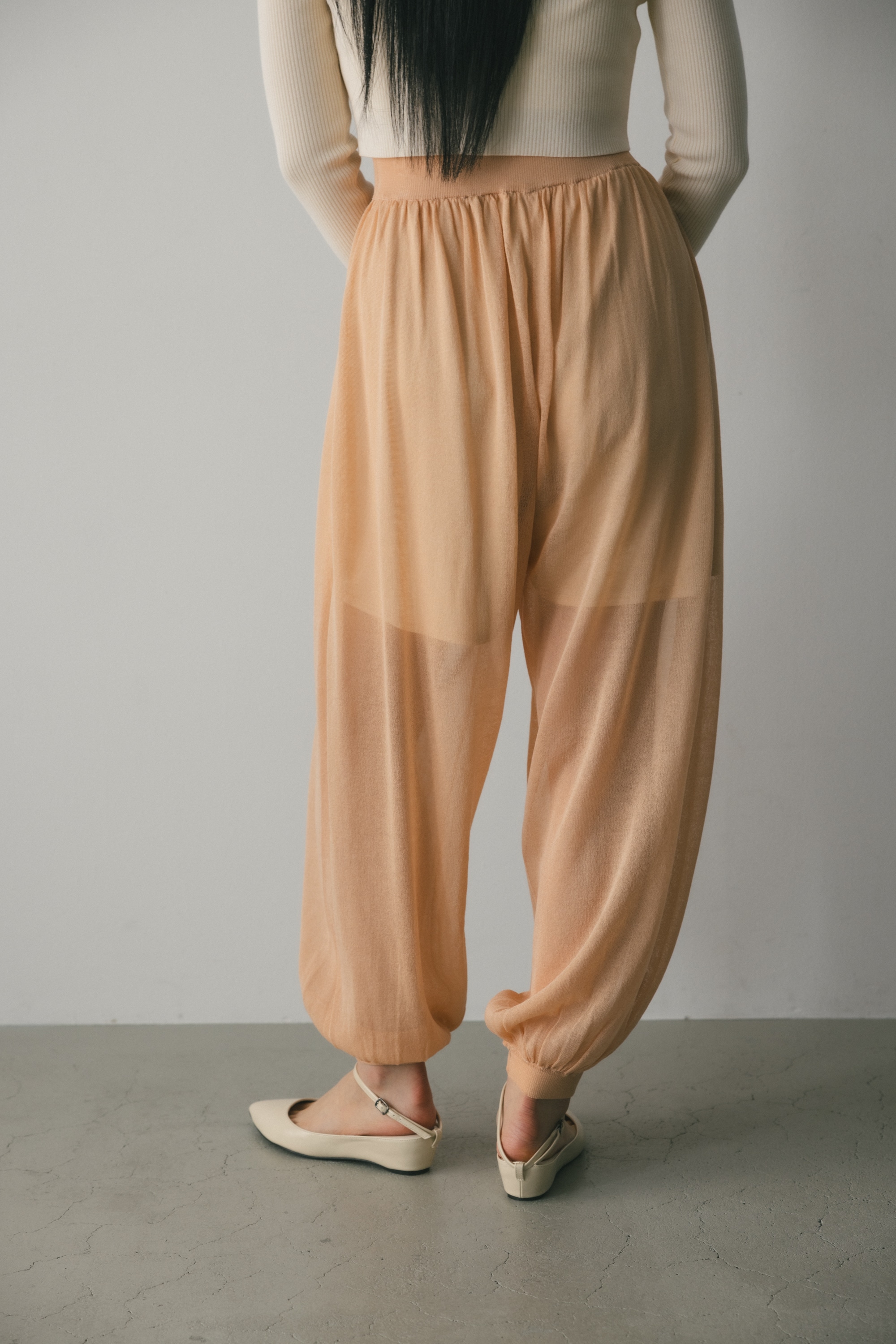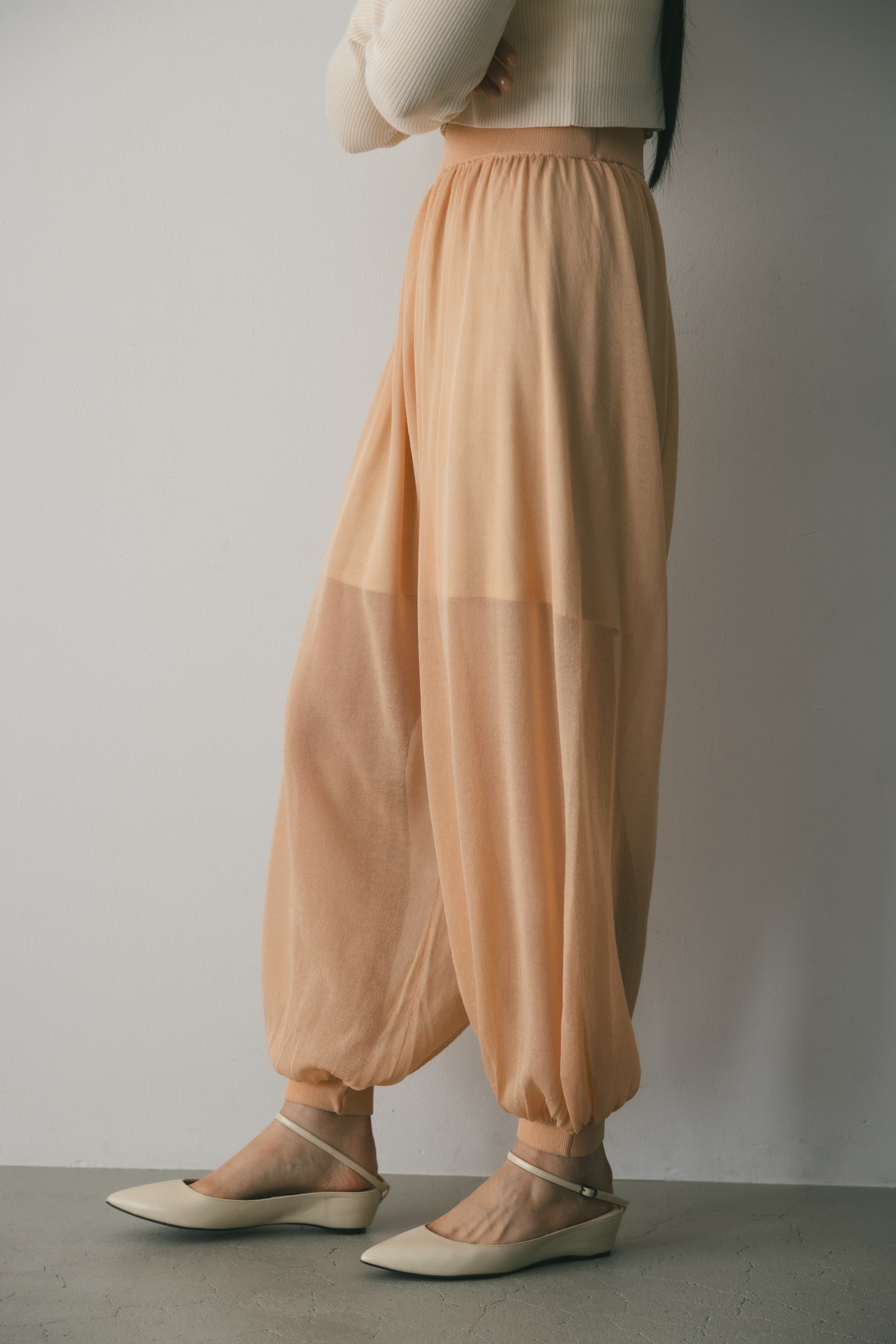 ウエストと裾にたっぷりとギャザーを入れたバルーンシルエットが可愛いシアーニットパンツ。