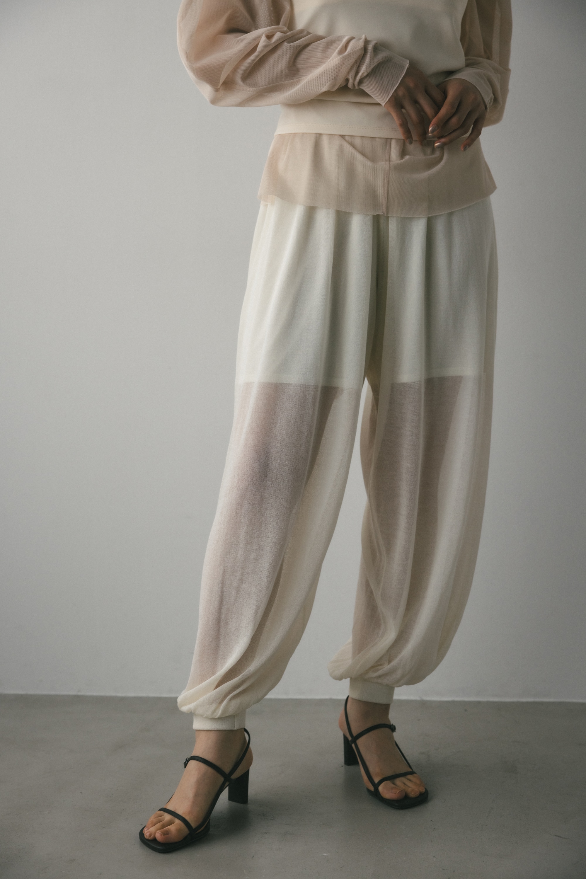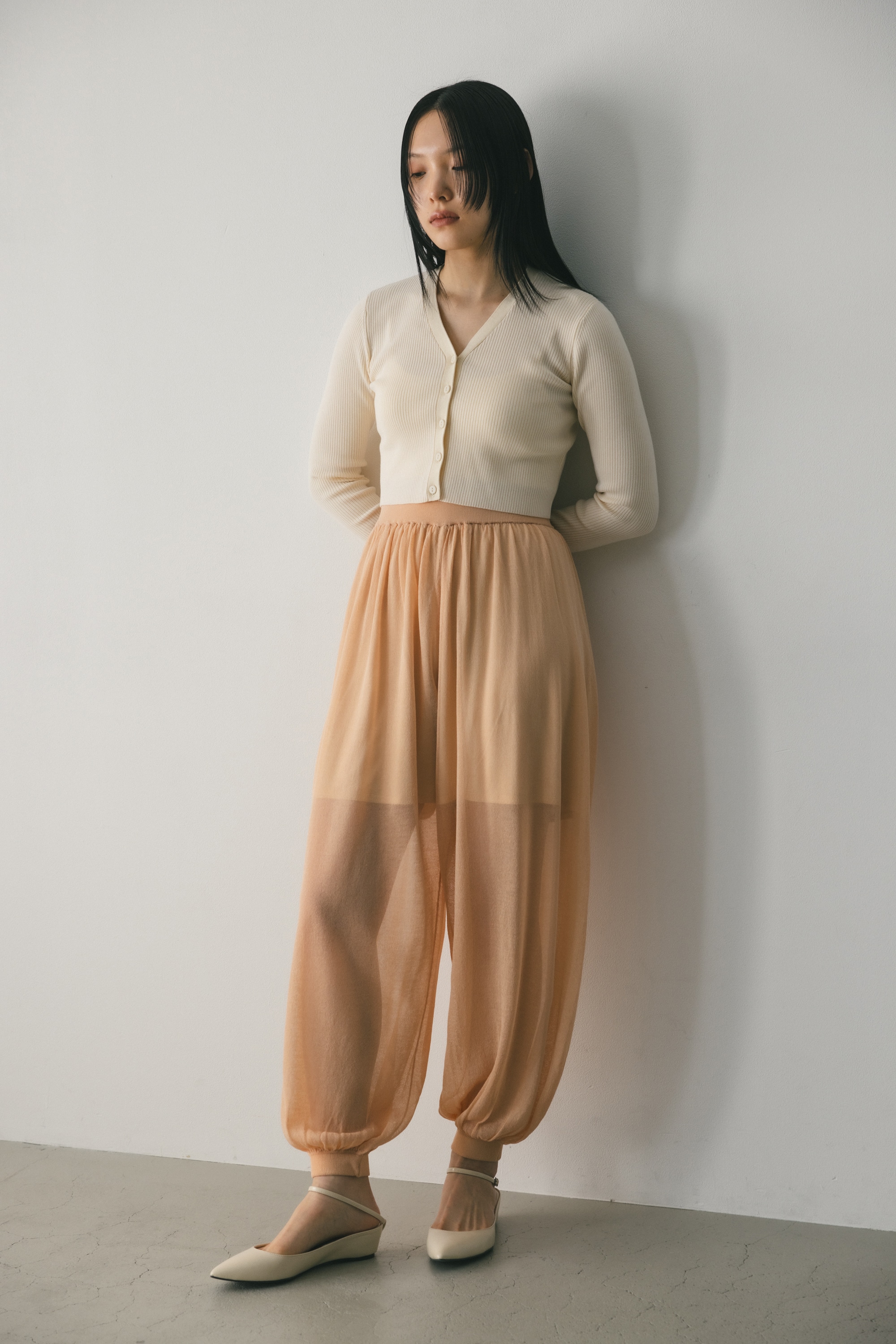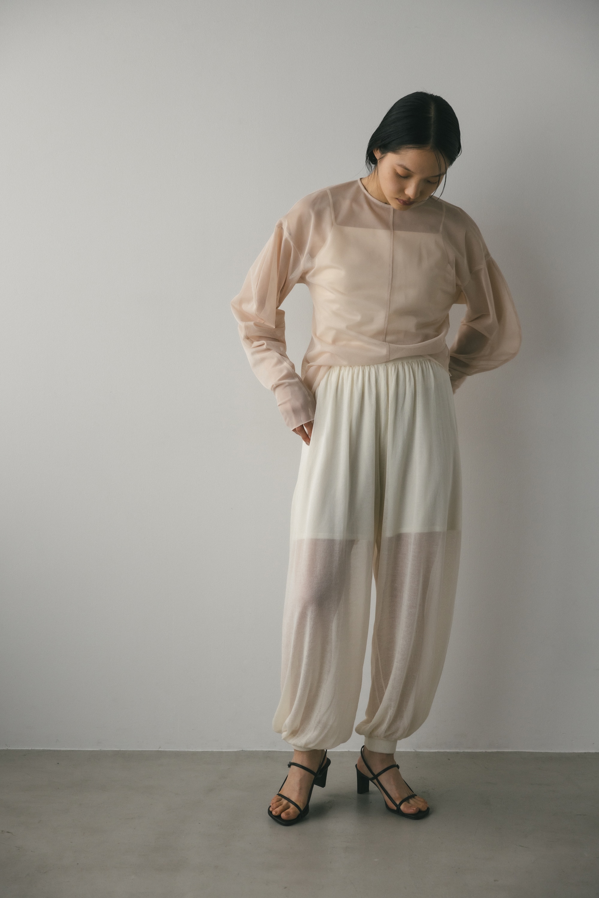 ウエストと裾にたっぷりとギャザーを入れたバルーンシルエットが可愛いシアーニットパンツ。