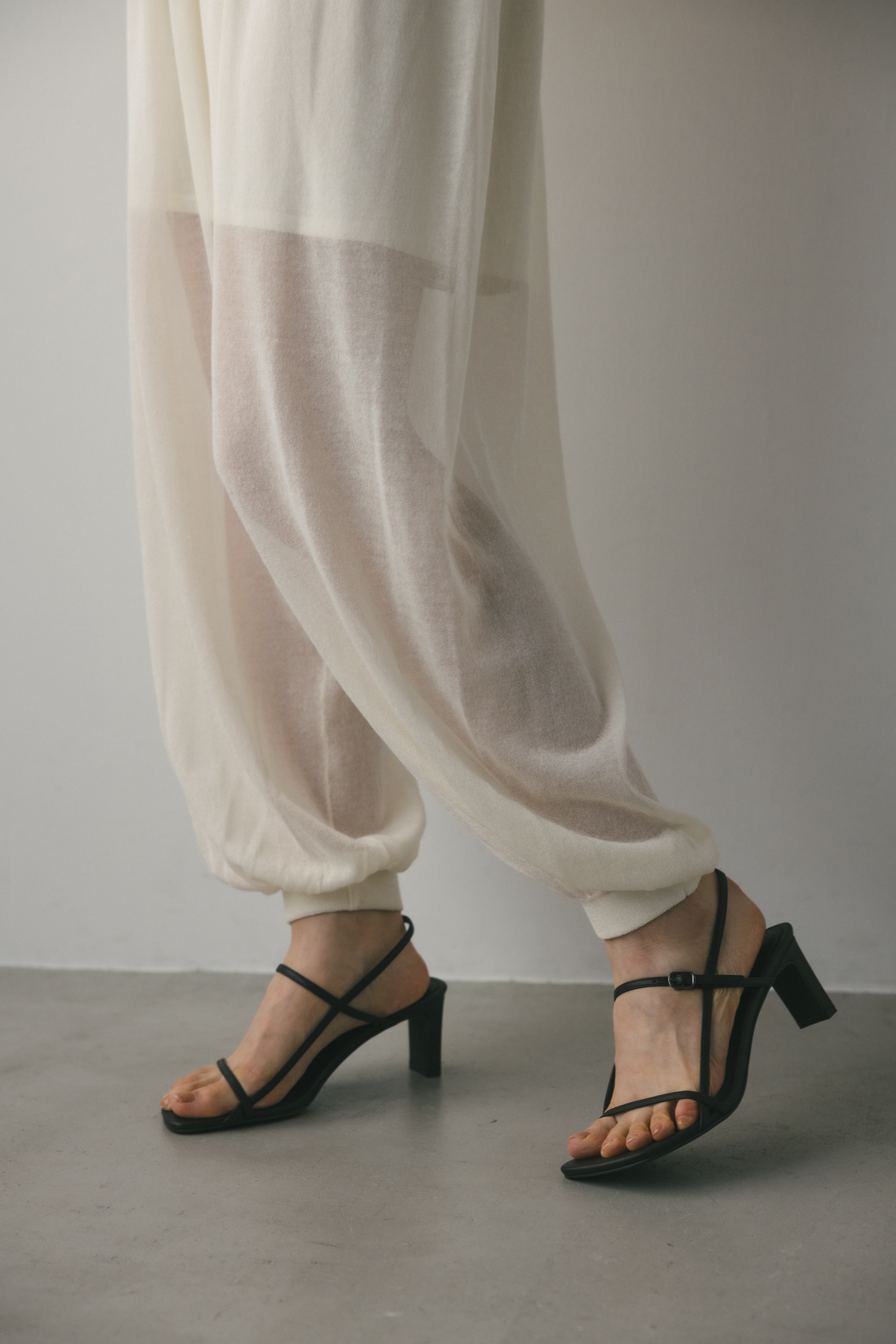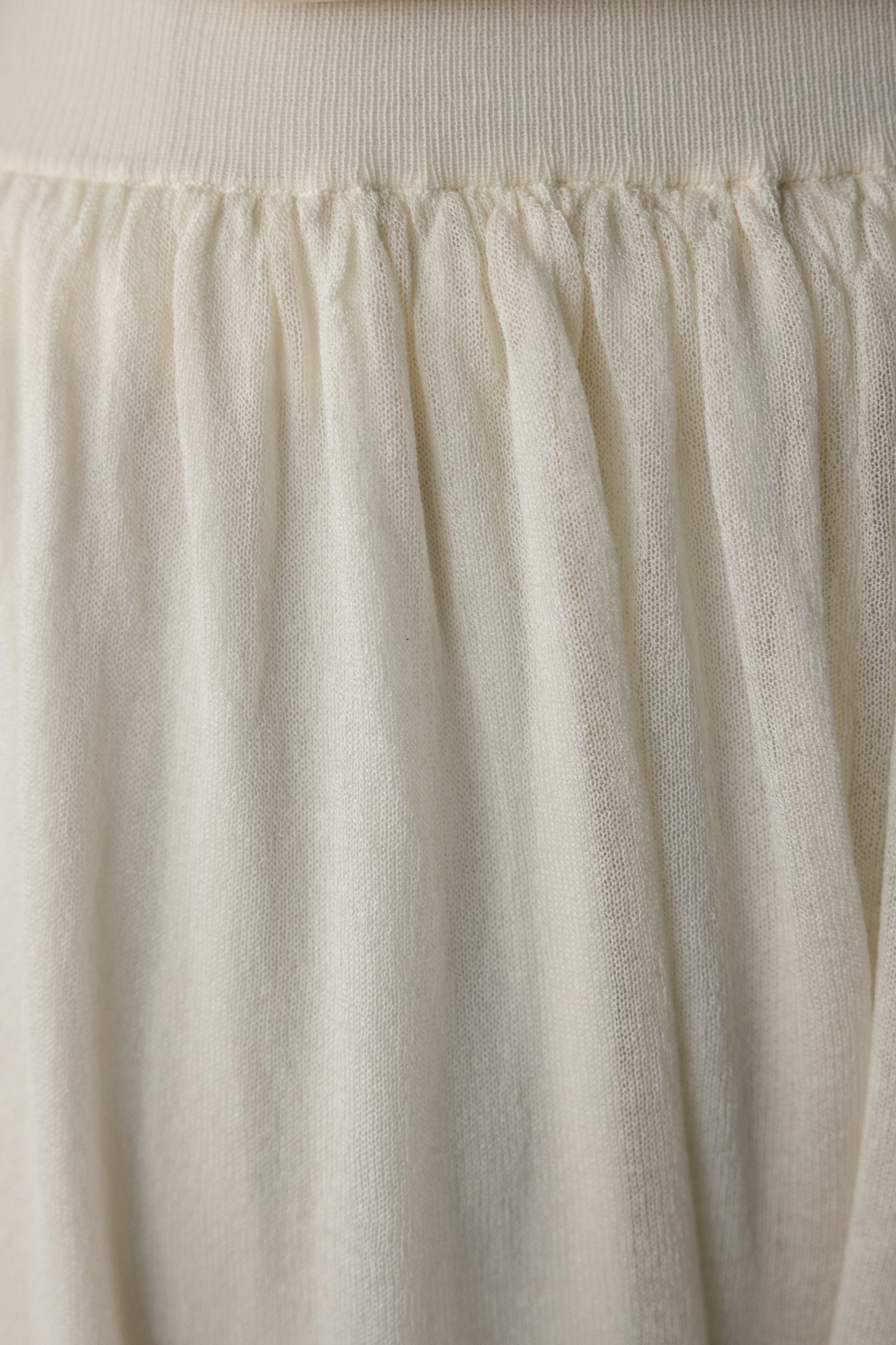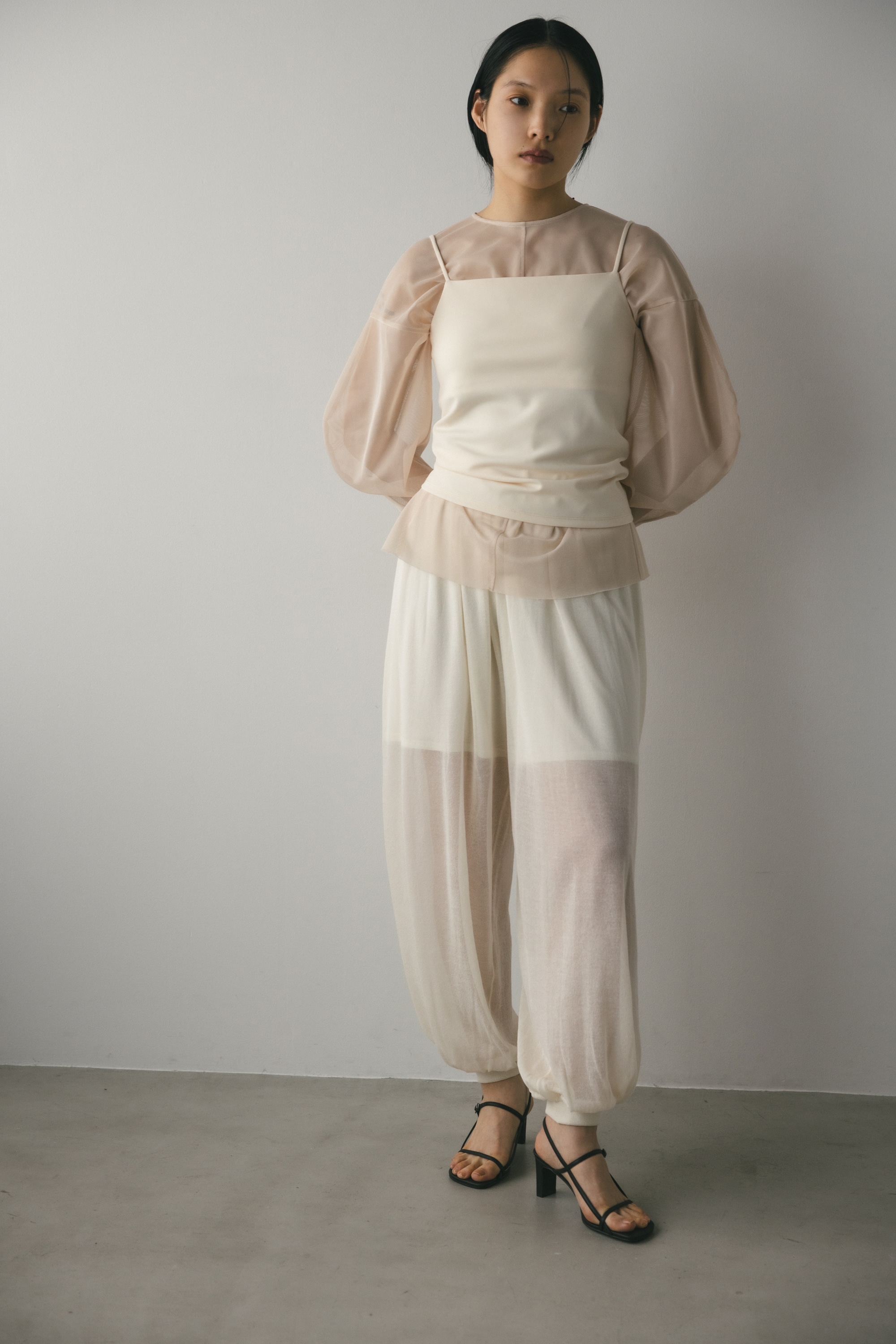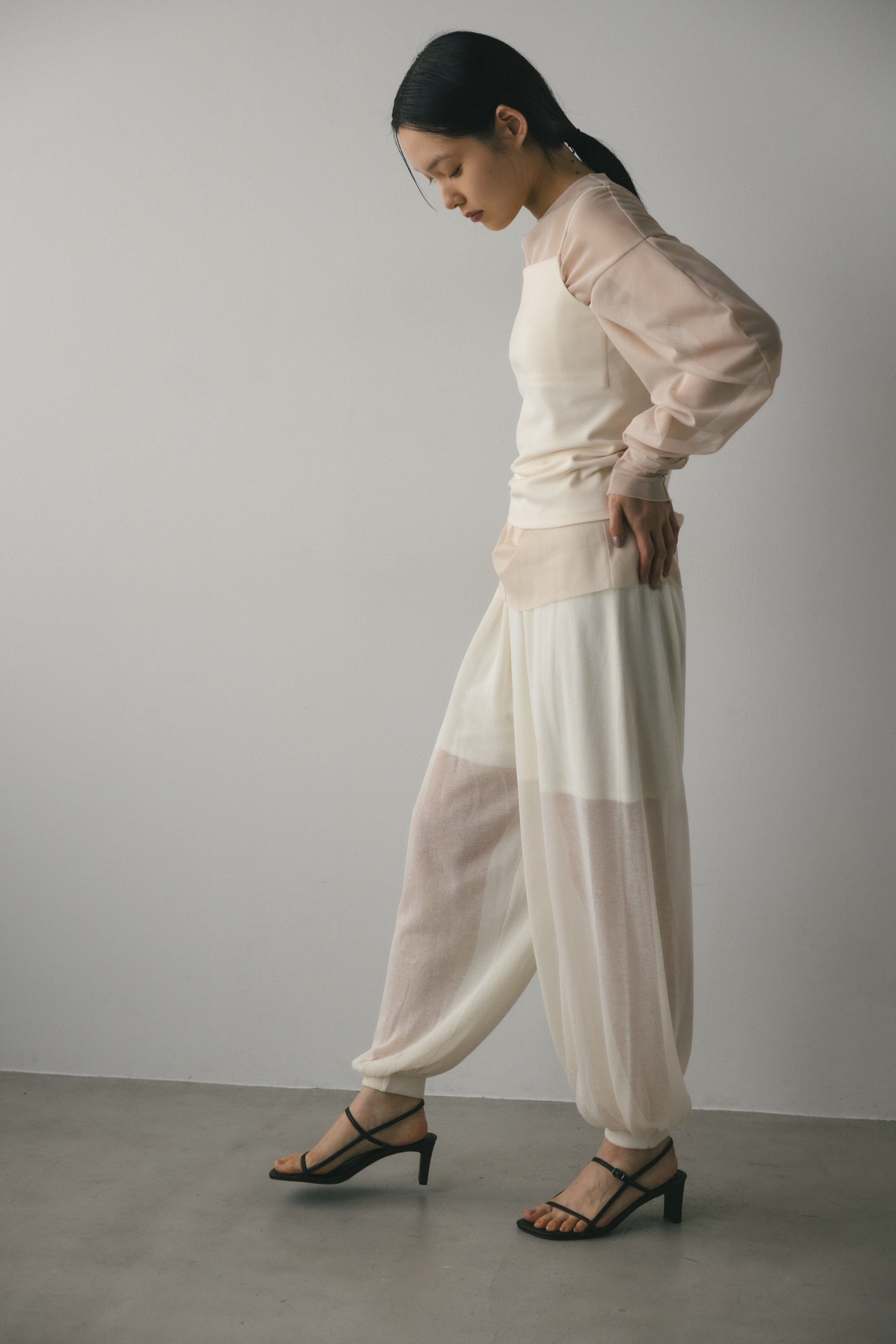 ウエストと裾にたっぷりとギャザーを入れたバルーンシルエットが可愛いシアーニットパンツ。