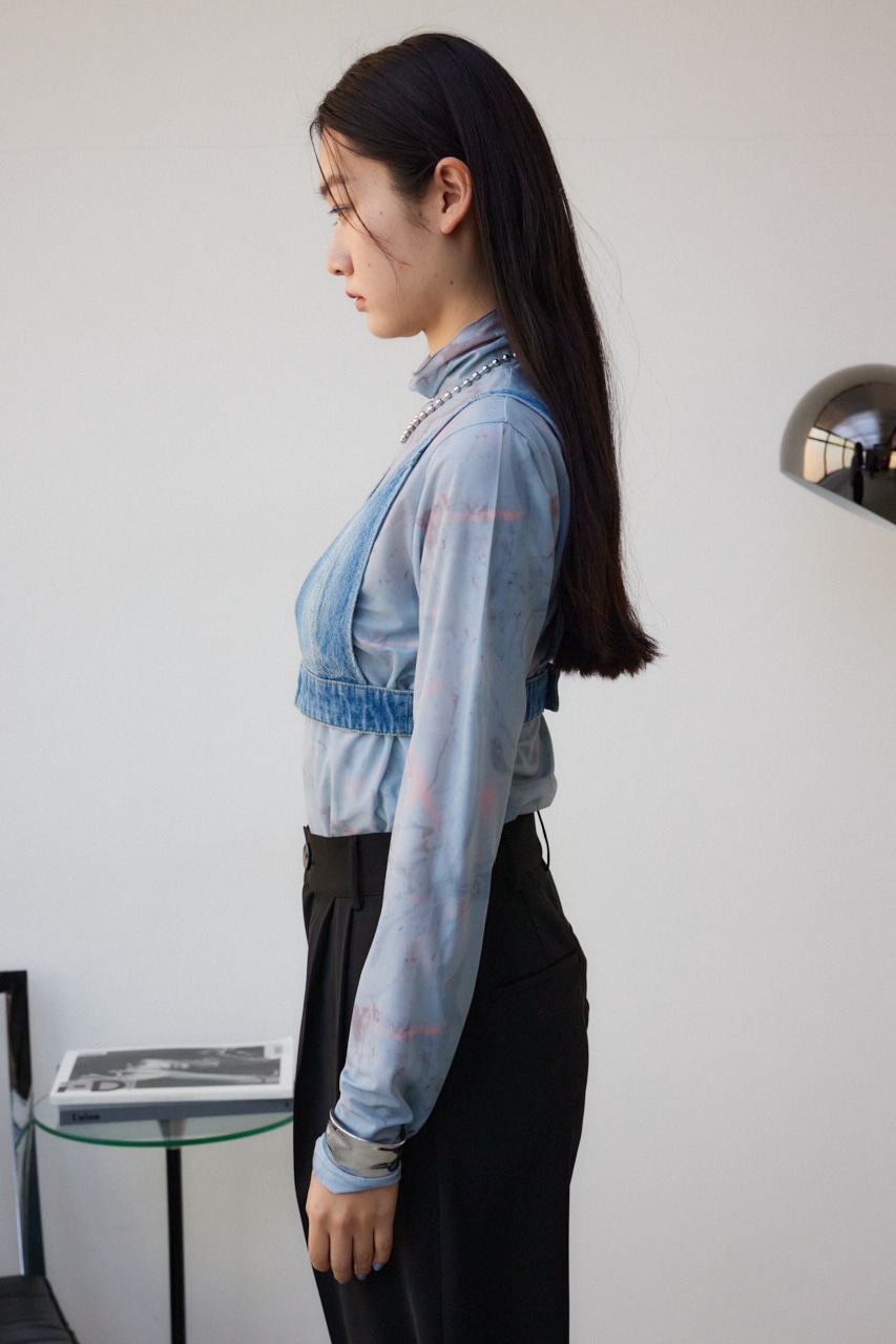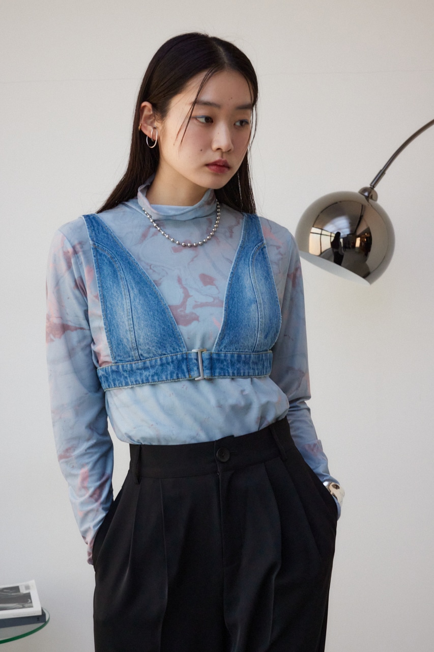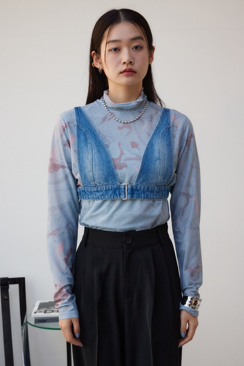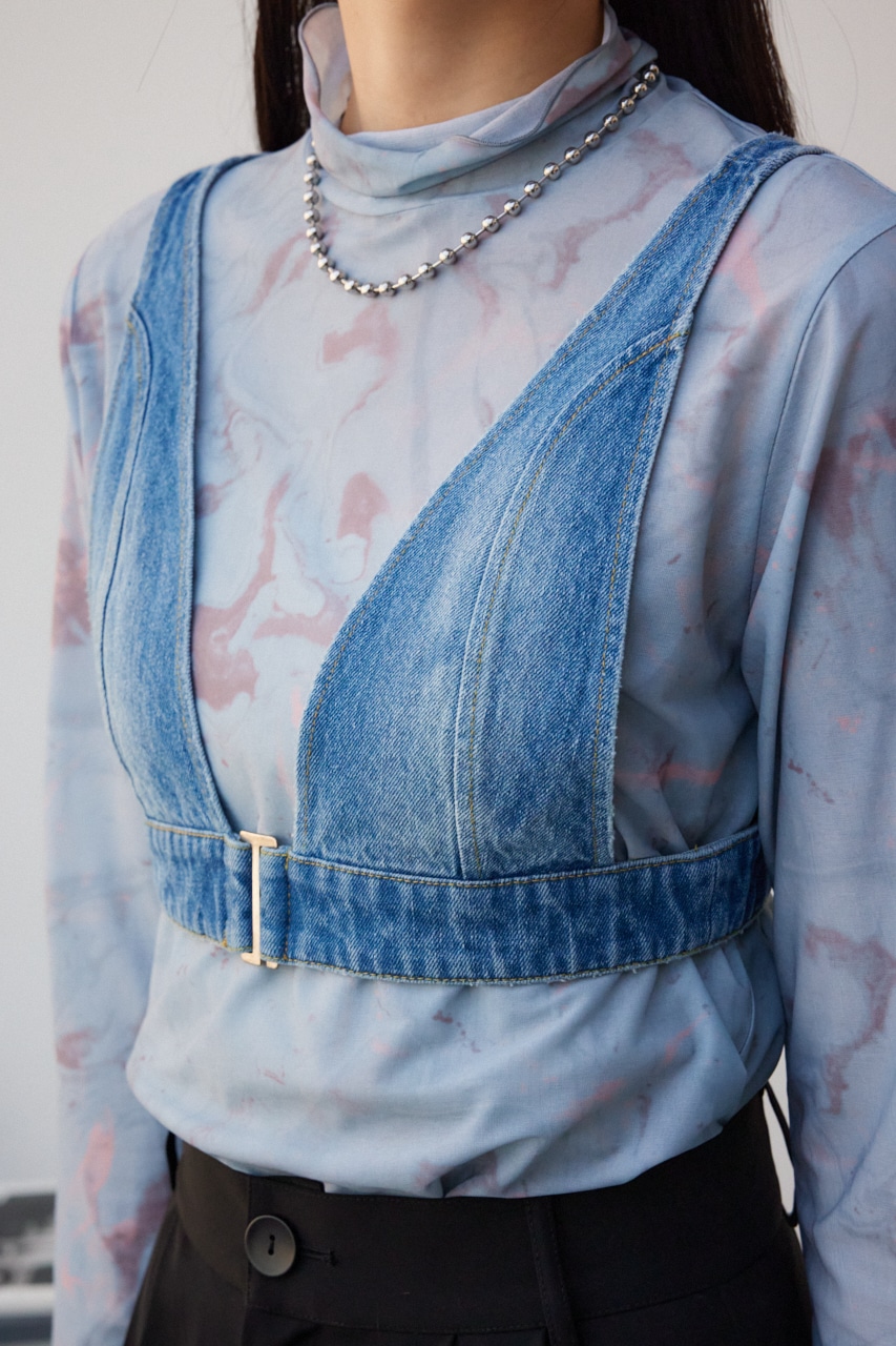 ・程よい生地に肉感があるデニムを使用し、加工を施すことでビンテージ感を演出したデニムビスチェです。