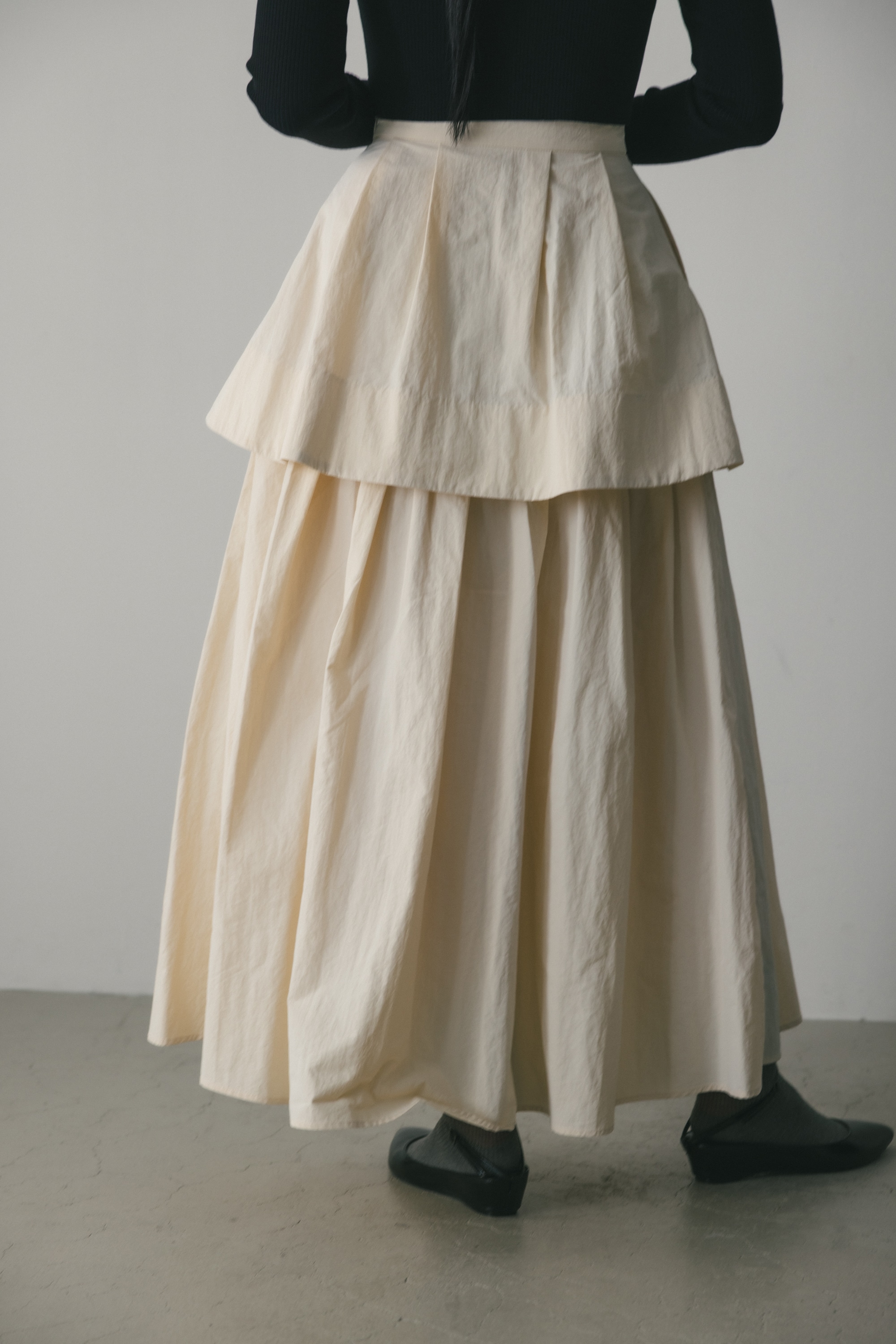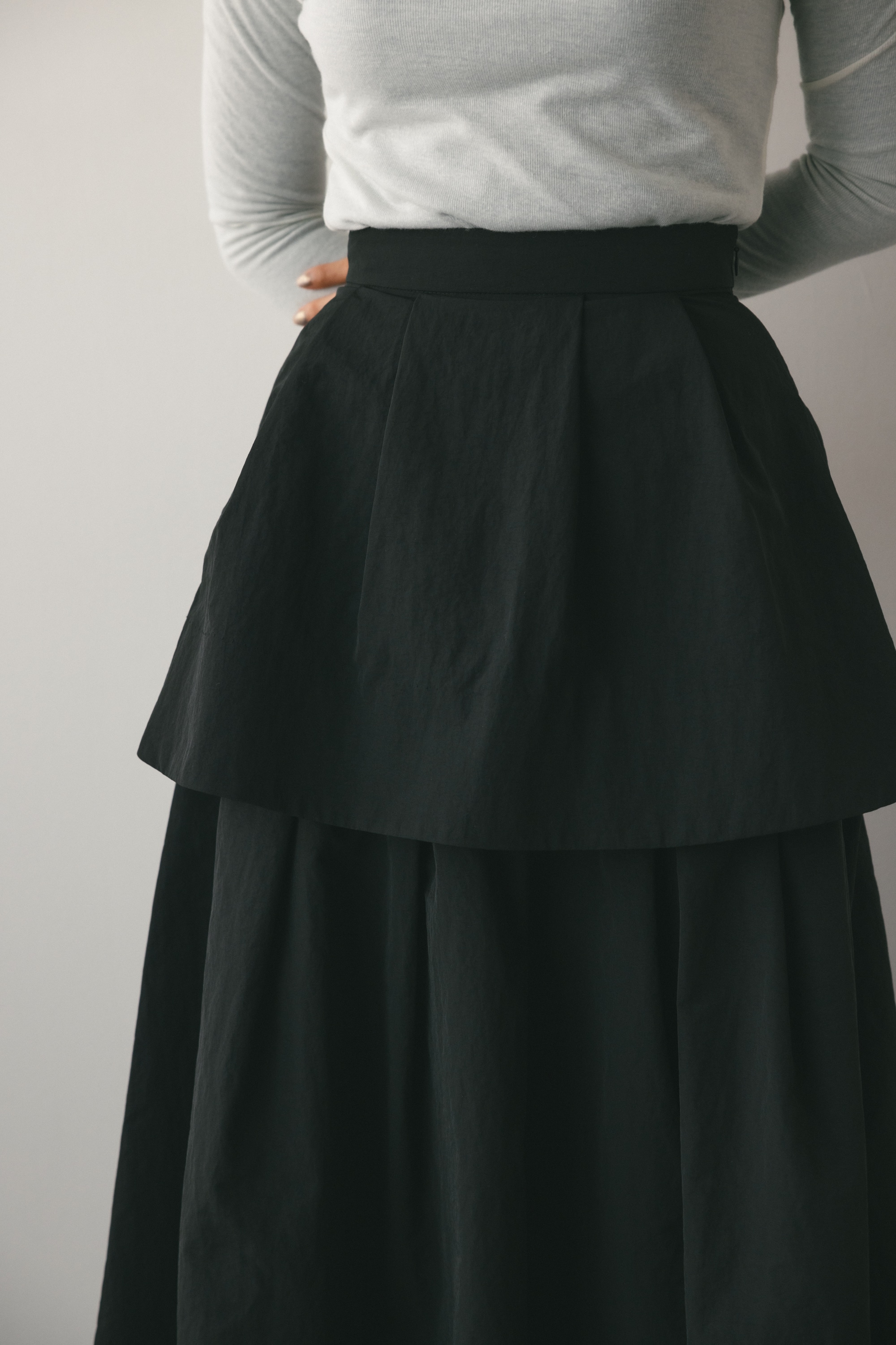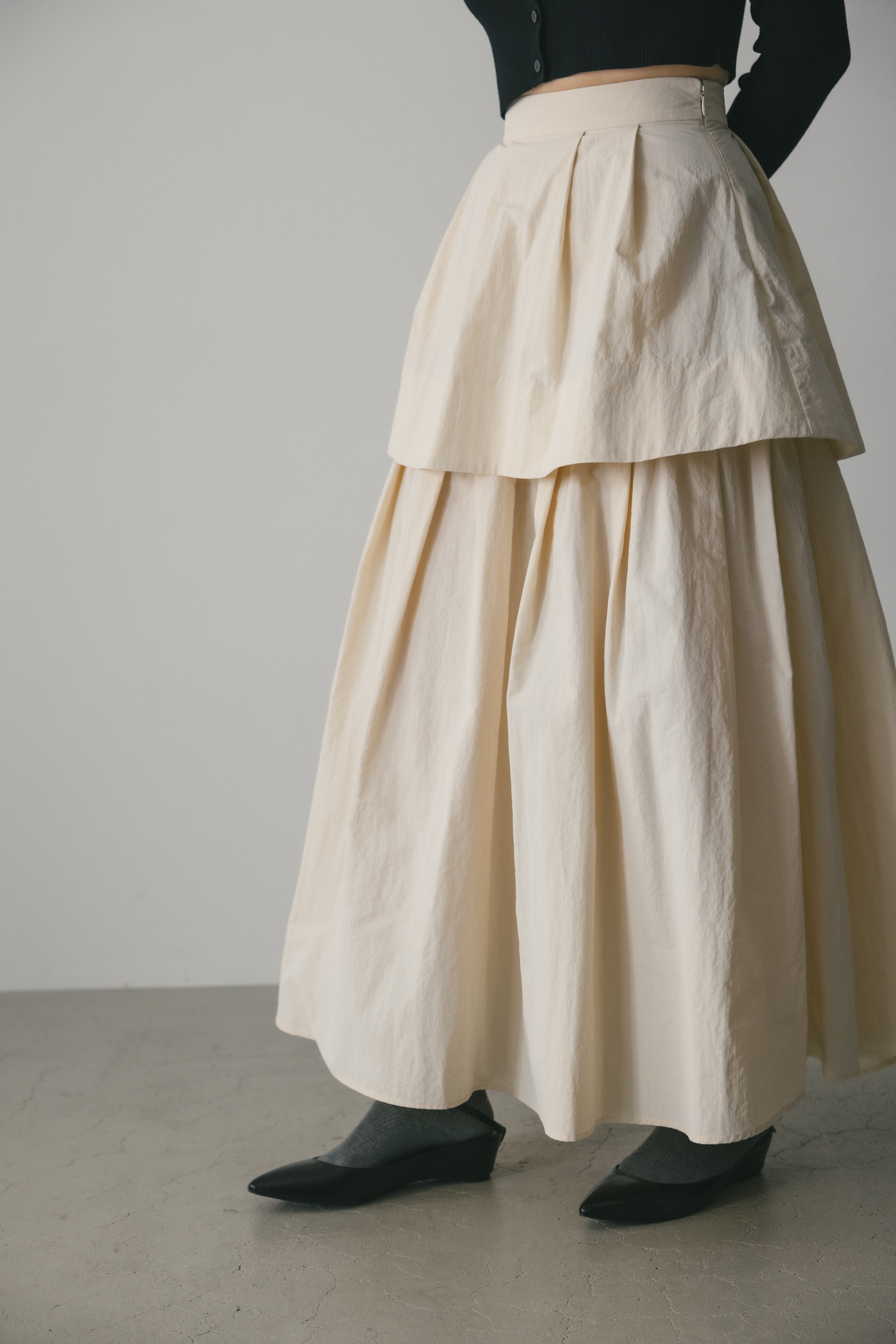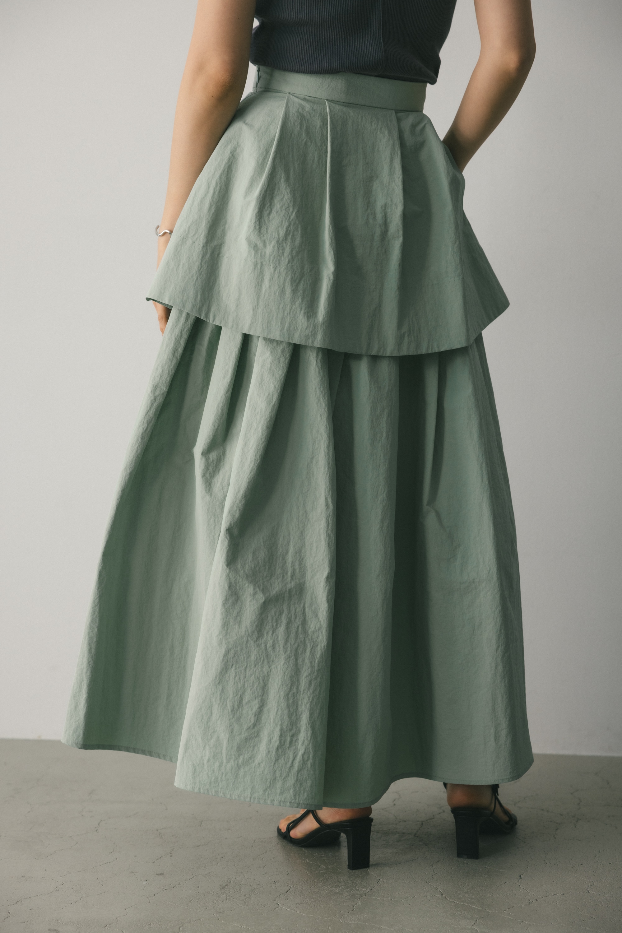 タックとギャザーでたっぷりと生地を使用したボリューム感がポイントのティアードフレアスカート。