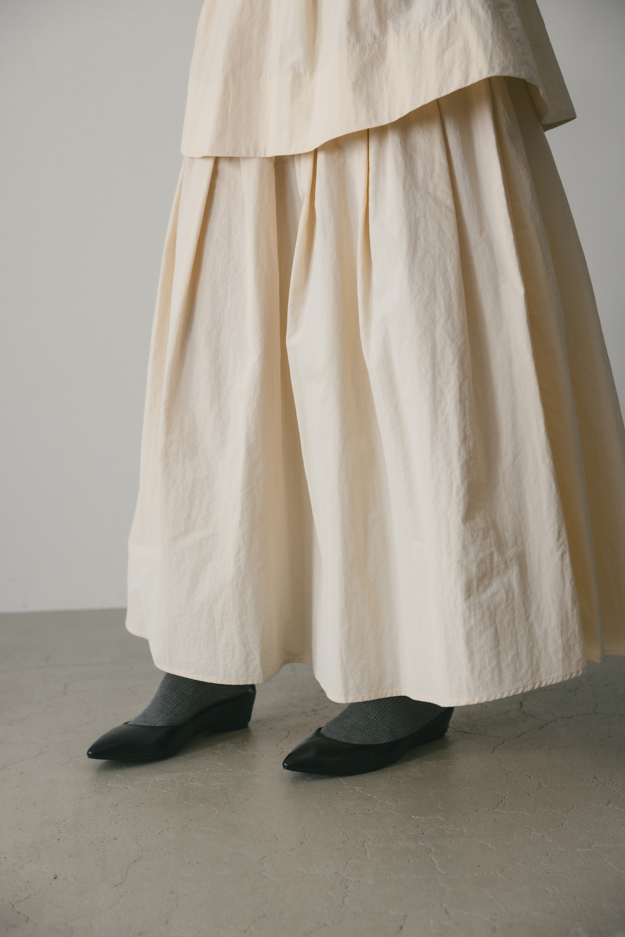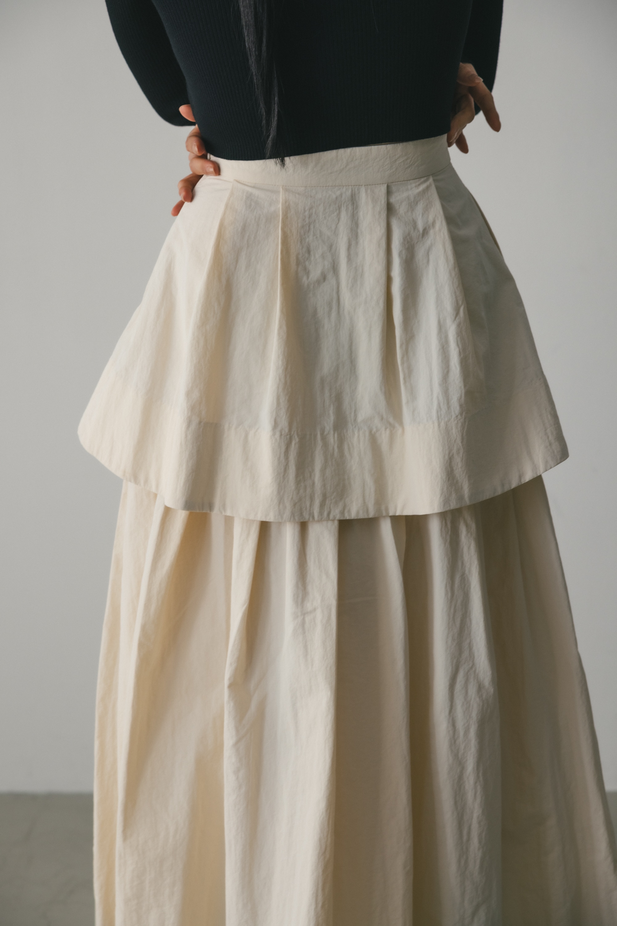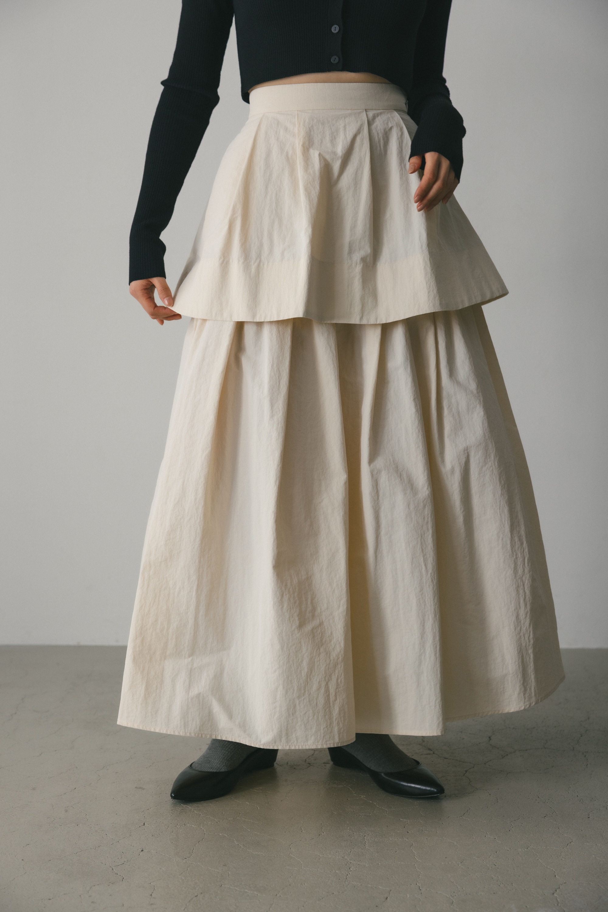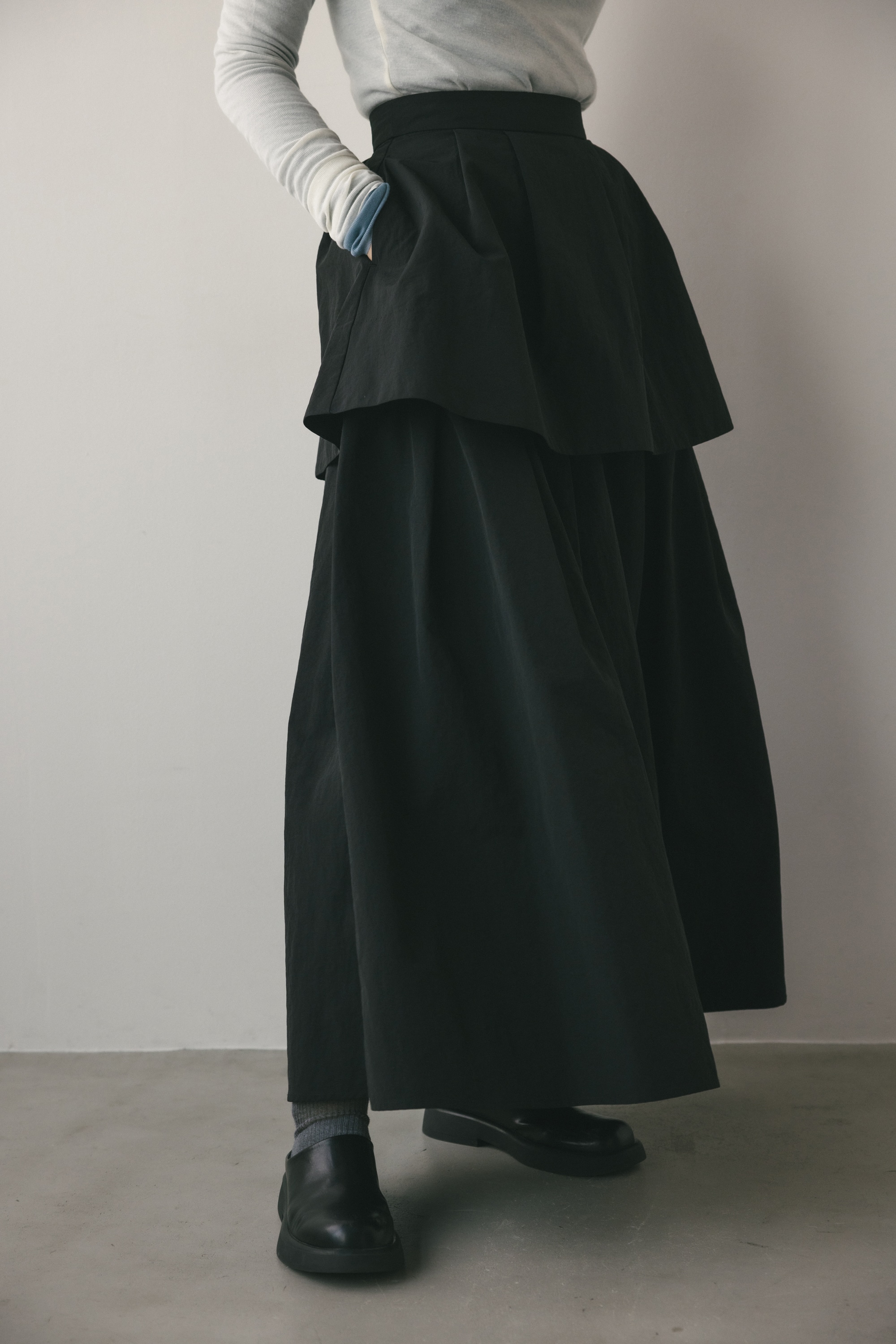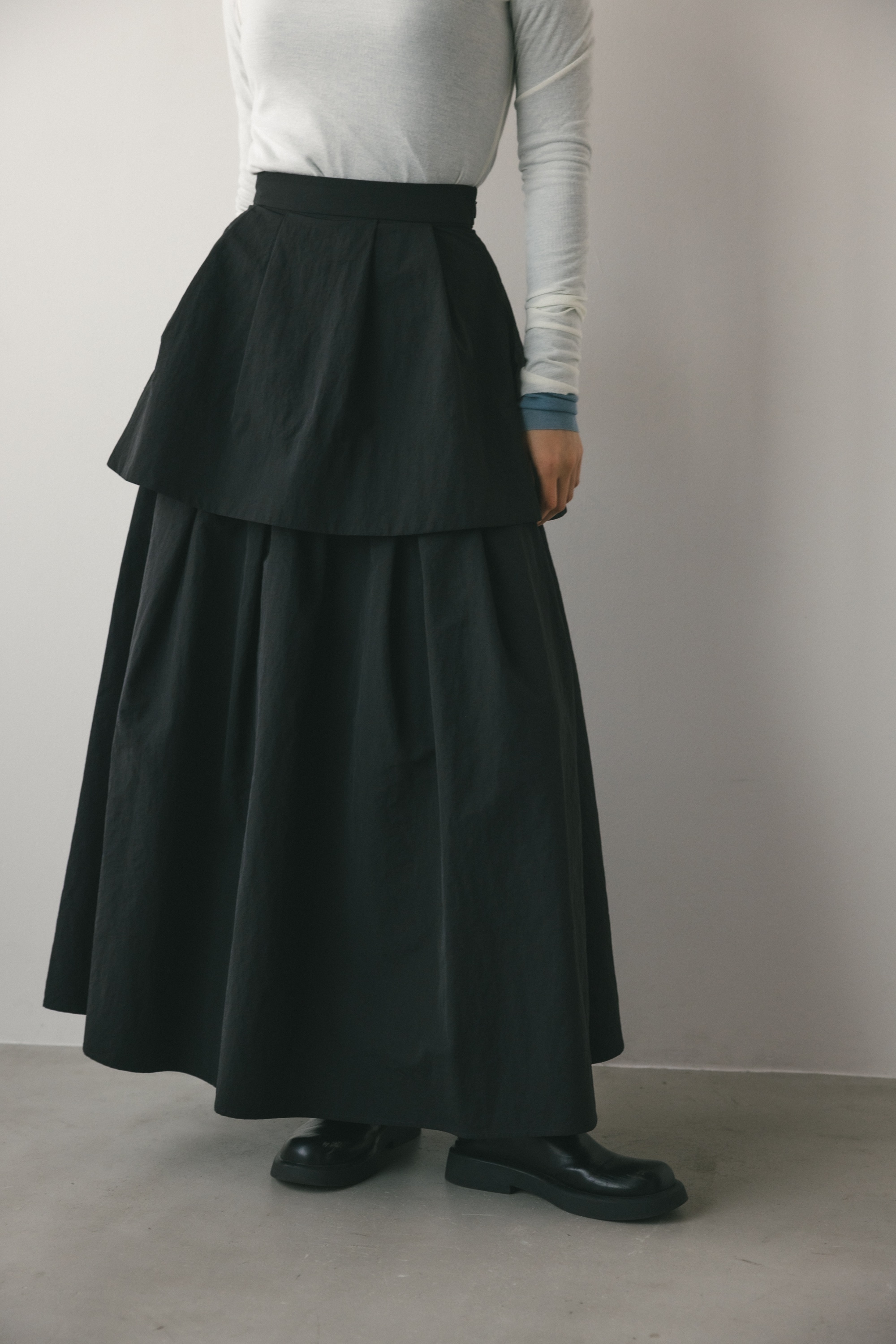 タックとギャザーでたっぷりと生地を使用したボリューム感がポイントのティアードフレアスカート。