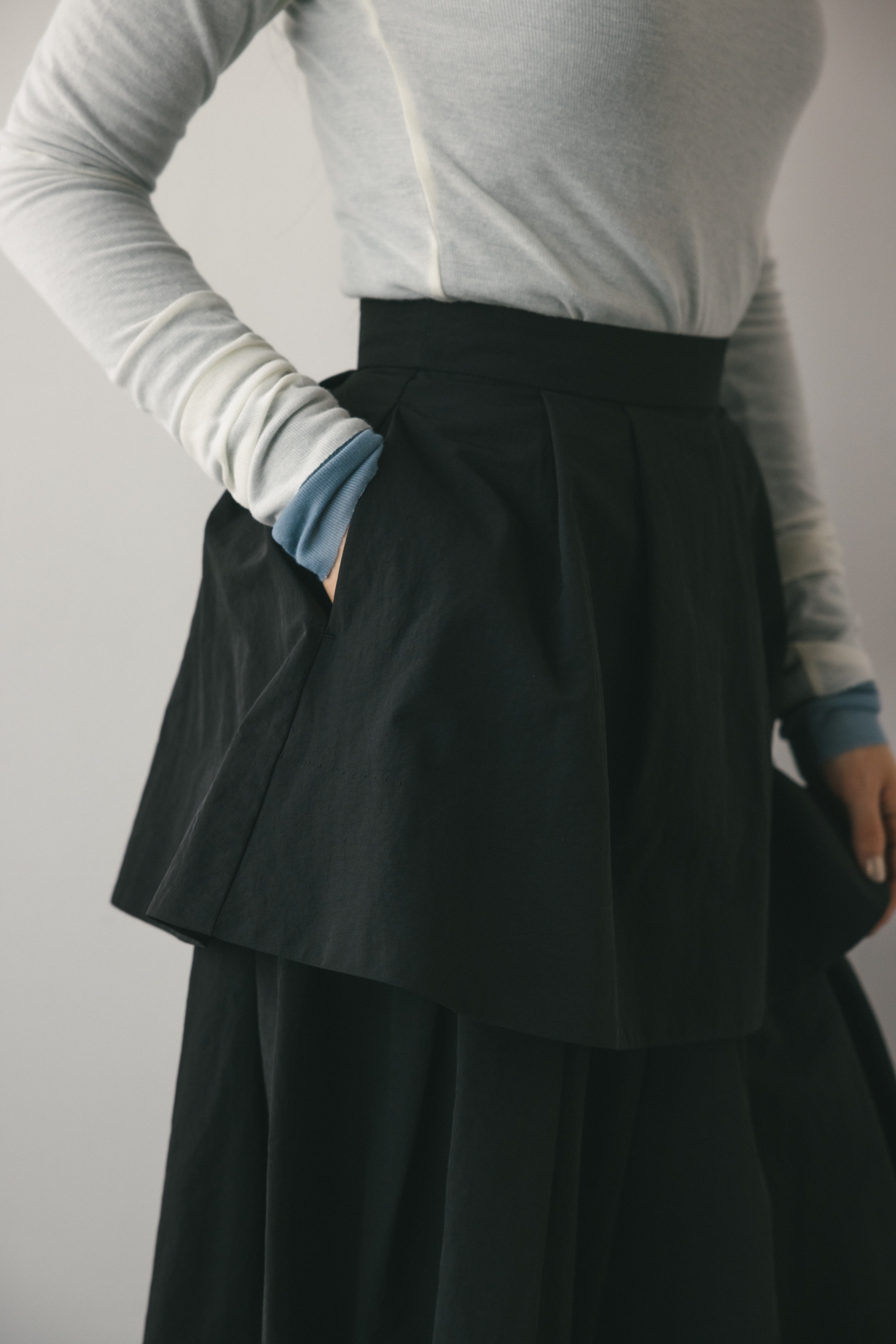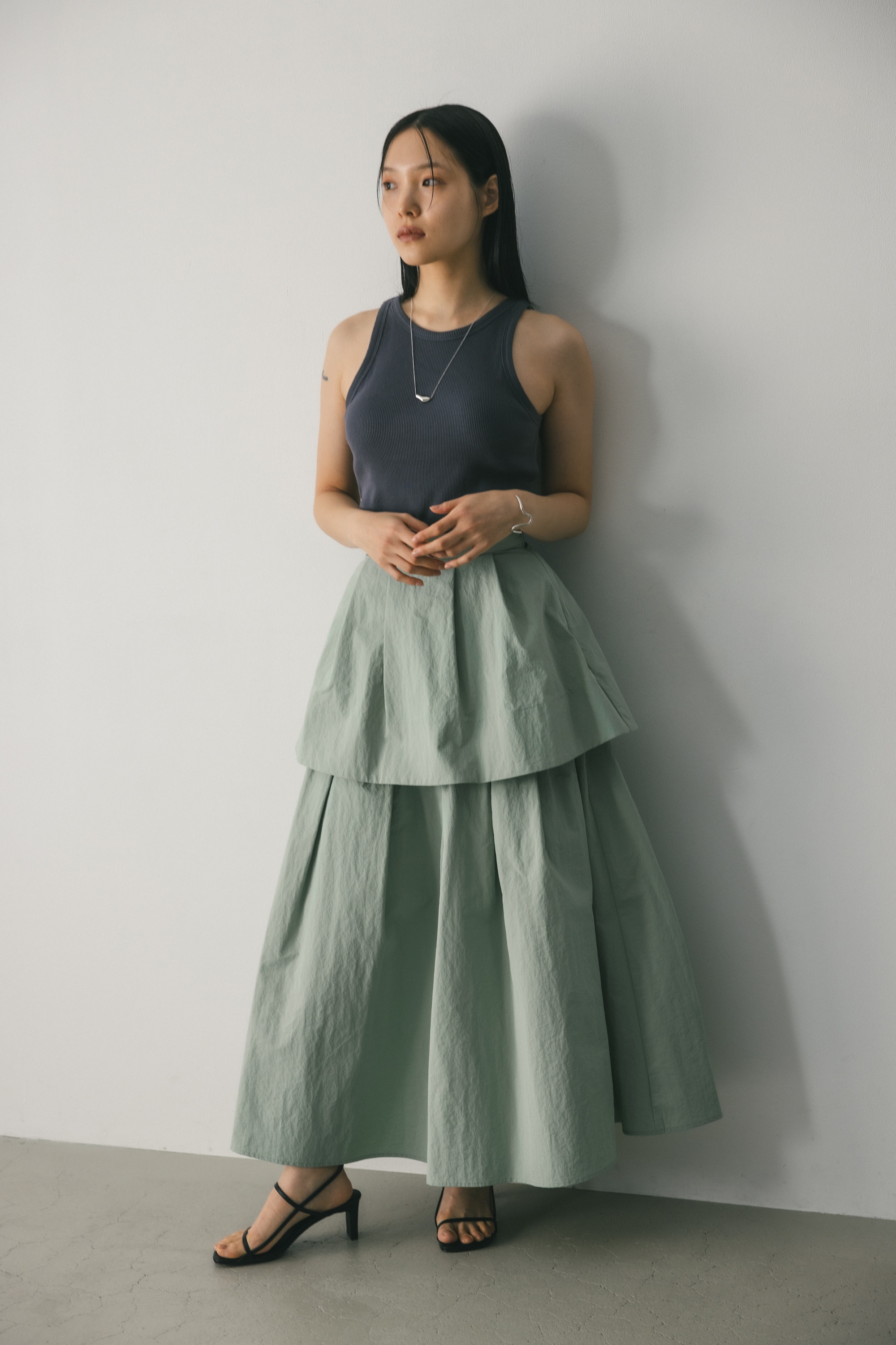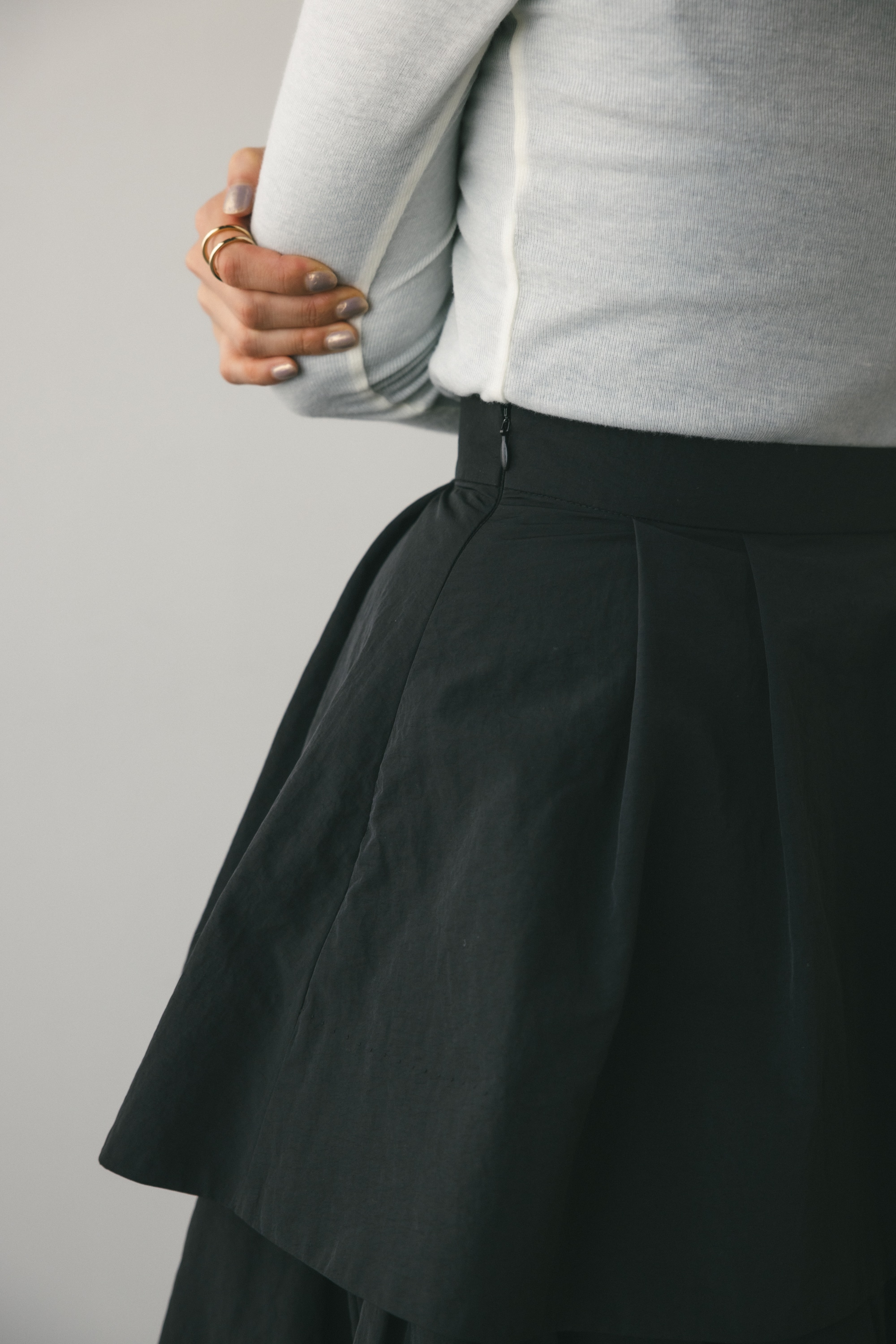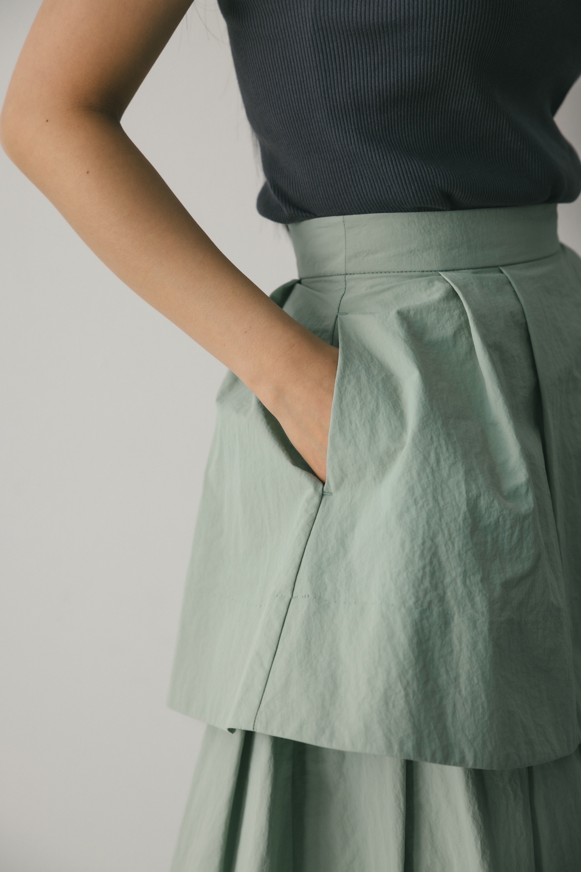 タックとギャザーでたっぷりと生地を使用したボリューム感がポイントのティアードフレアスカート。