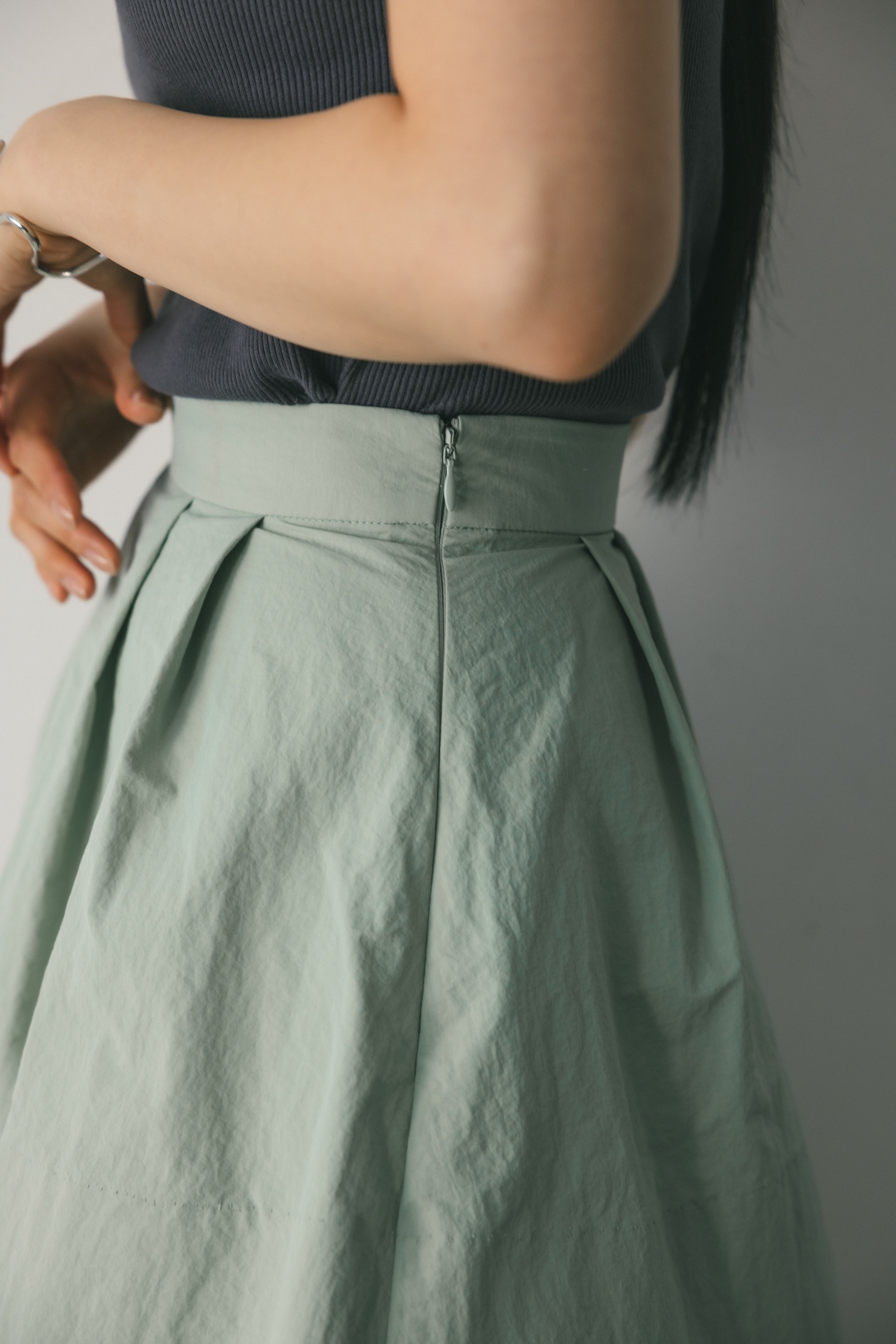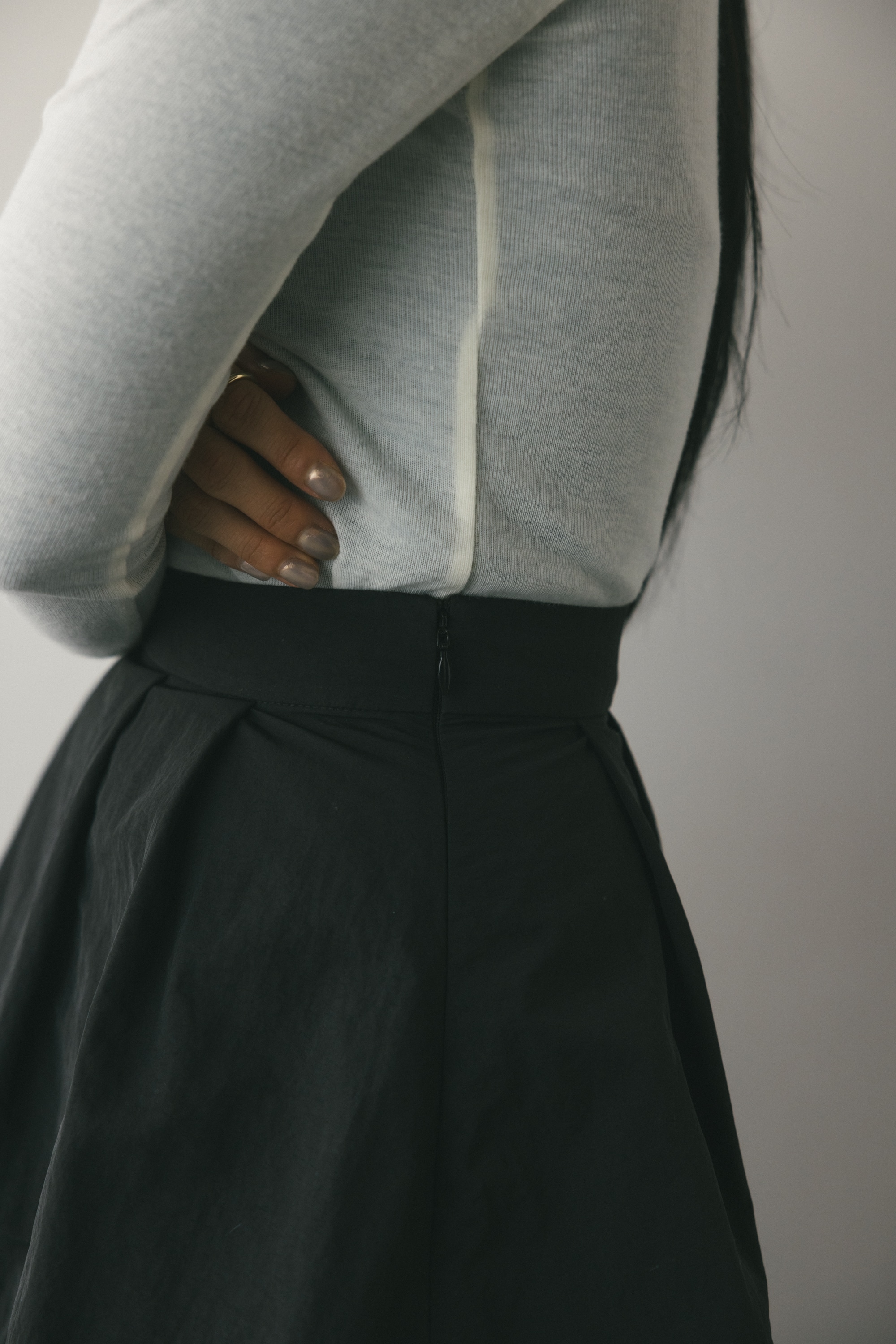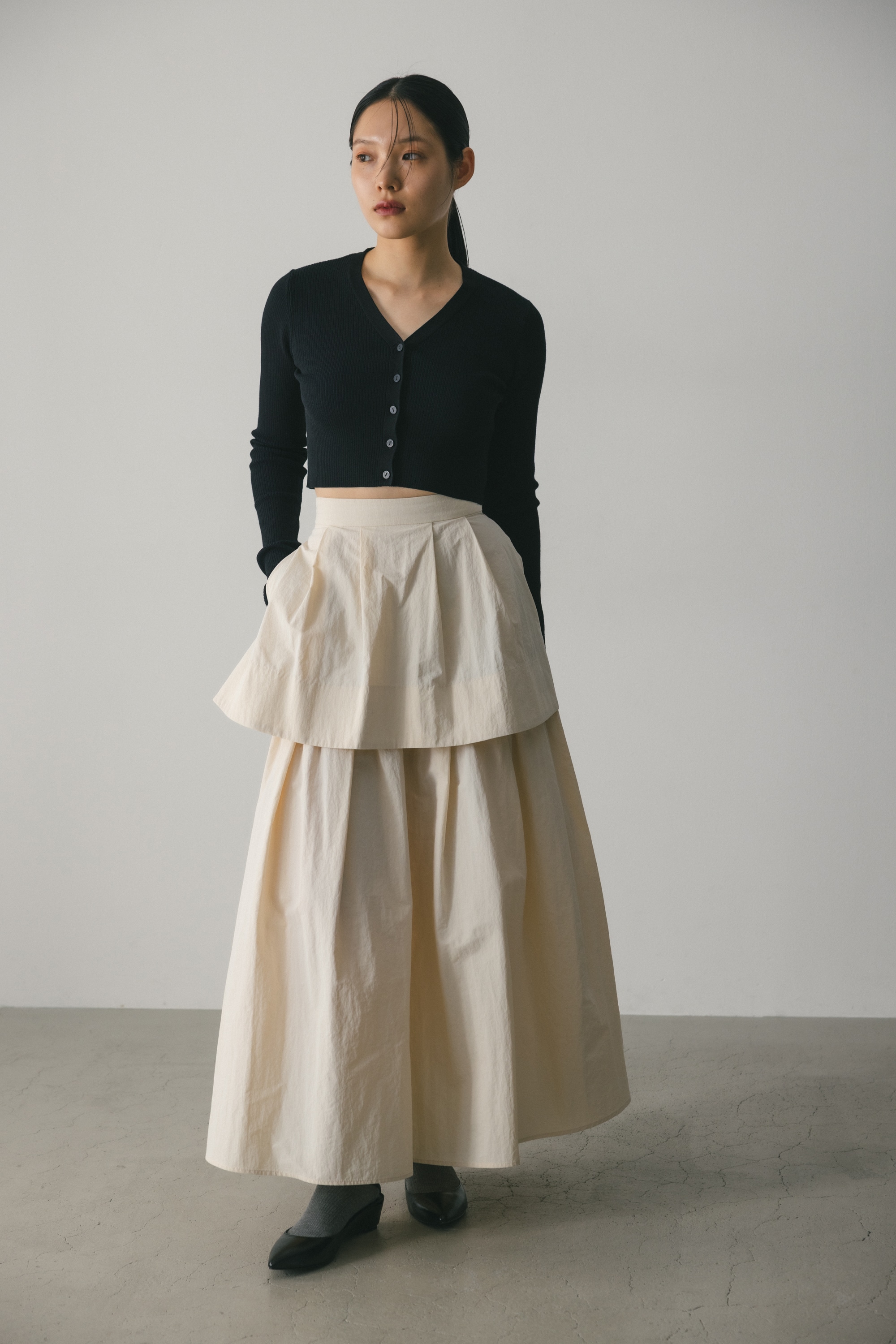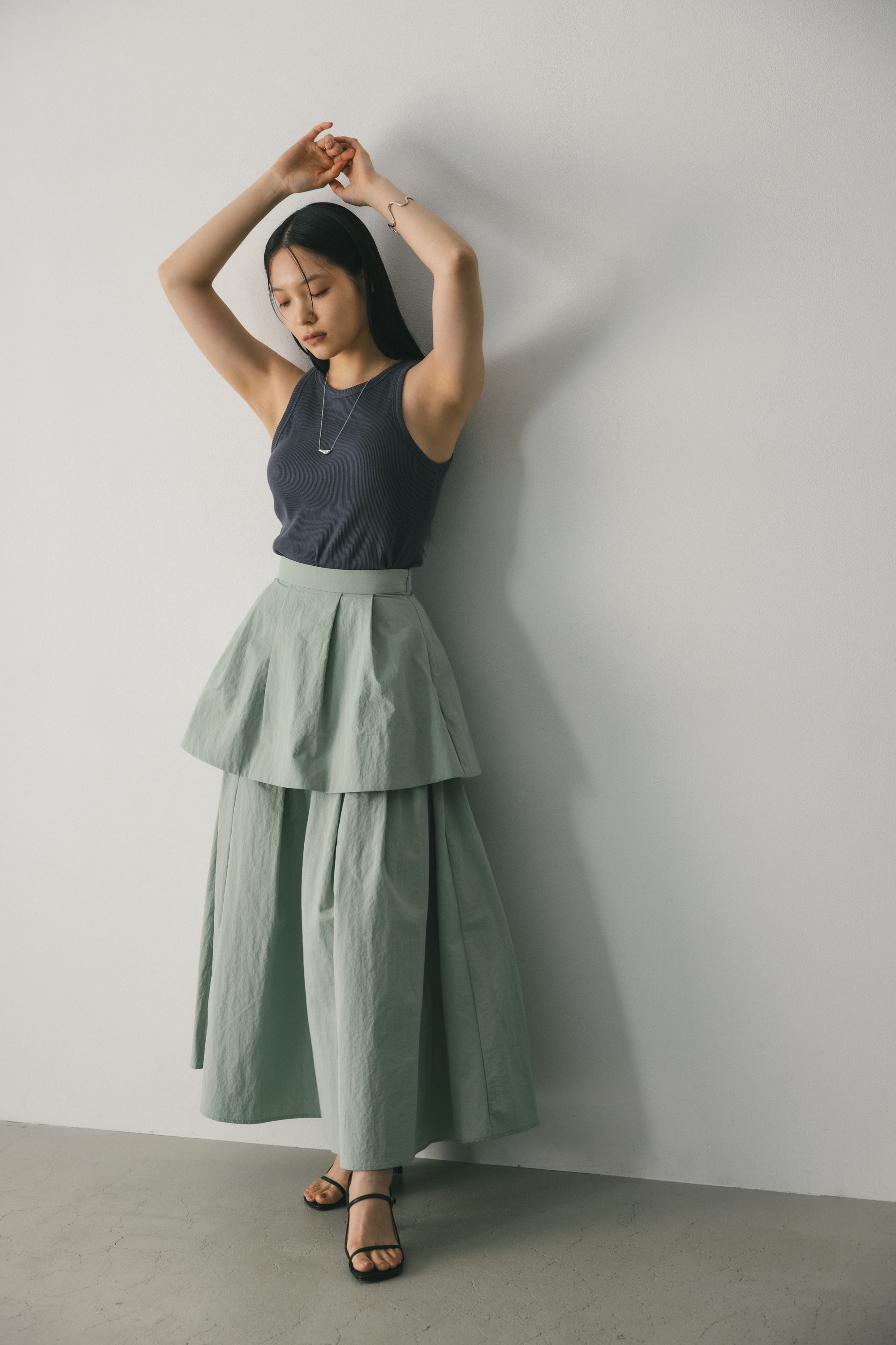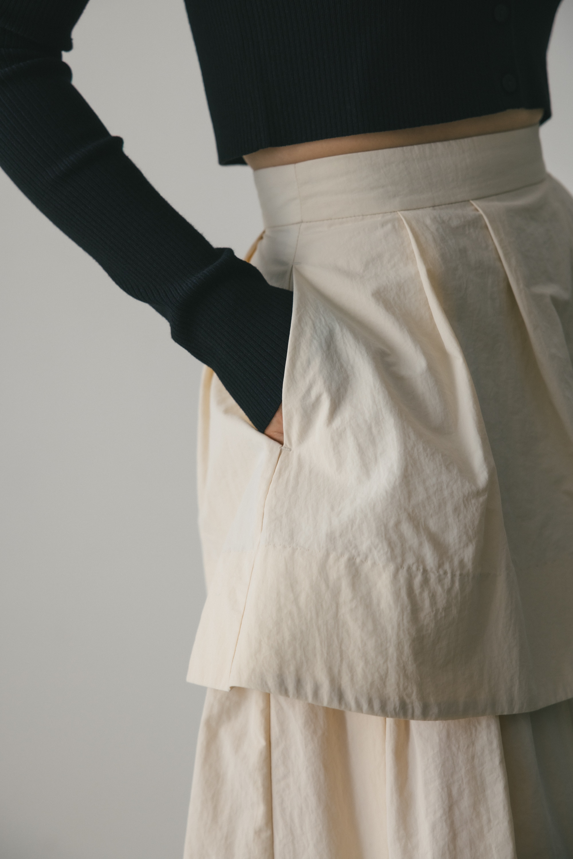 タックとギャザーでたっぷりと生地を使用したボリューム感がポイントのティアードフレアスカート。