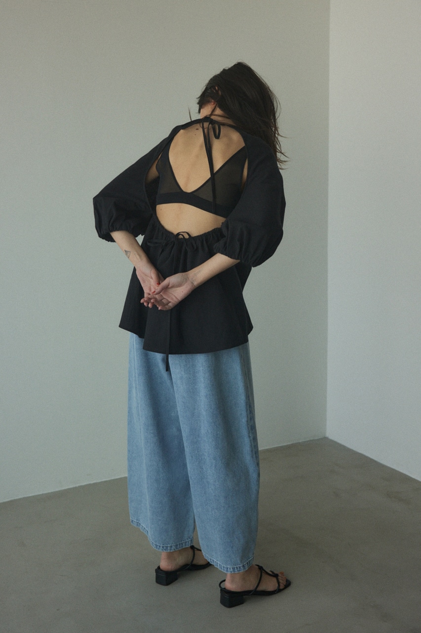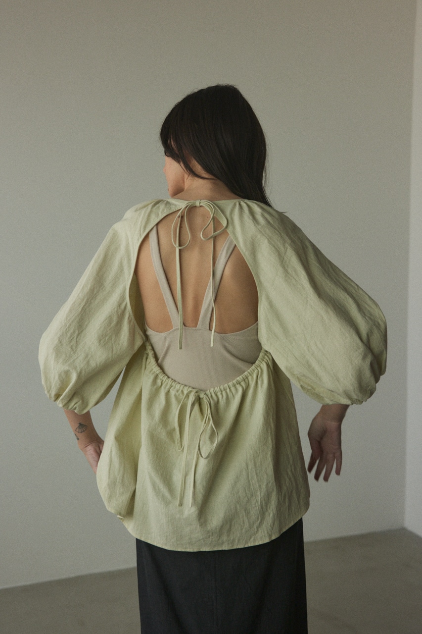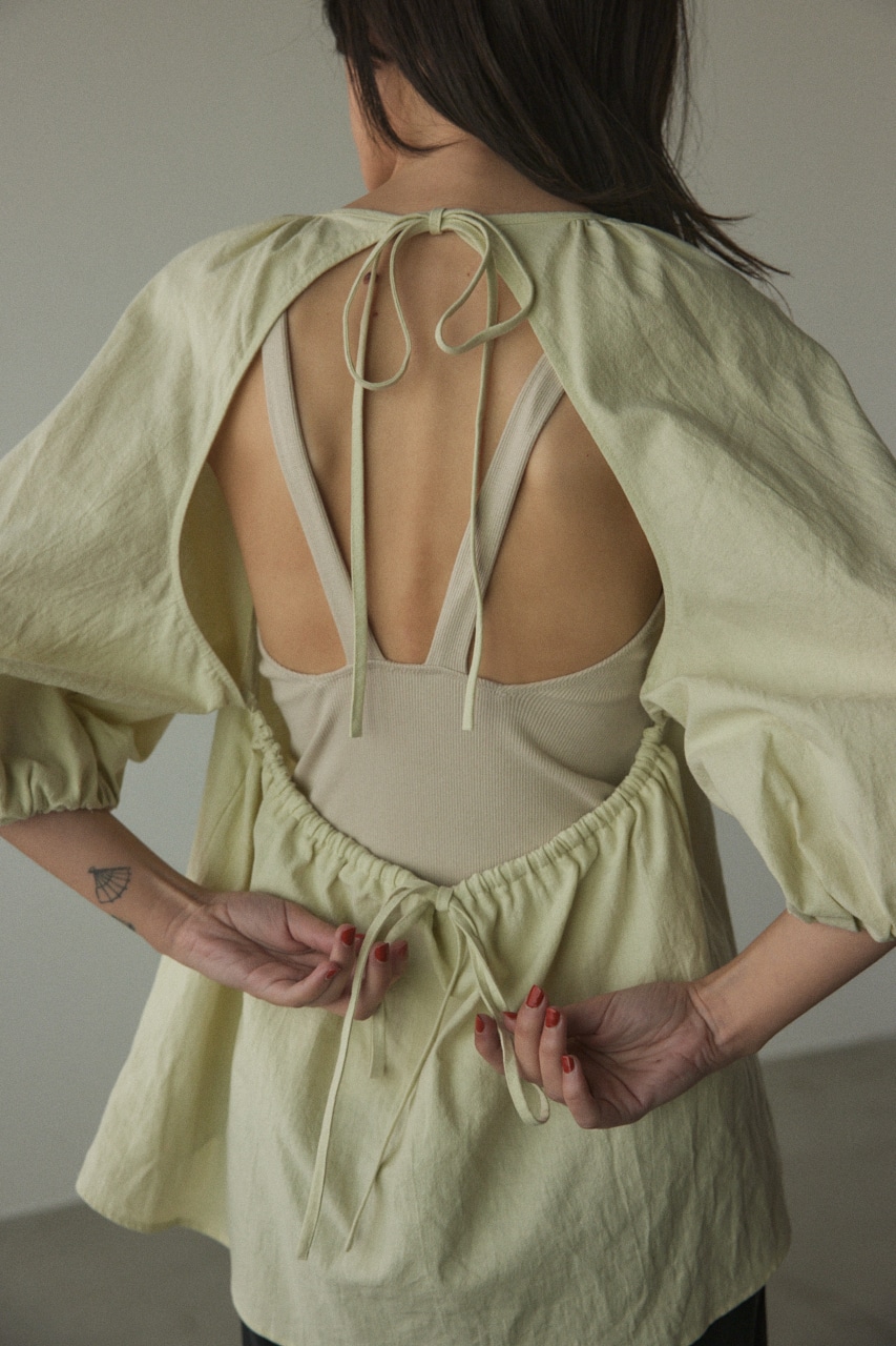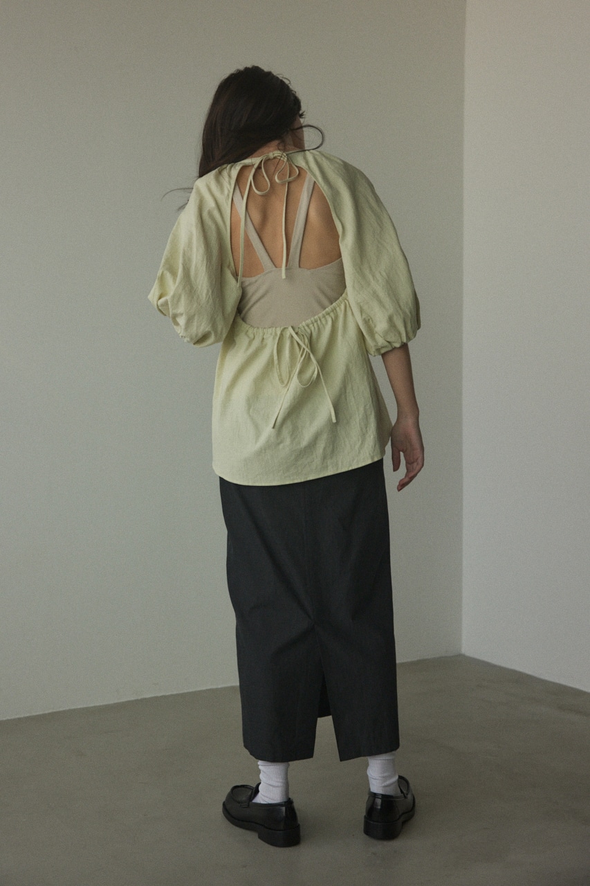 バックシルエットは大胆に開けたデザインにして、あえてイメージの違いを出したブラウス。