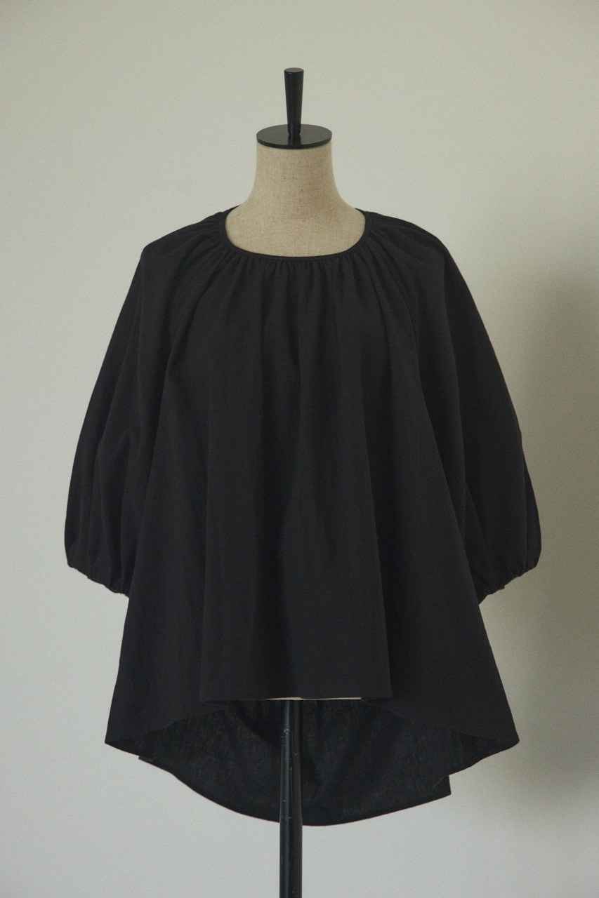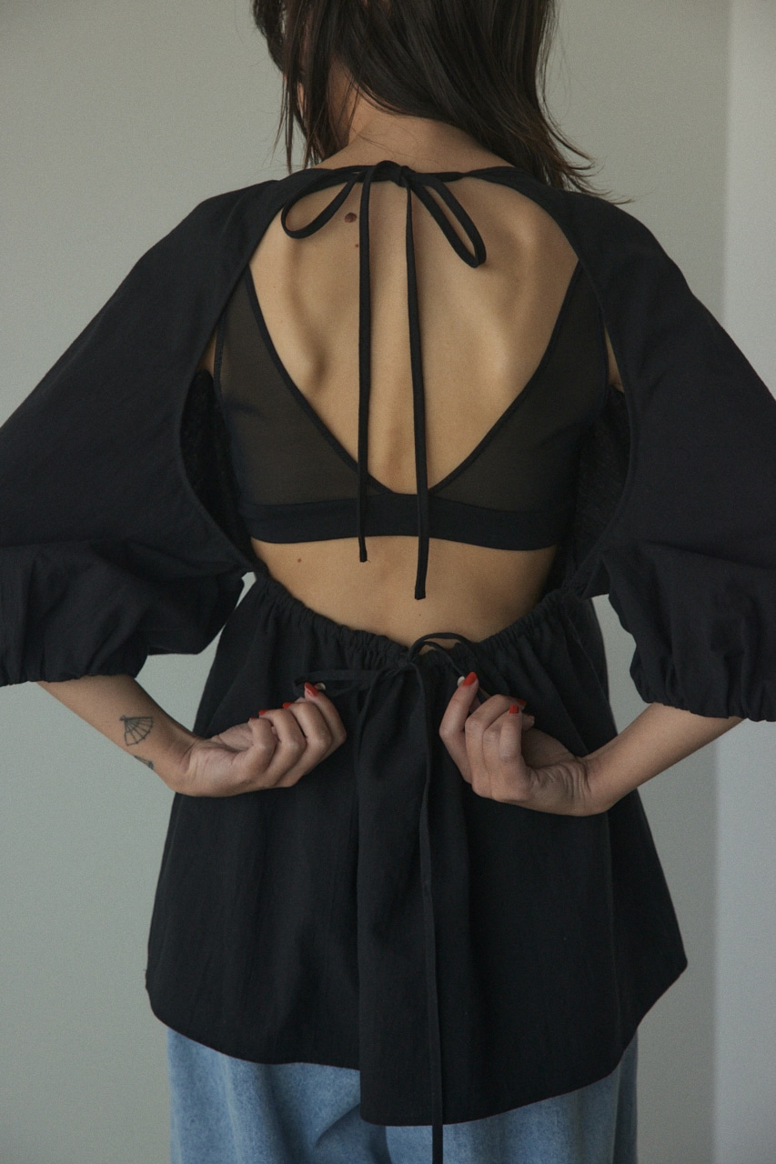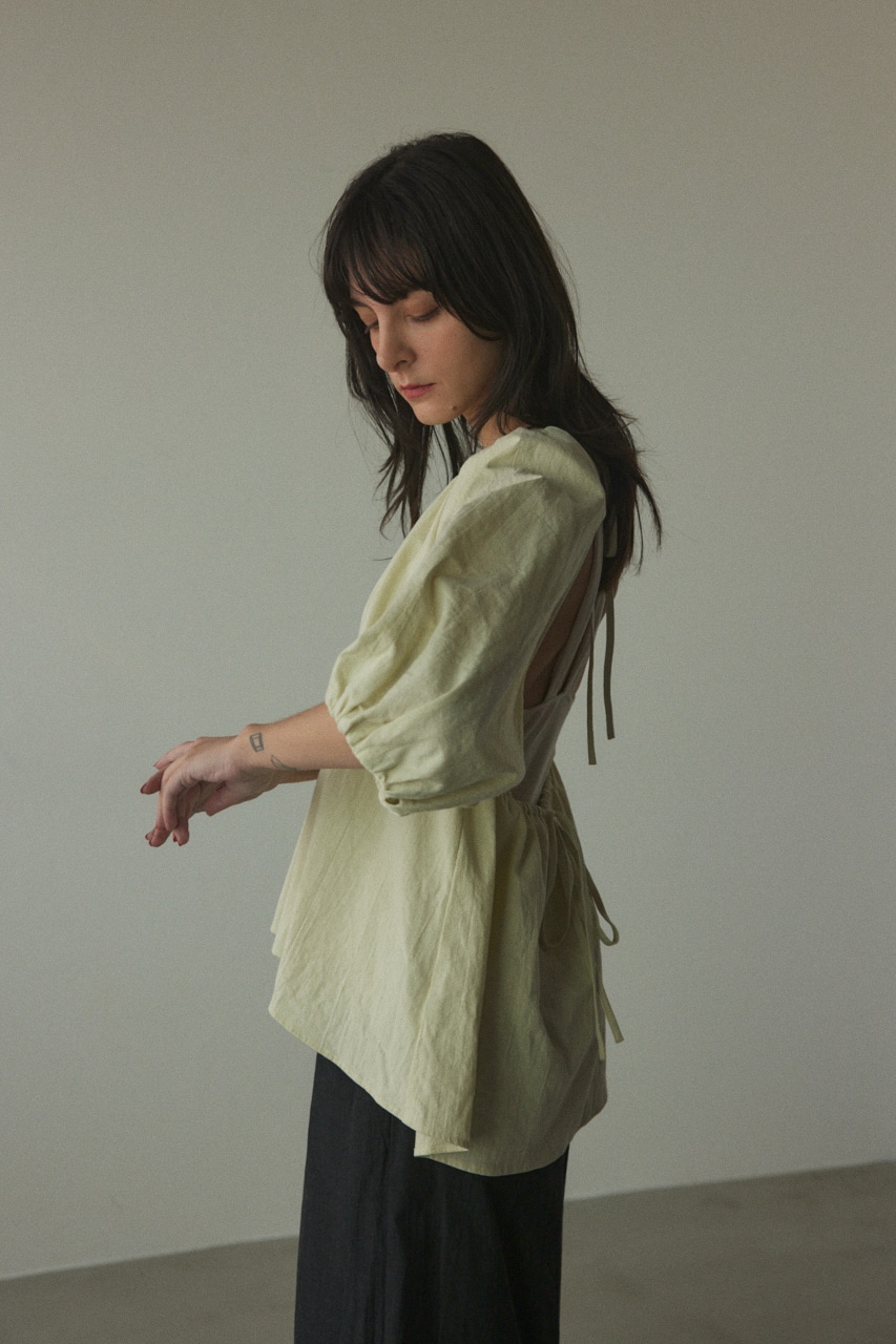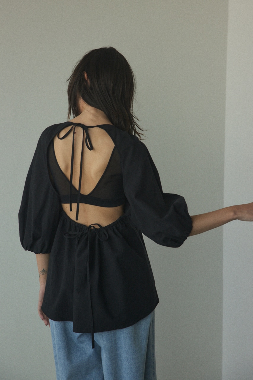 バックシルエットは大胆に開けたデザインにして、あえてイメージの違いを出したブラウス。