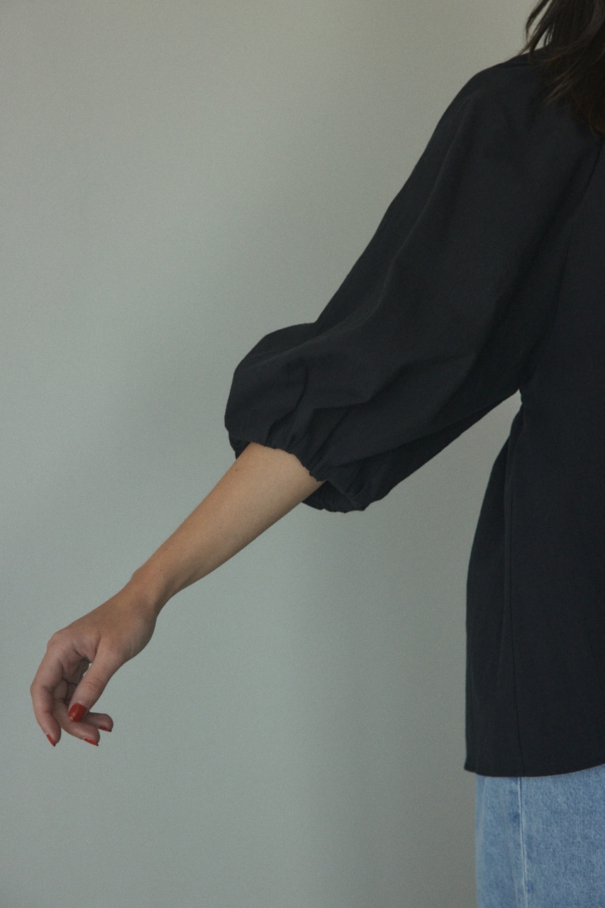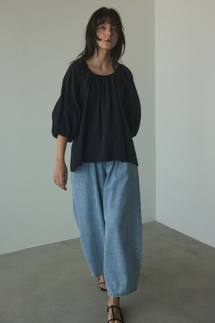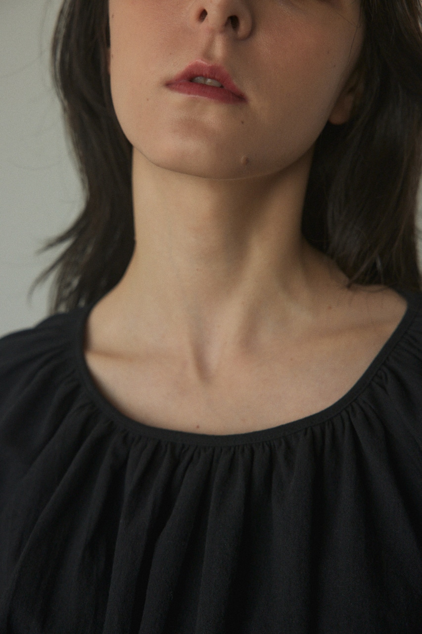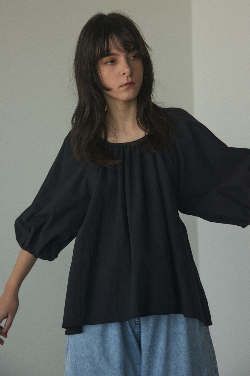 バックシルエットは大胆に開けたデザインにして、あえてイメージの違いを出したブラウス。