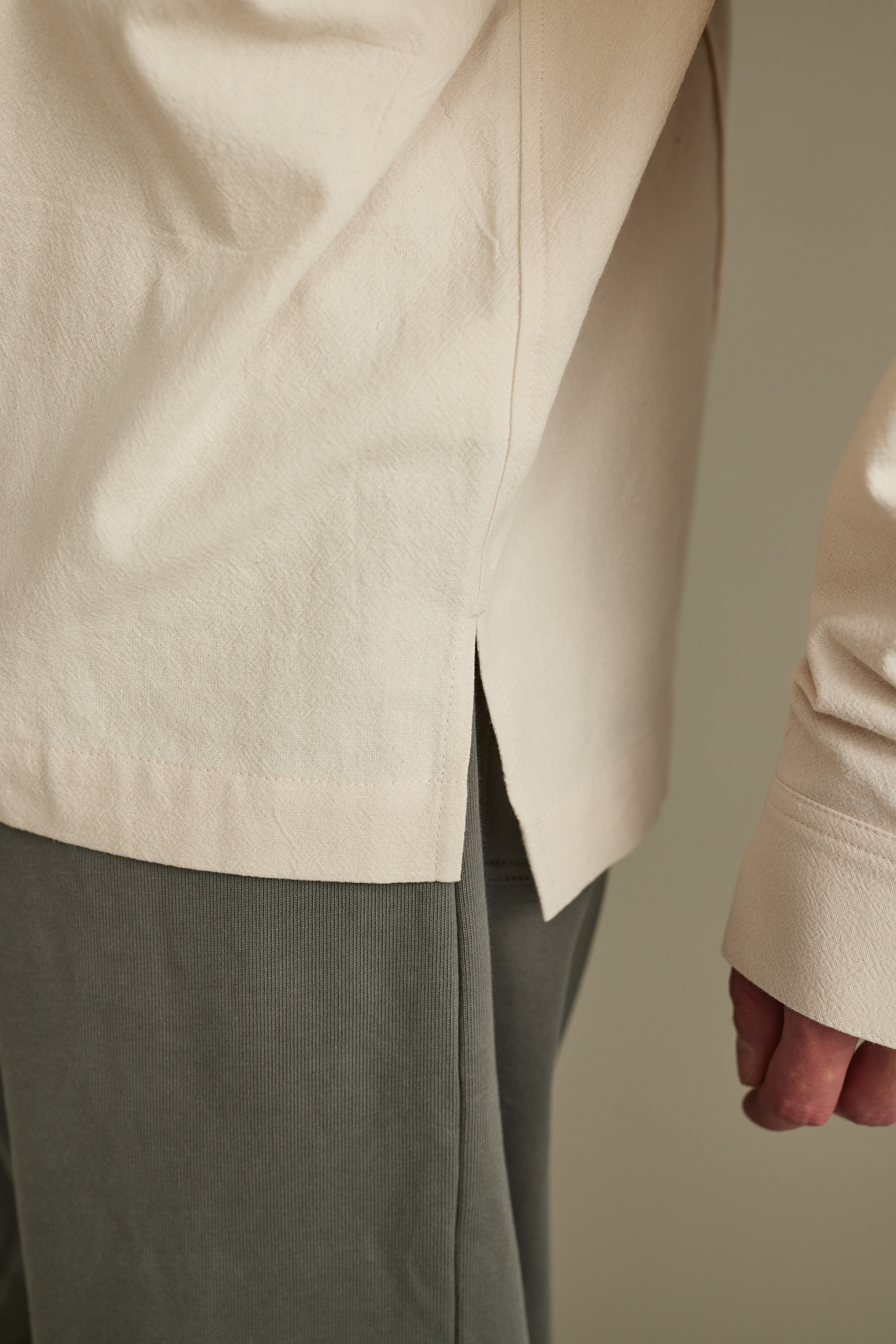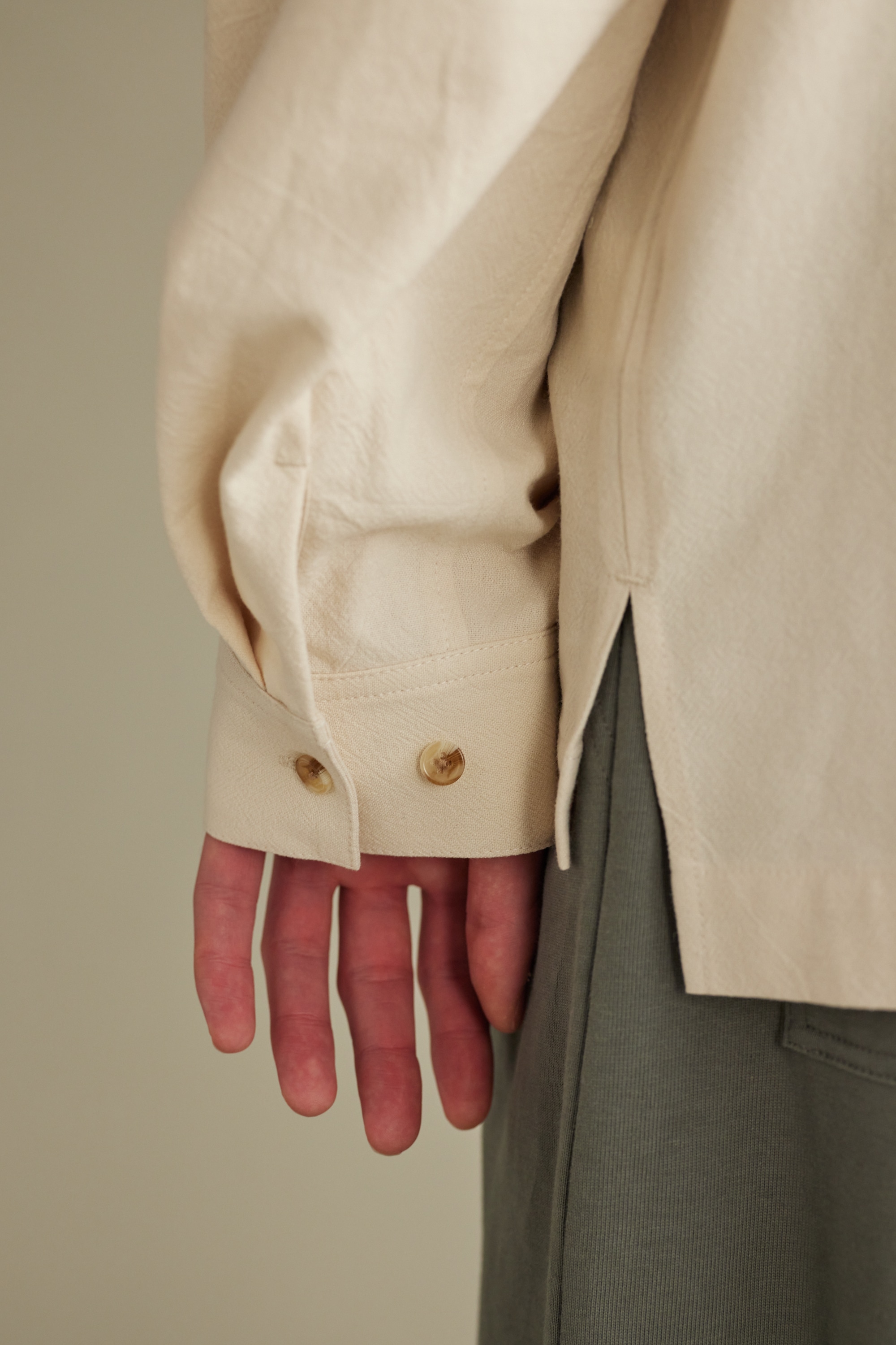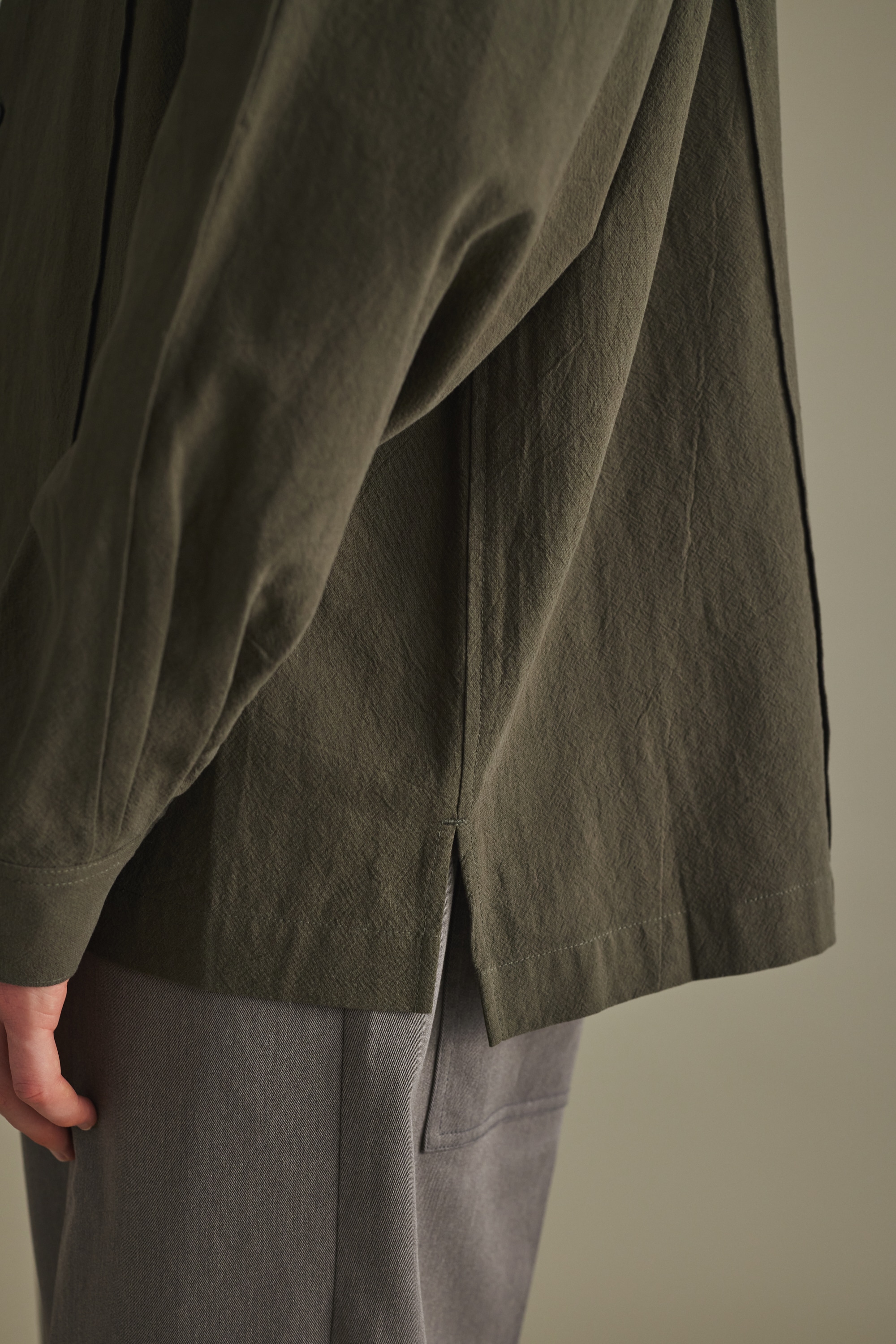 一枚ではもちろん、レイヤードしても着やすいように首元はすっきりとバンドカラーで仕上げたデザインシャツ。