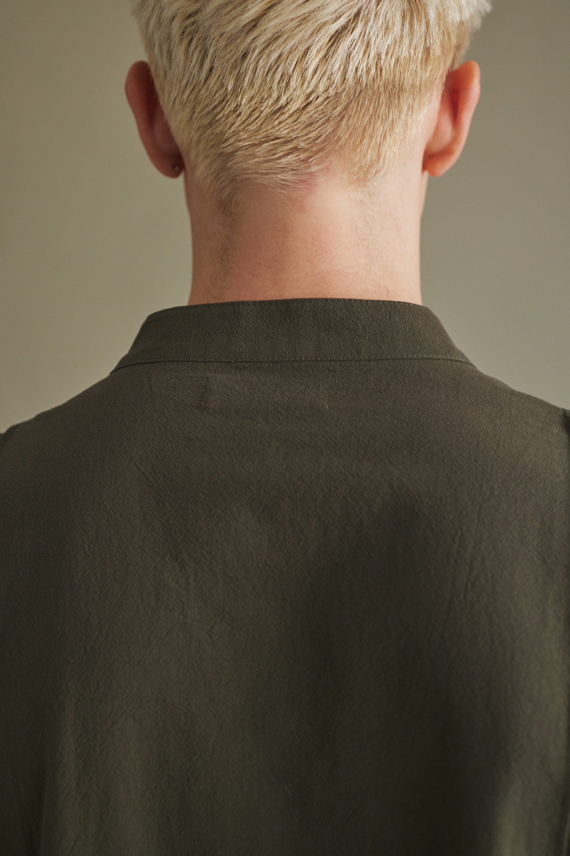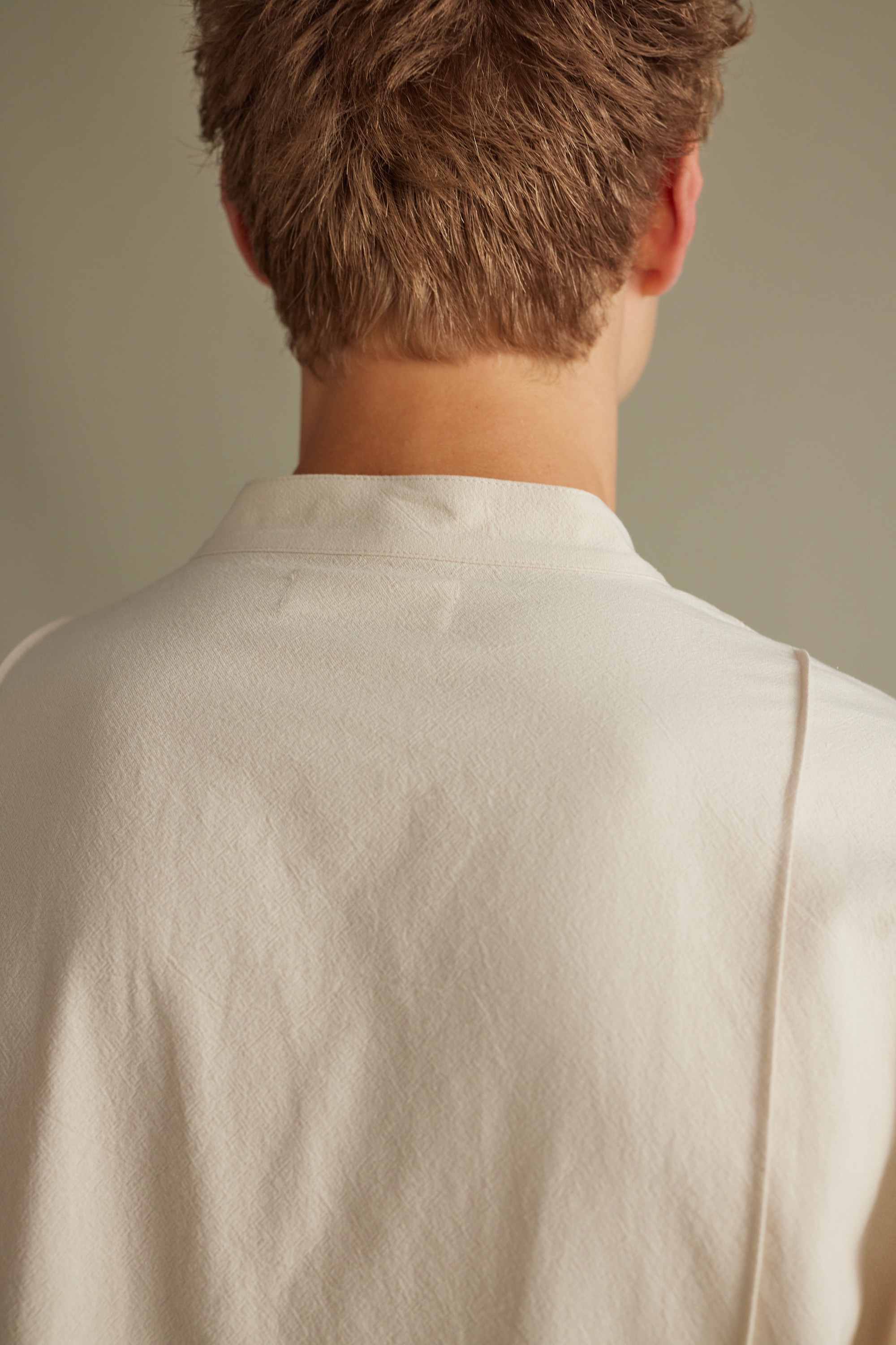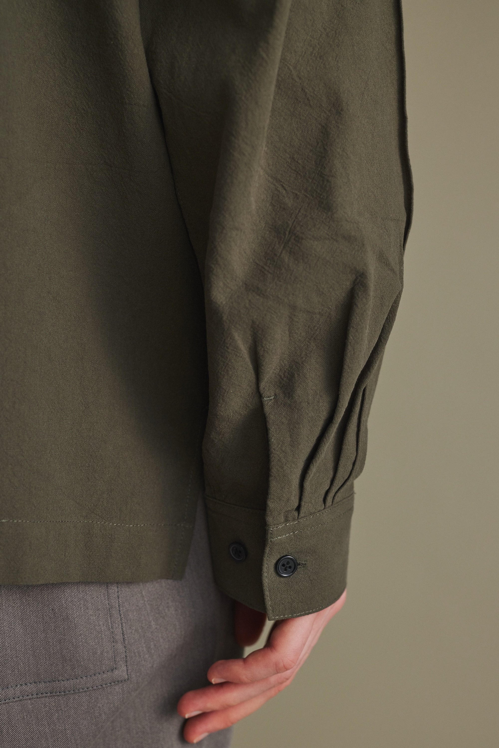 一枚ではもちろん、レイヤードしても着やすいように首元はすっきりとバンドカラーで仕上げたデザインシャツ。
