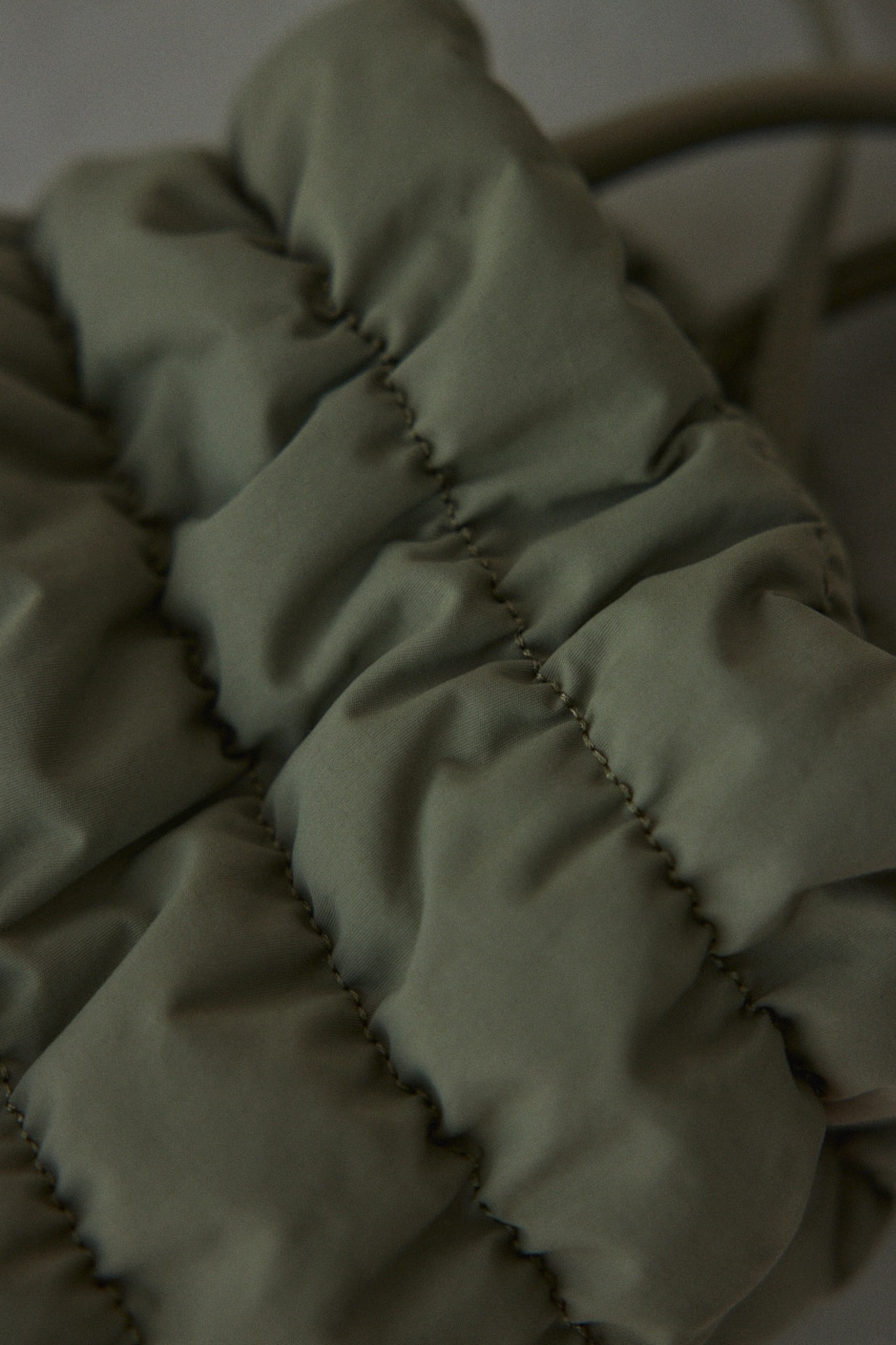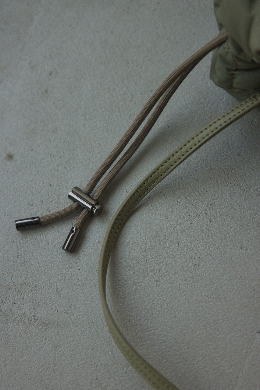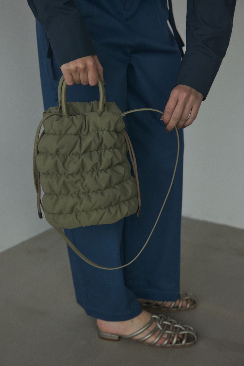 ギャザーをたっぷりと施した巾着タイプのバッグ。