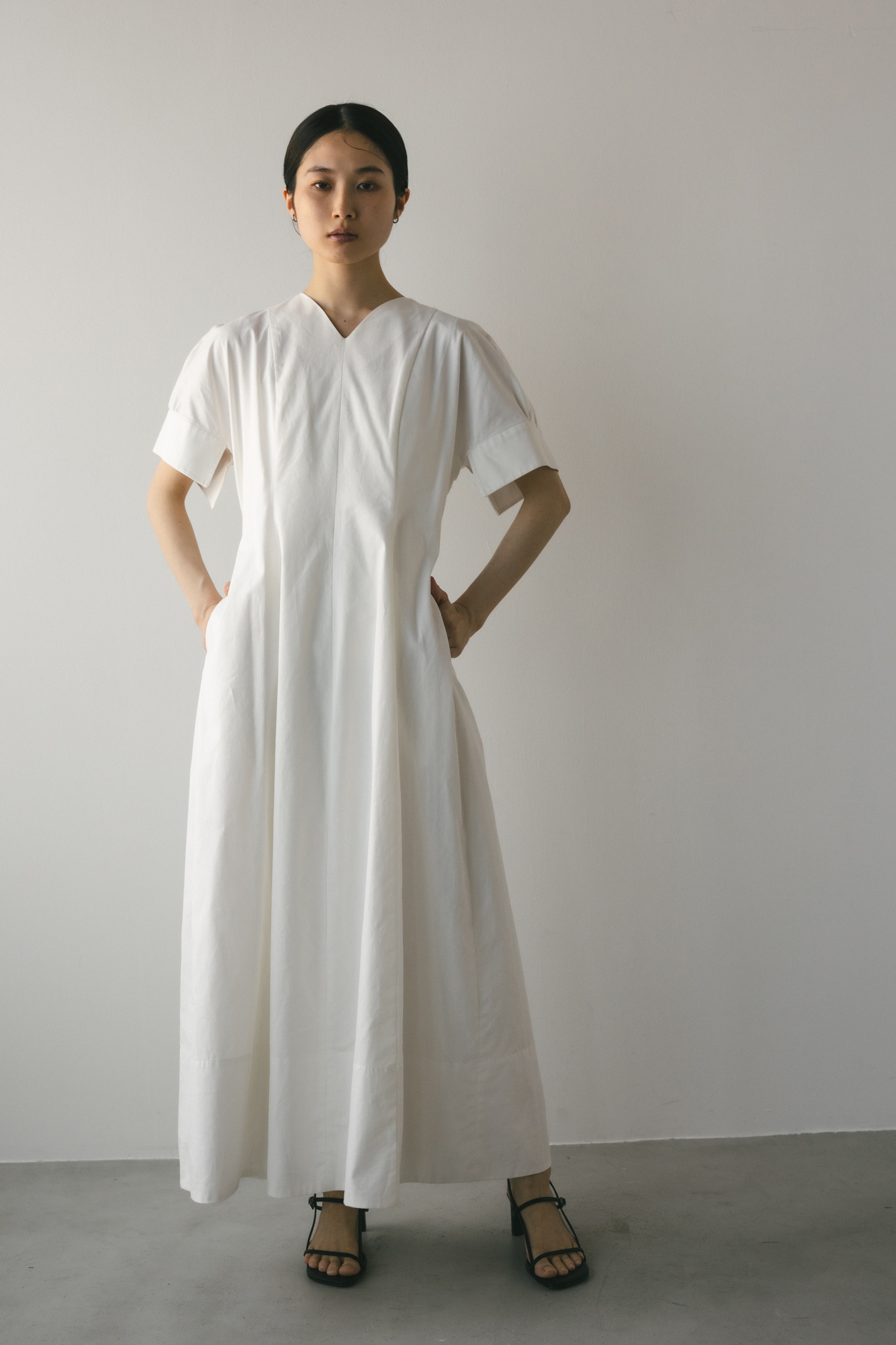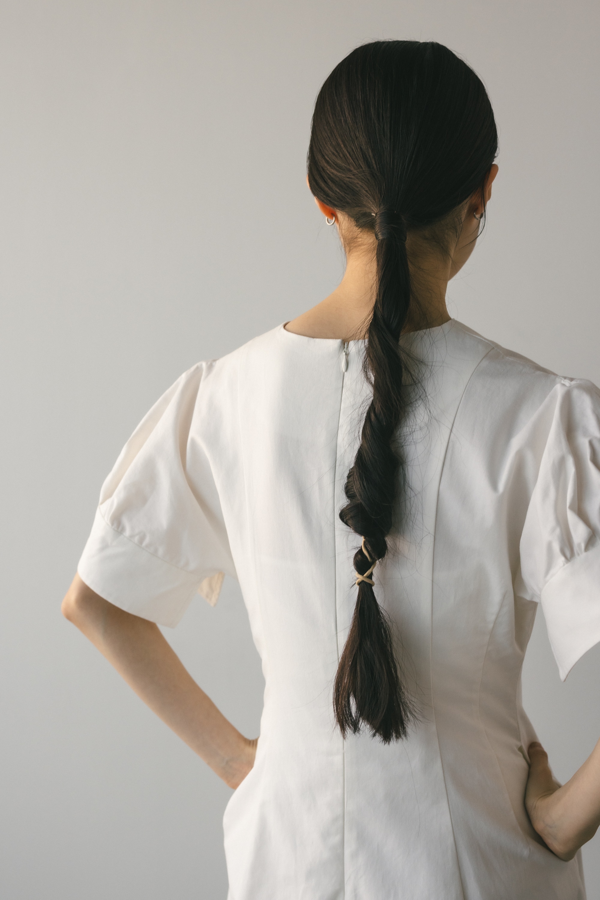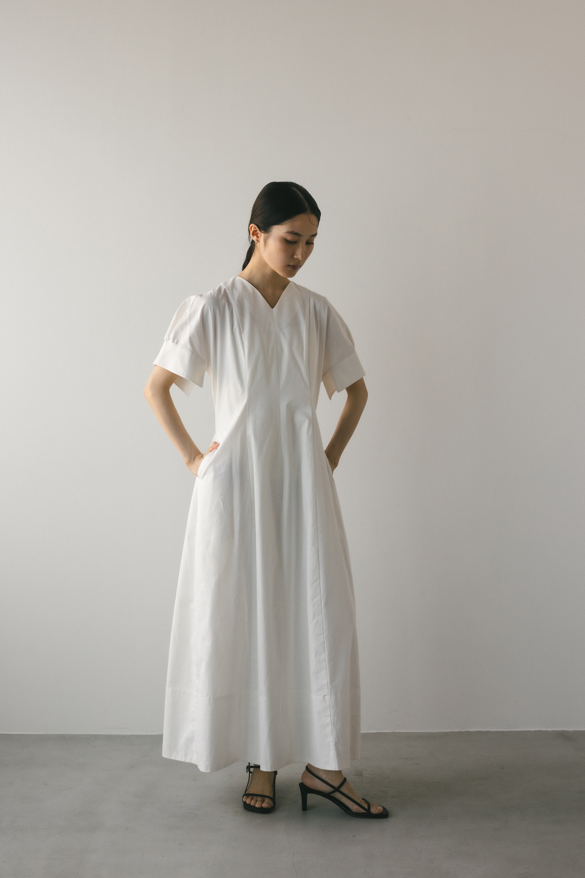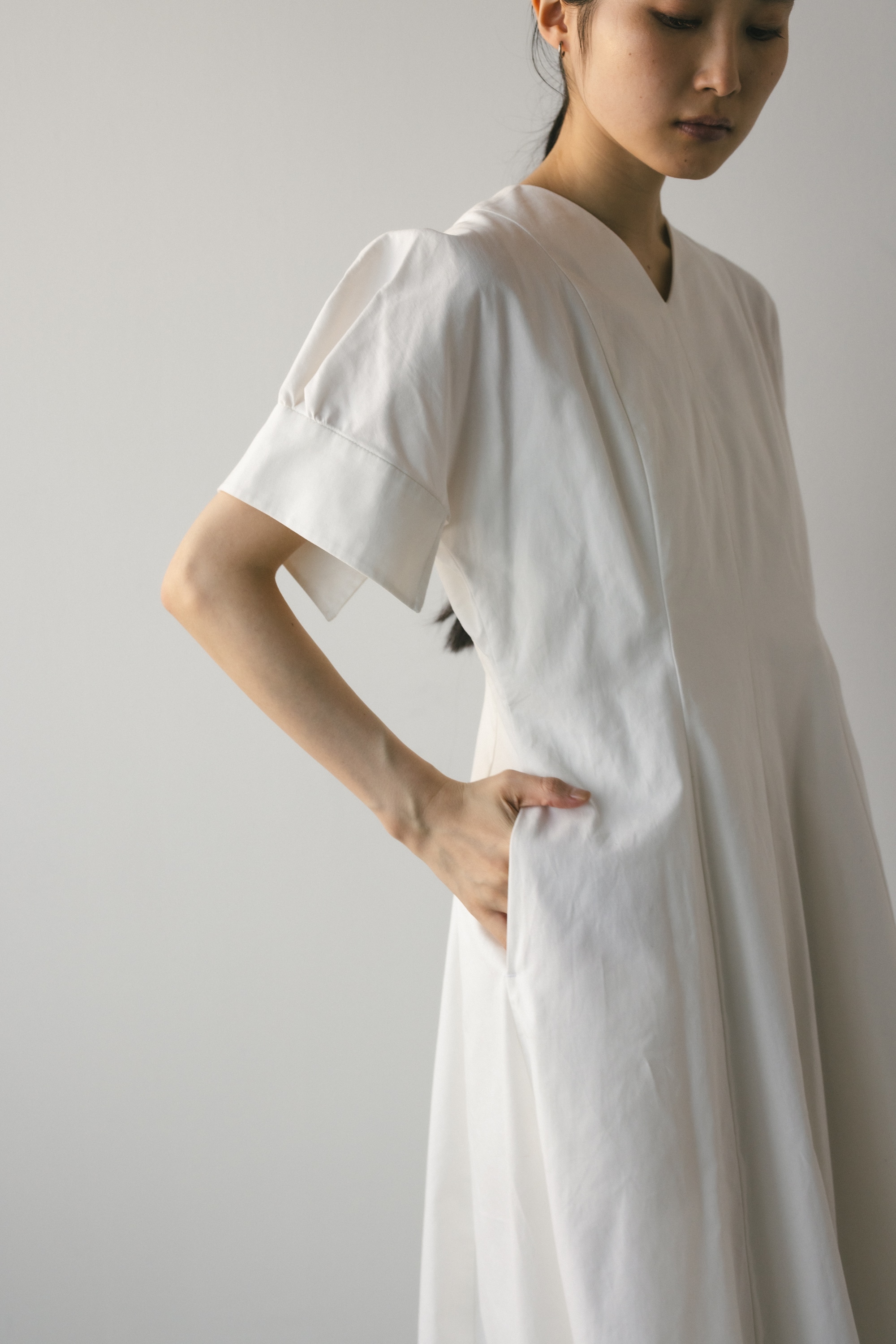 少し立ち上げた首元からラウンドしたVネックと肩からつながるバルーンシルエットがマニッシュモードなワンピース。