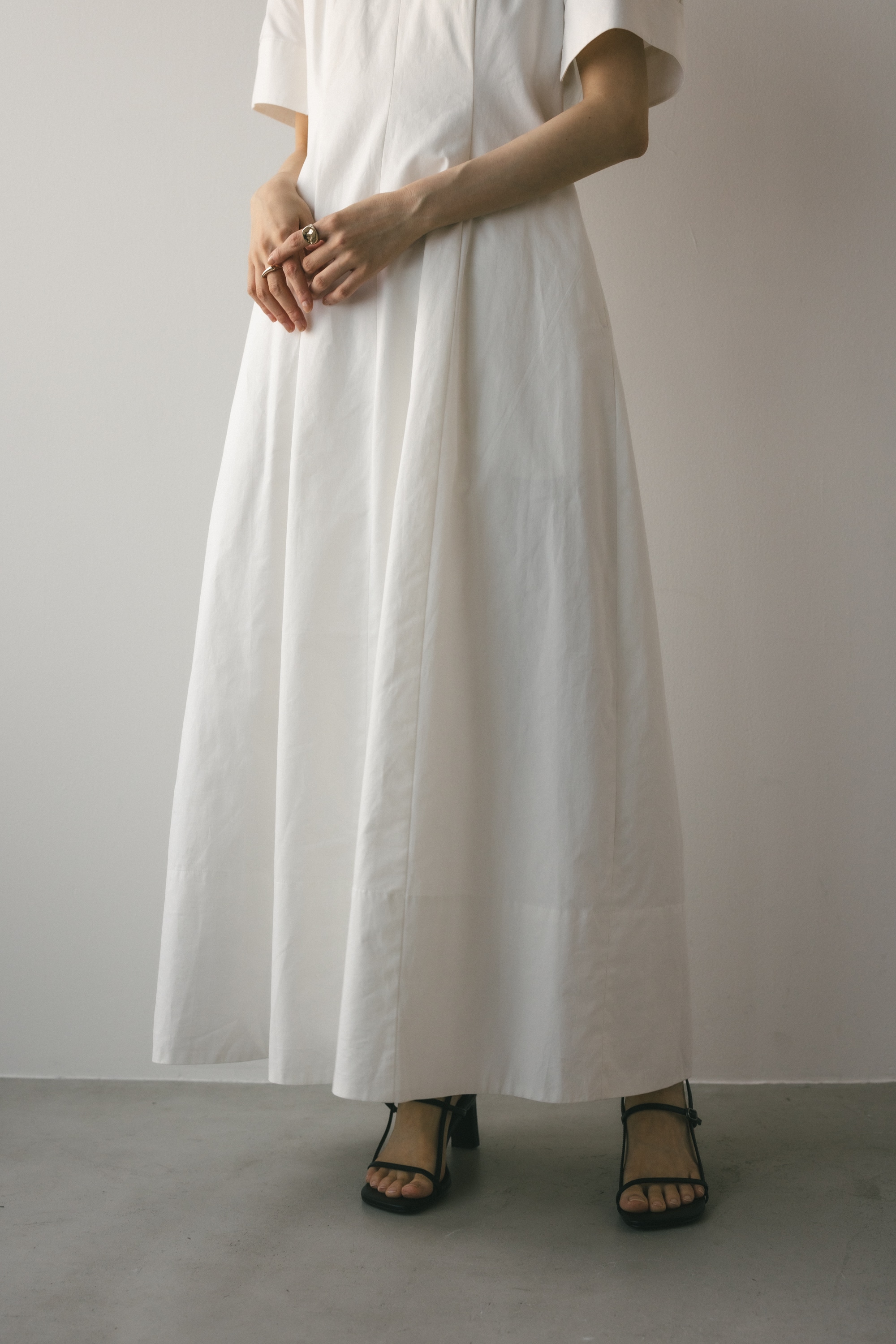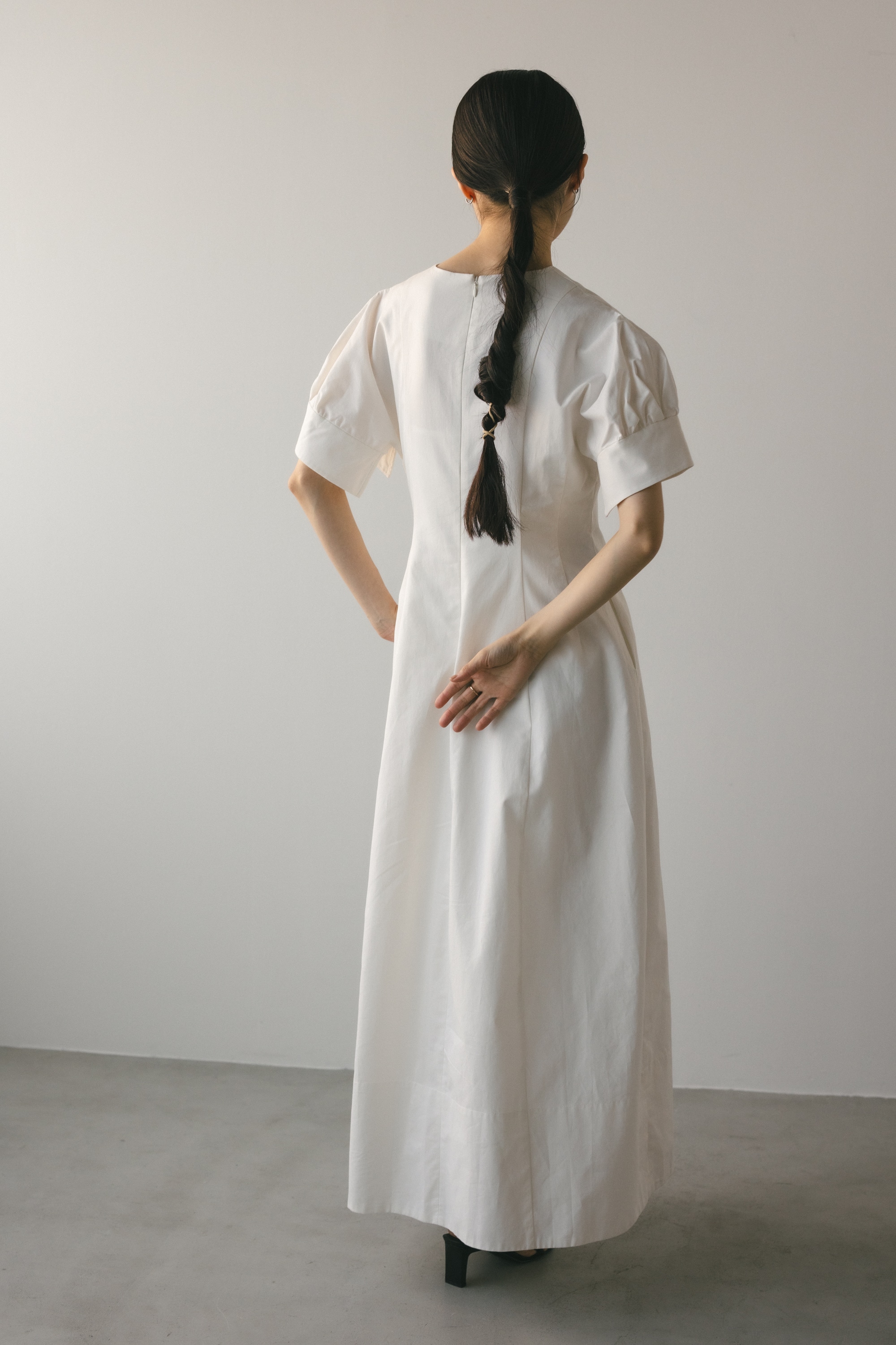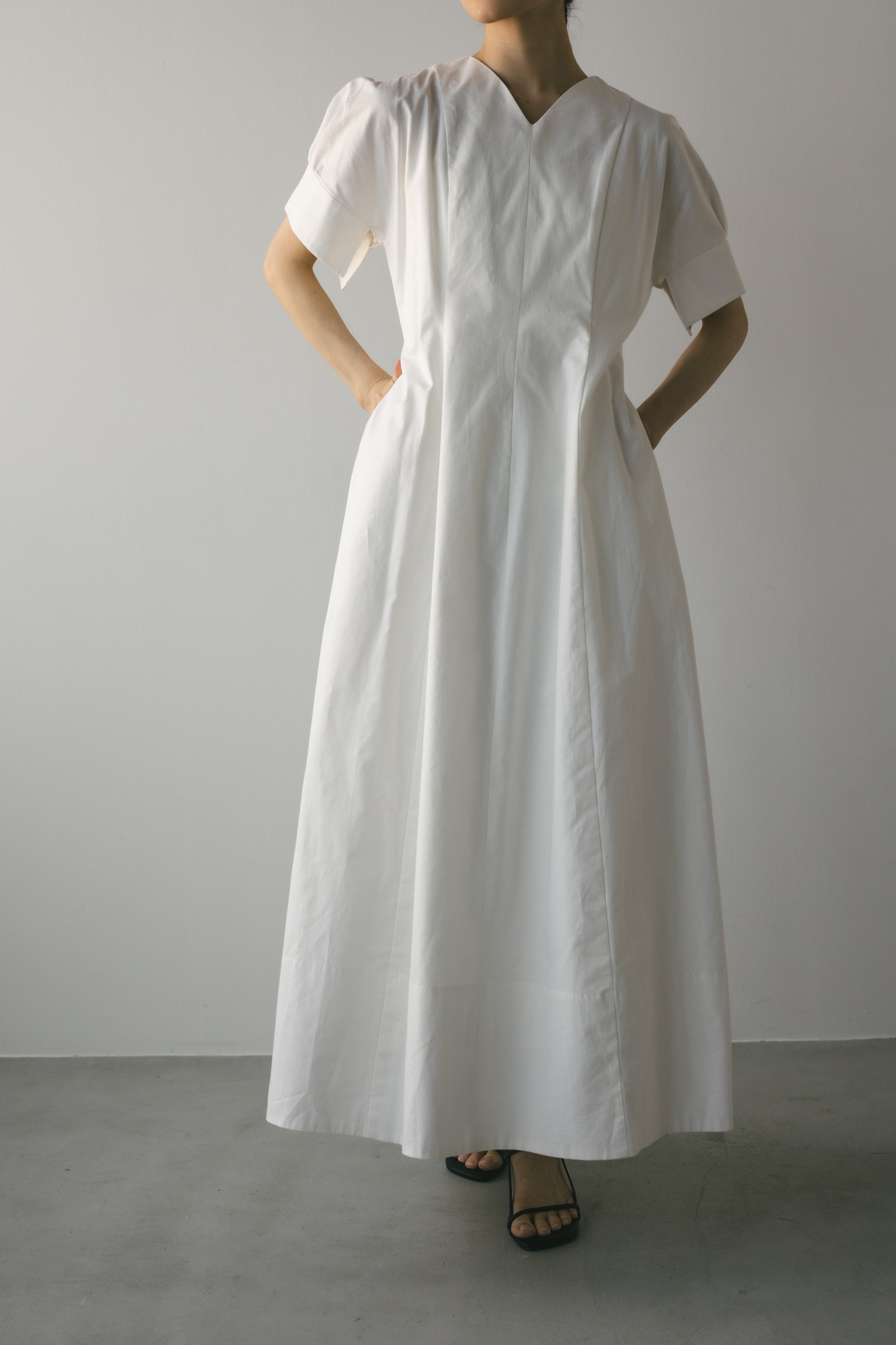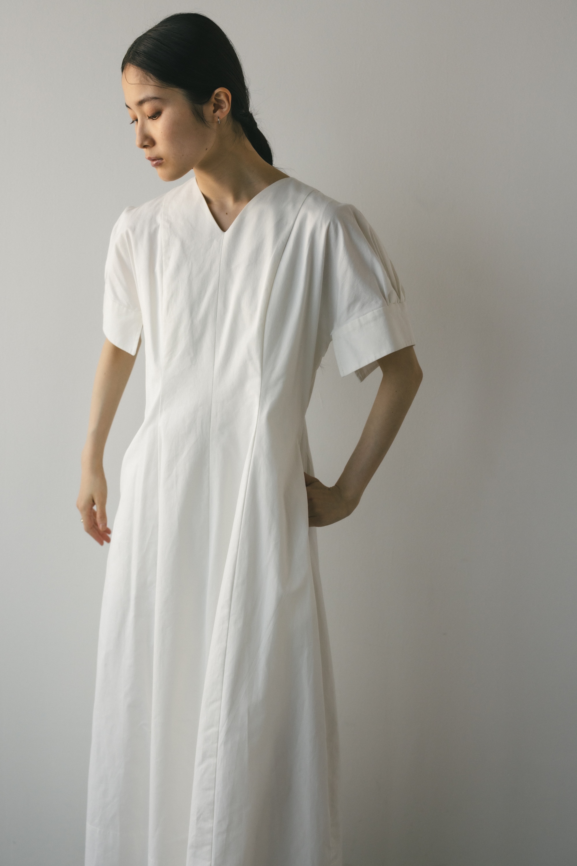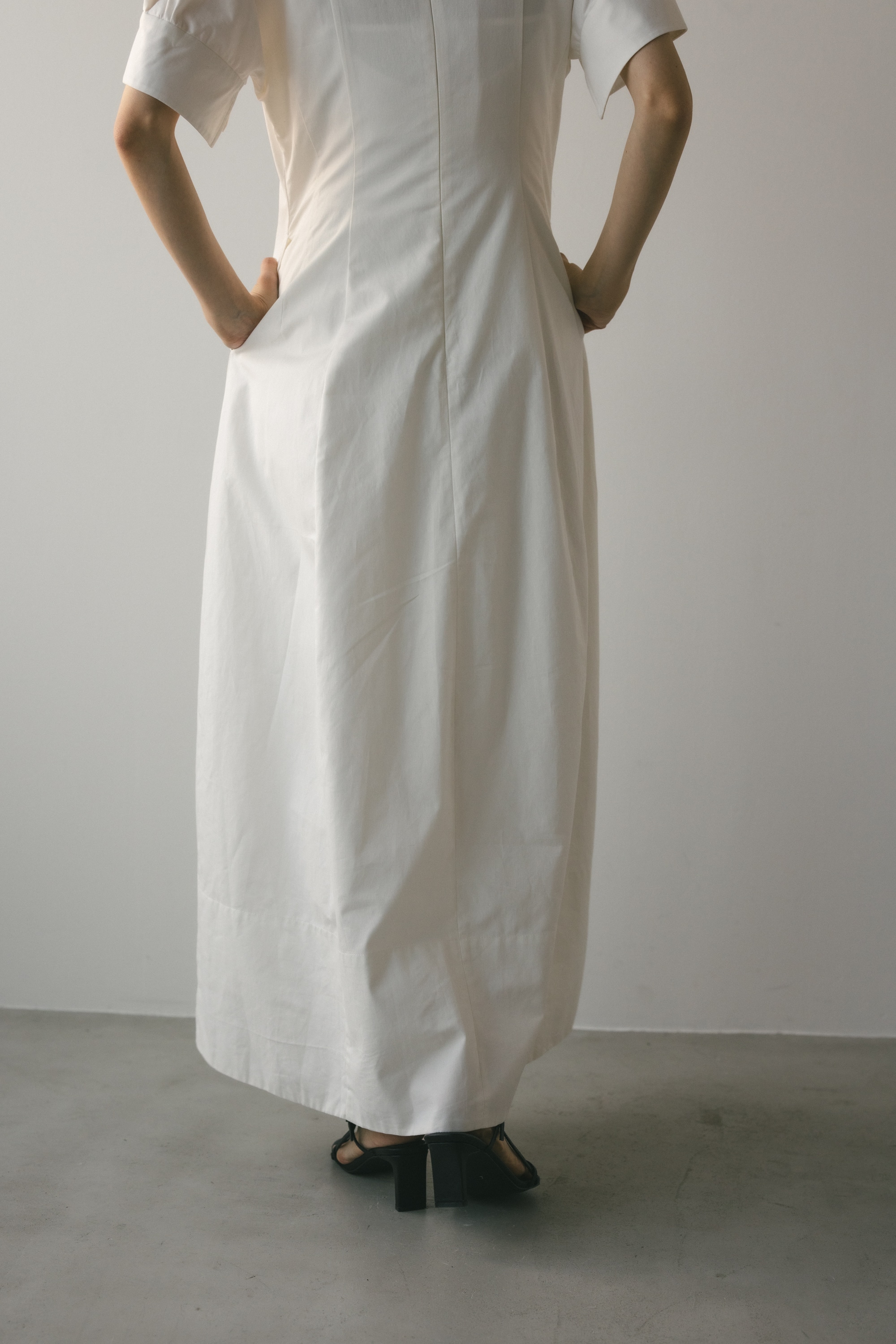 少し立ち上げた首元からラウンドしたVネックと肩からつながるバルーンシルエットがマニッシュモードなワンピース。