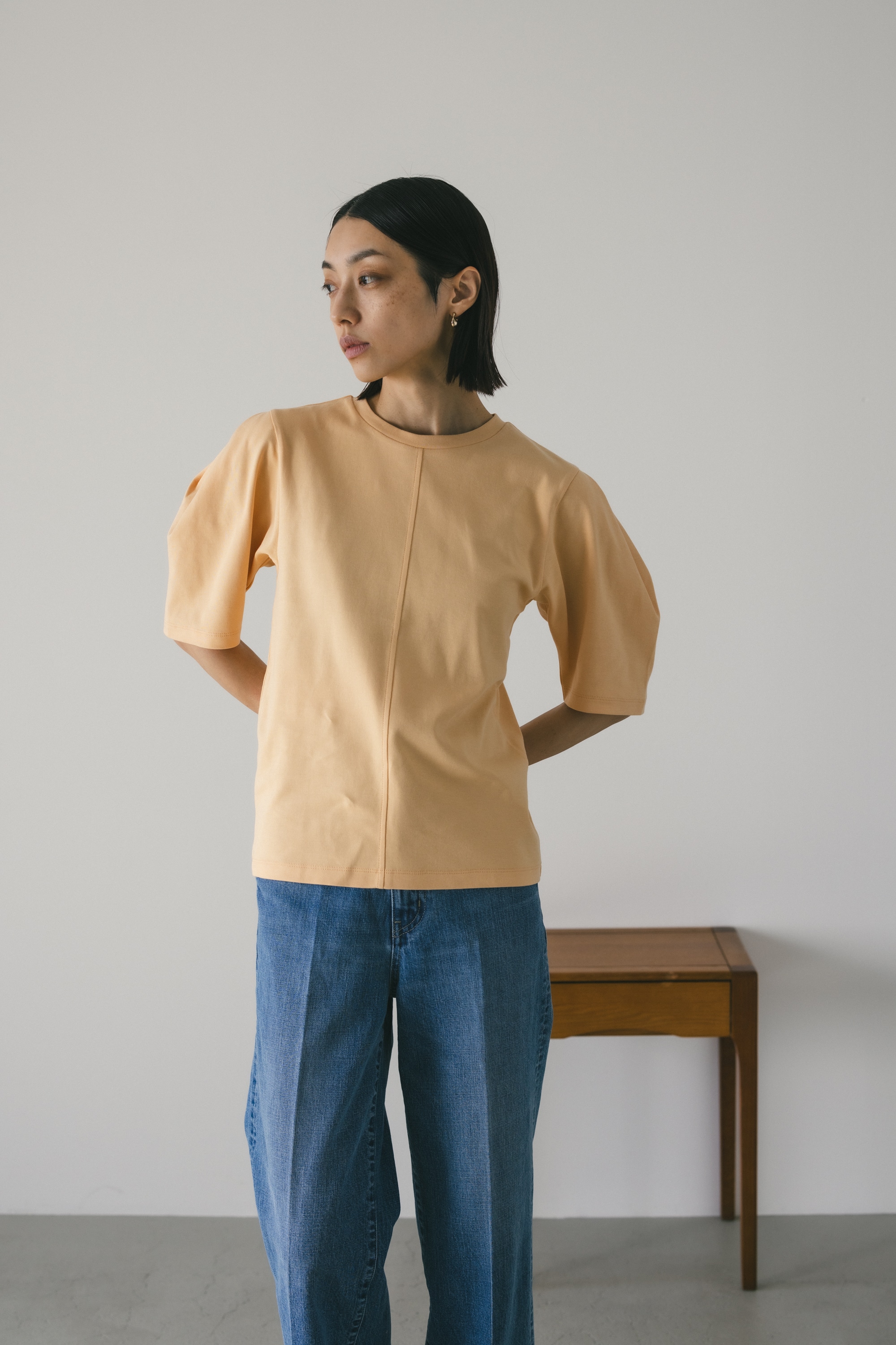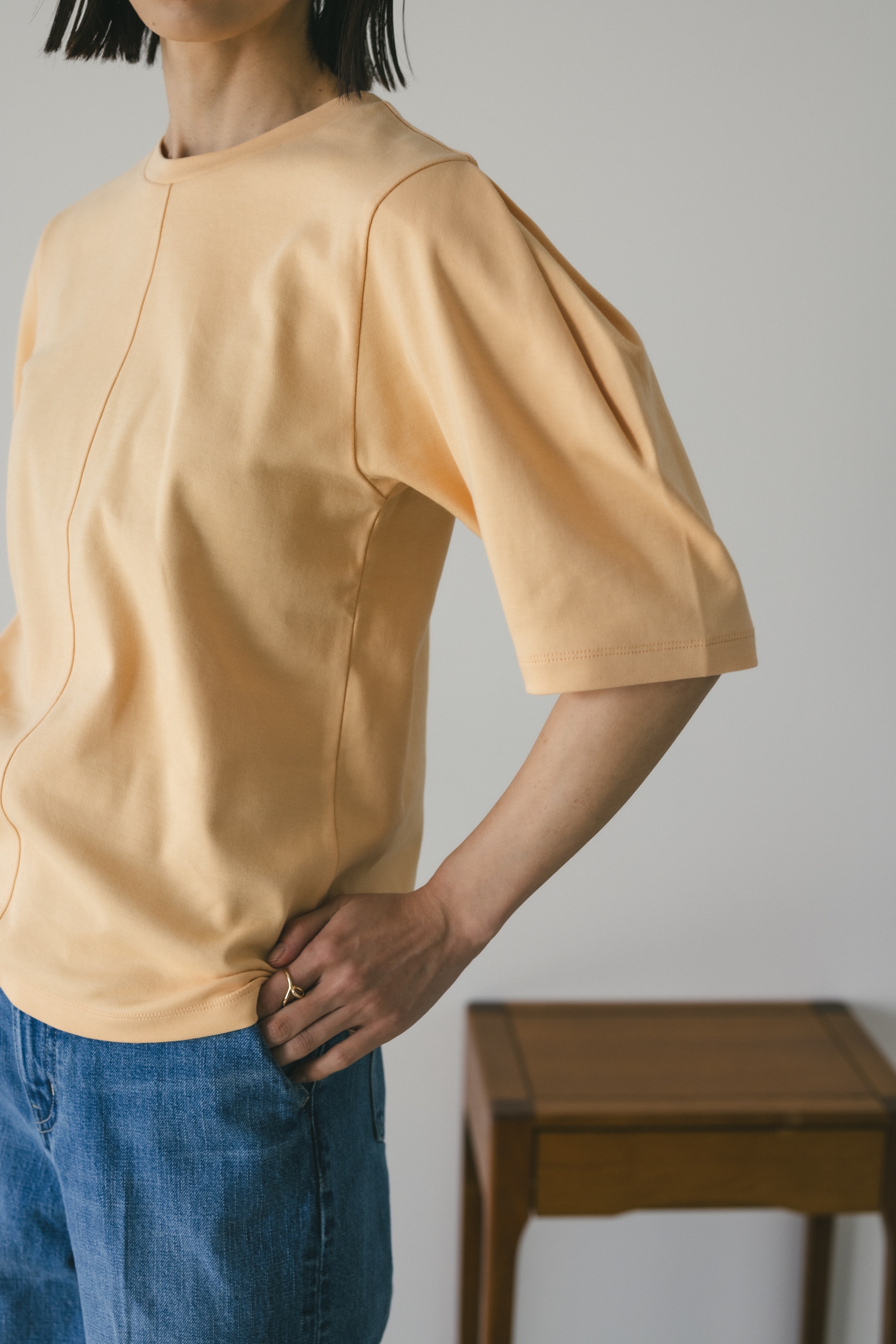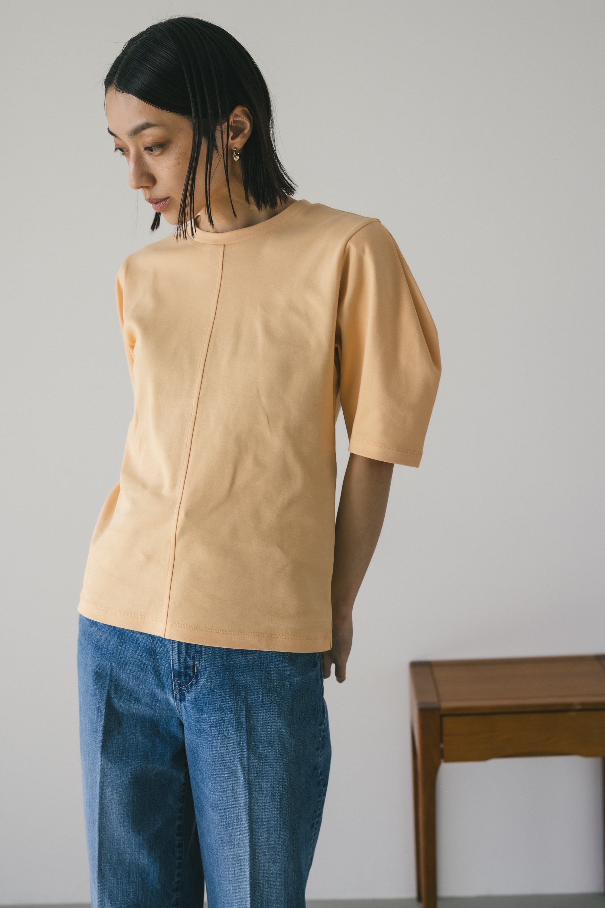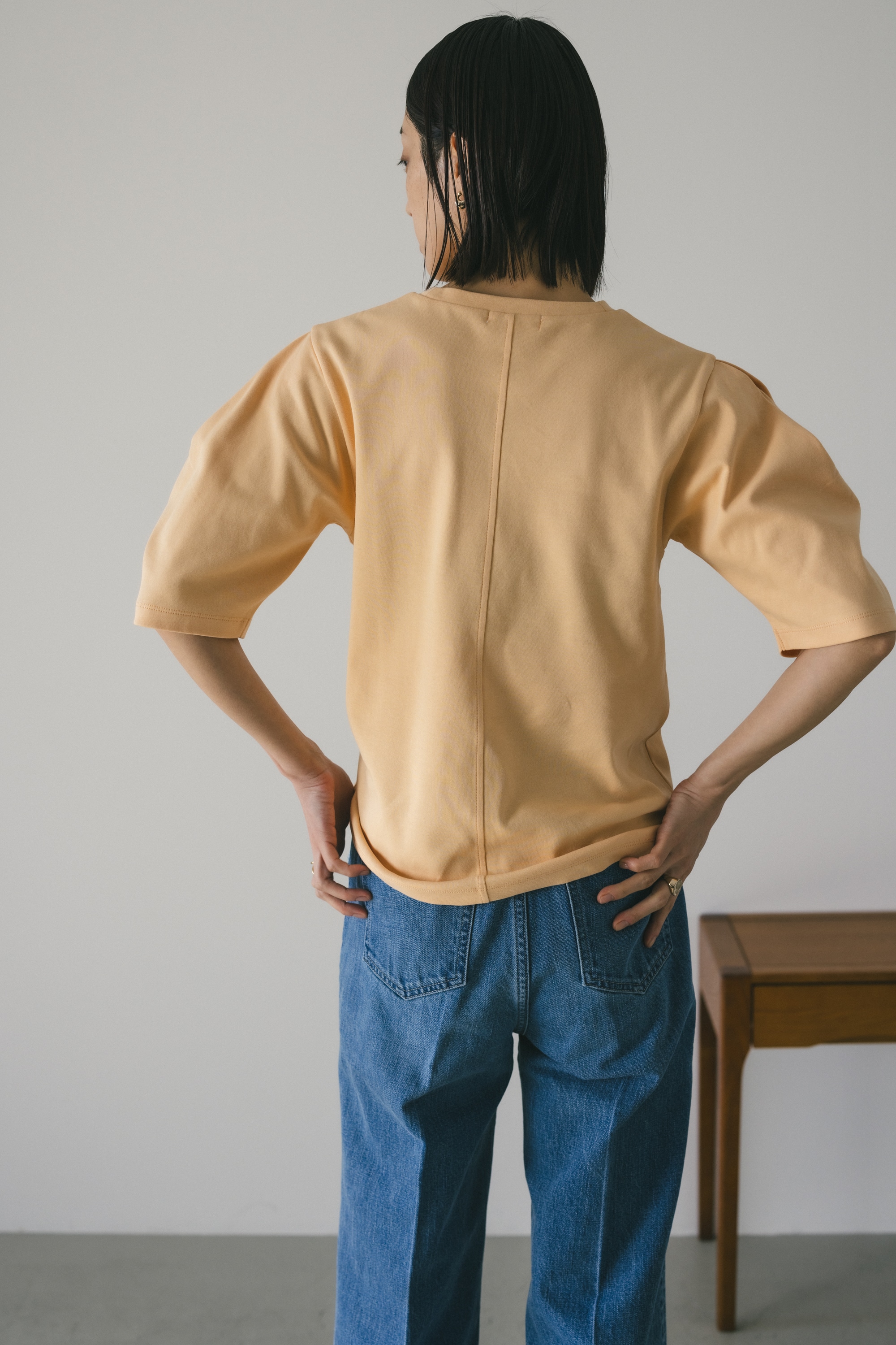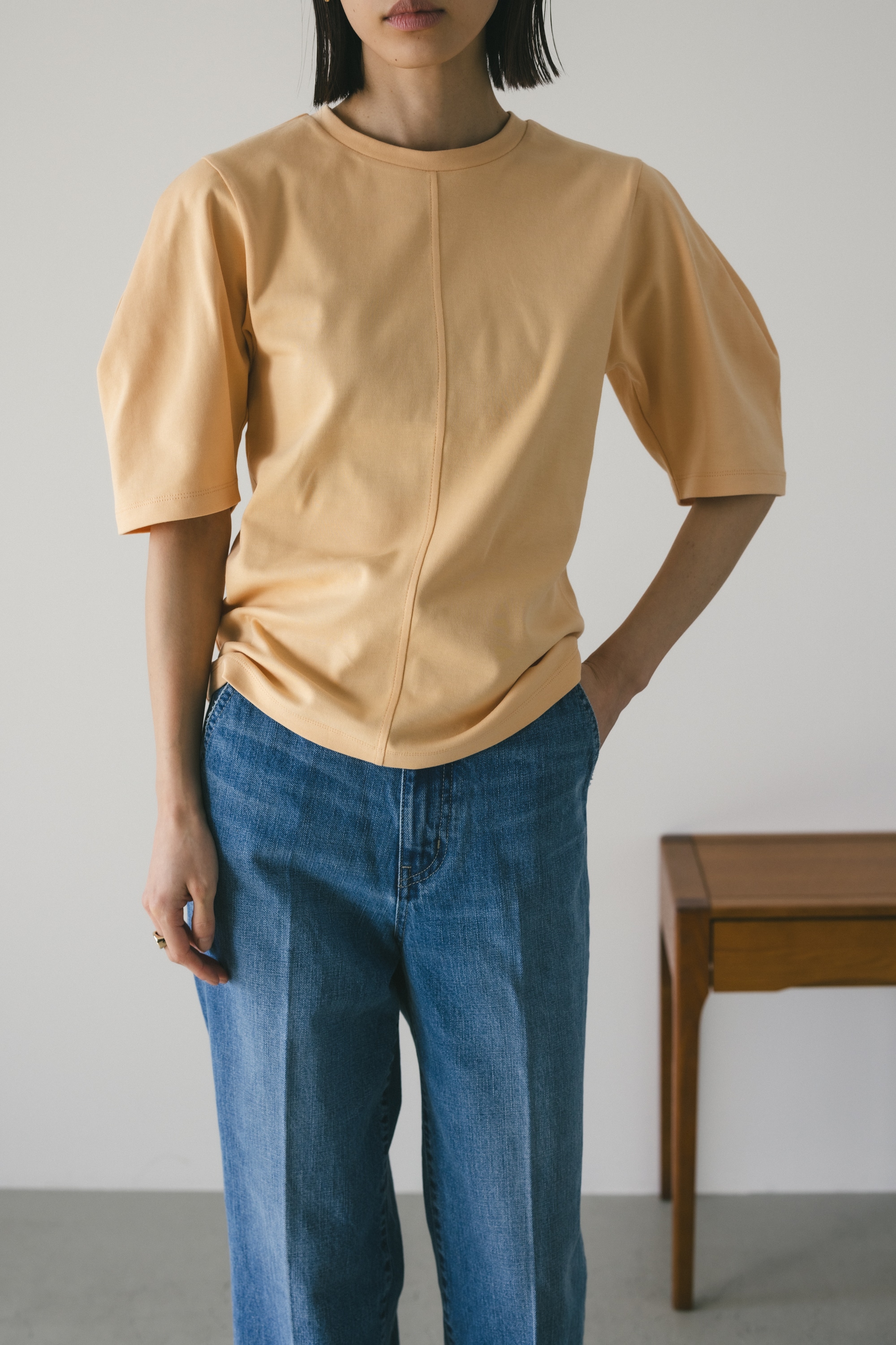 ややコンパクトめなシルエットでボトムを選ばず着用頂きやすい一枚です。