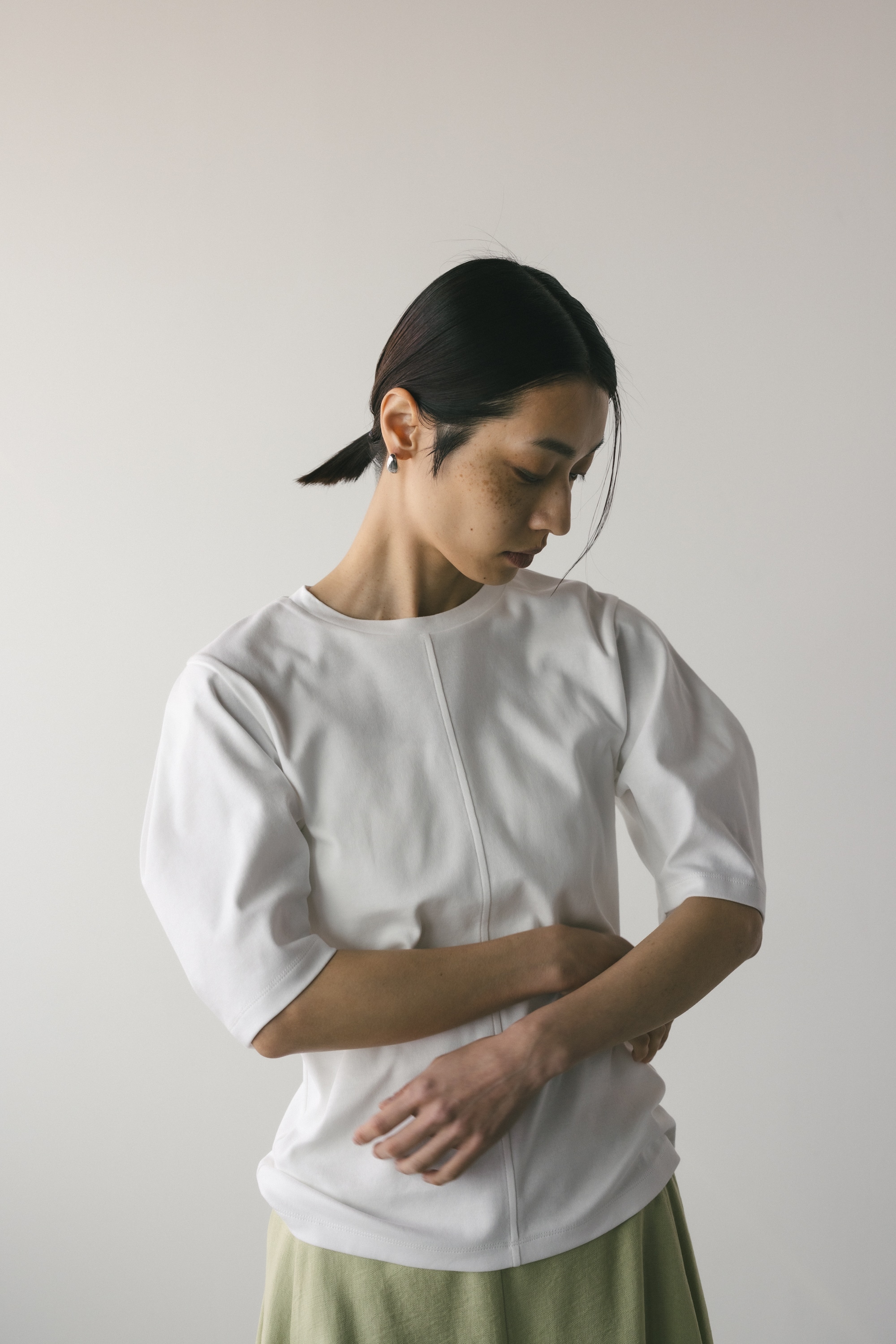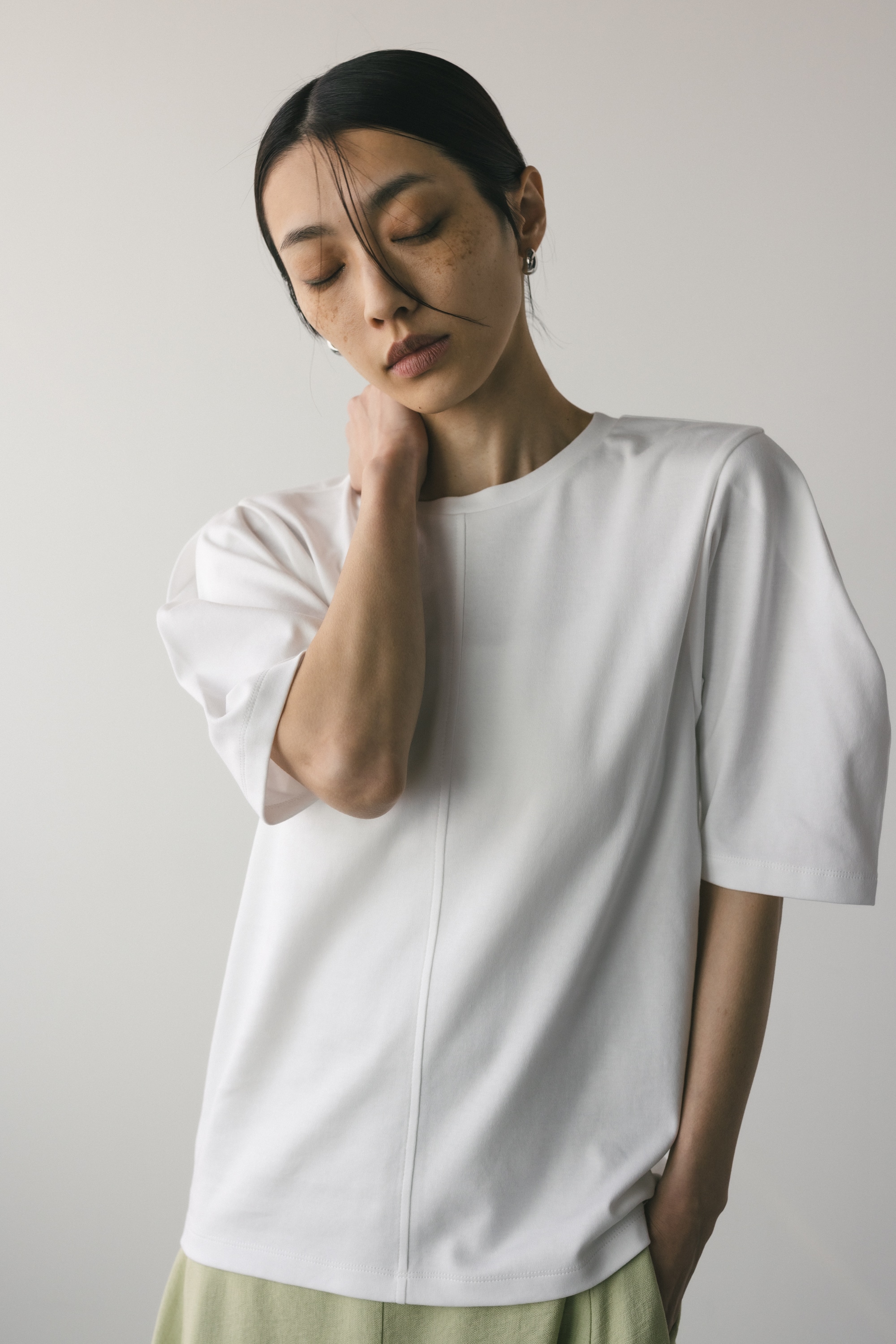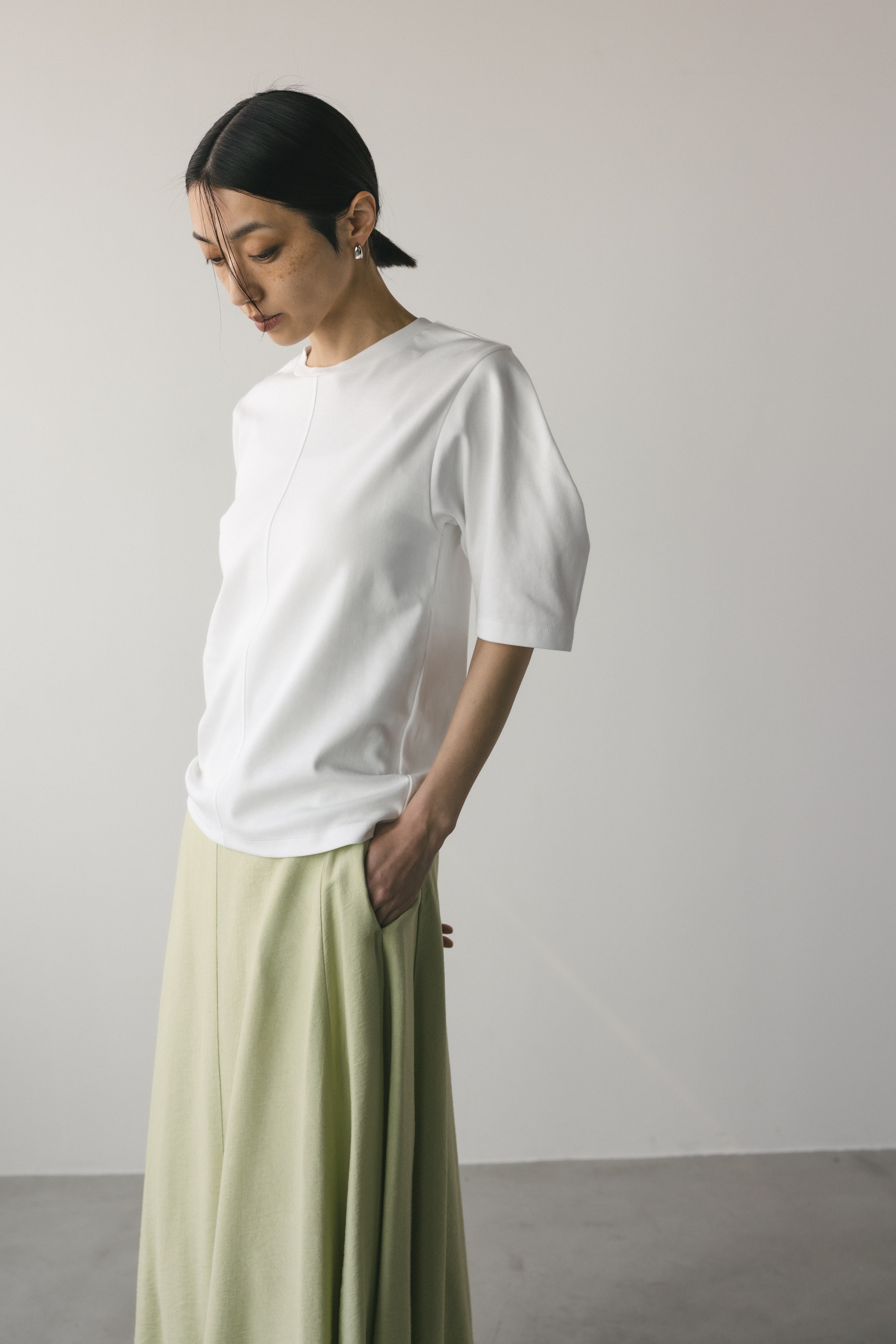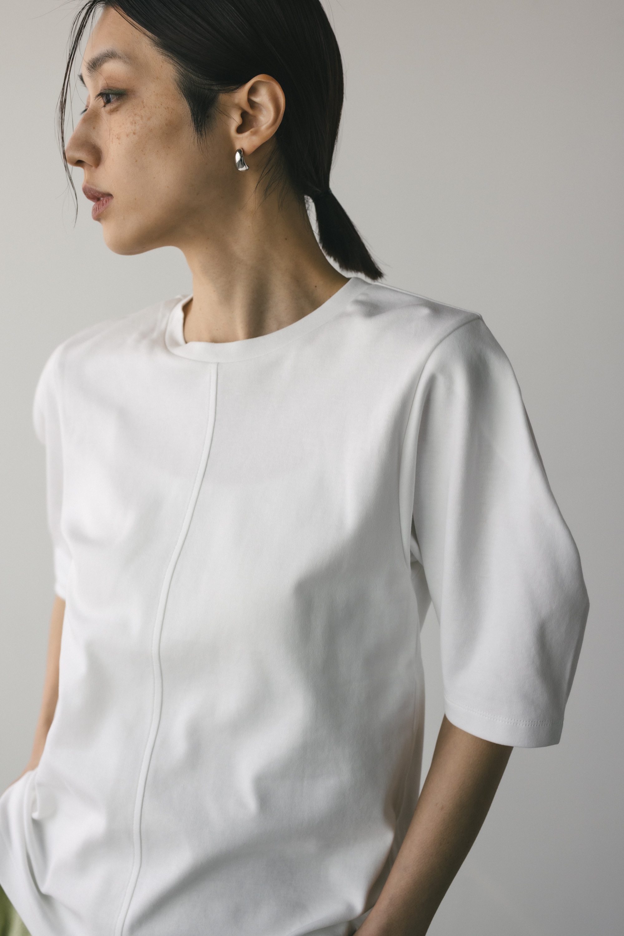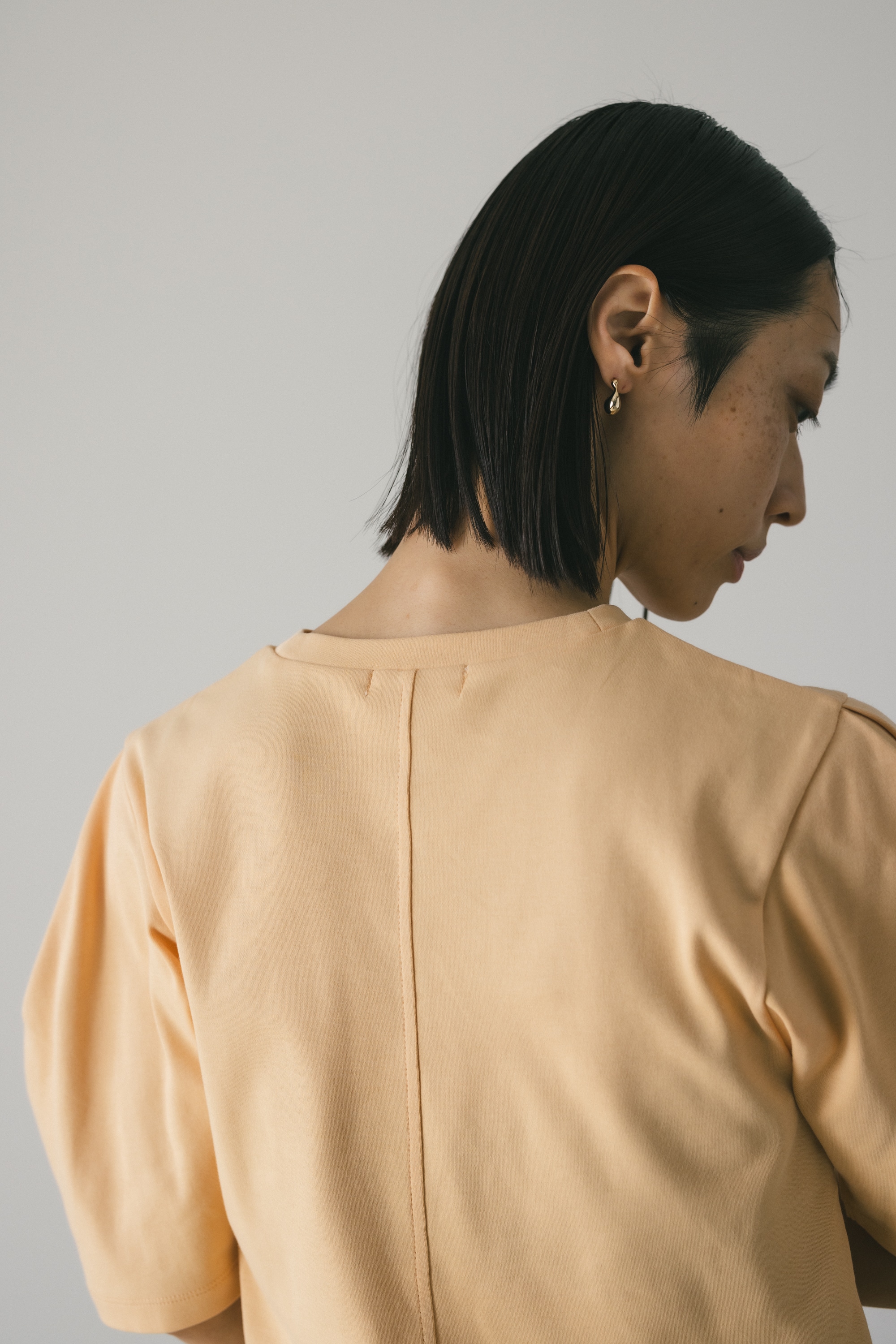 ややコンパクトめなシルエットでボトムを選ばず着用頂きやすい一枚です。