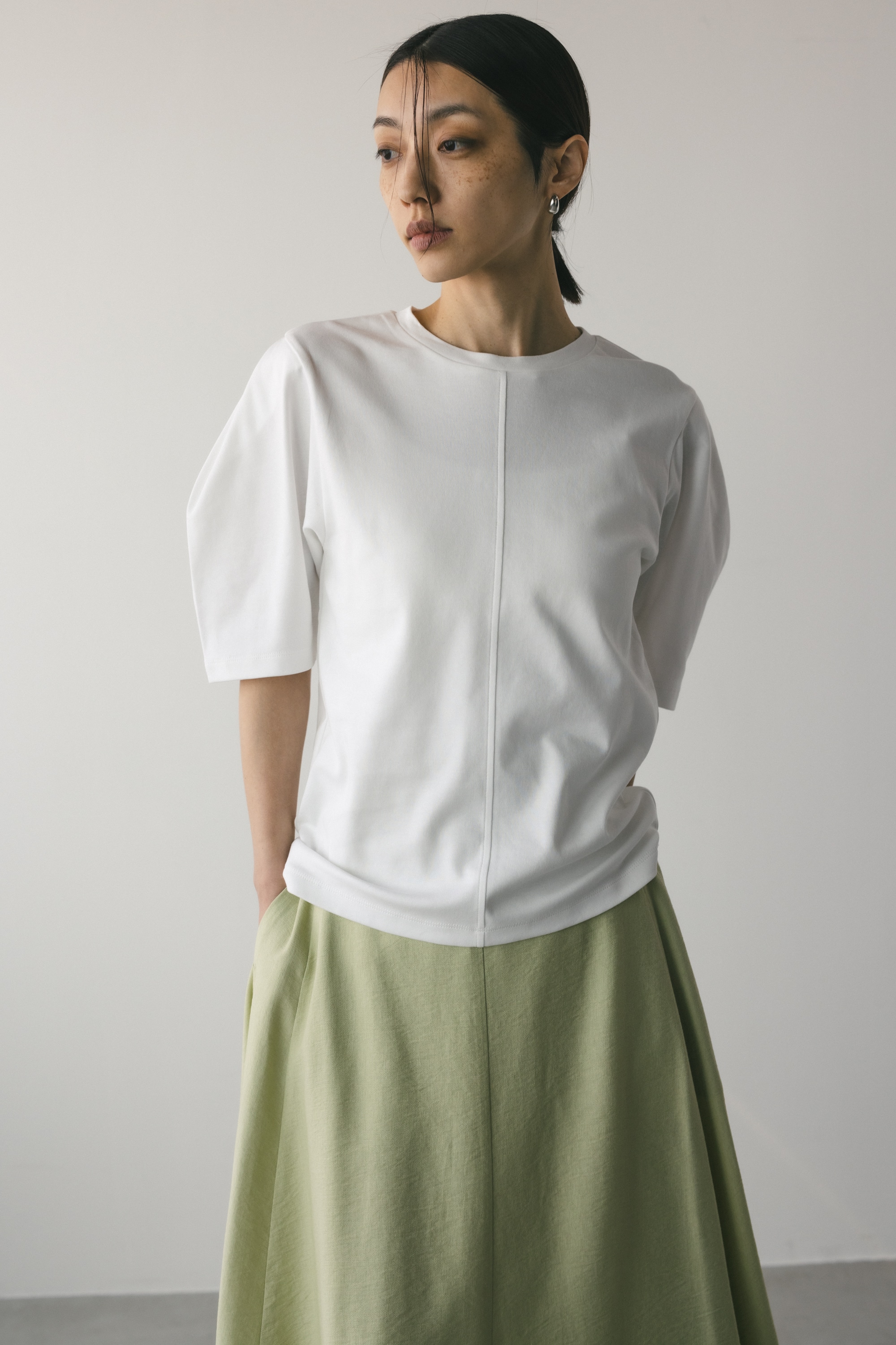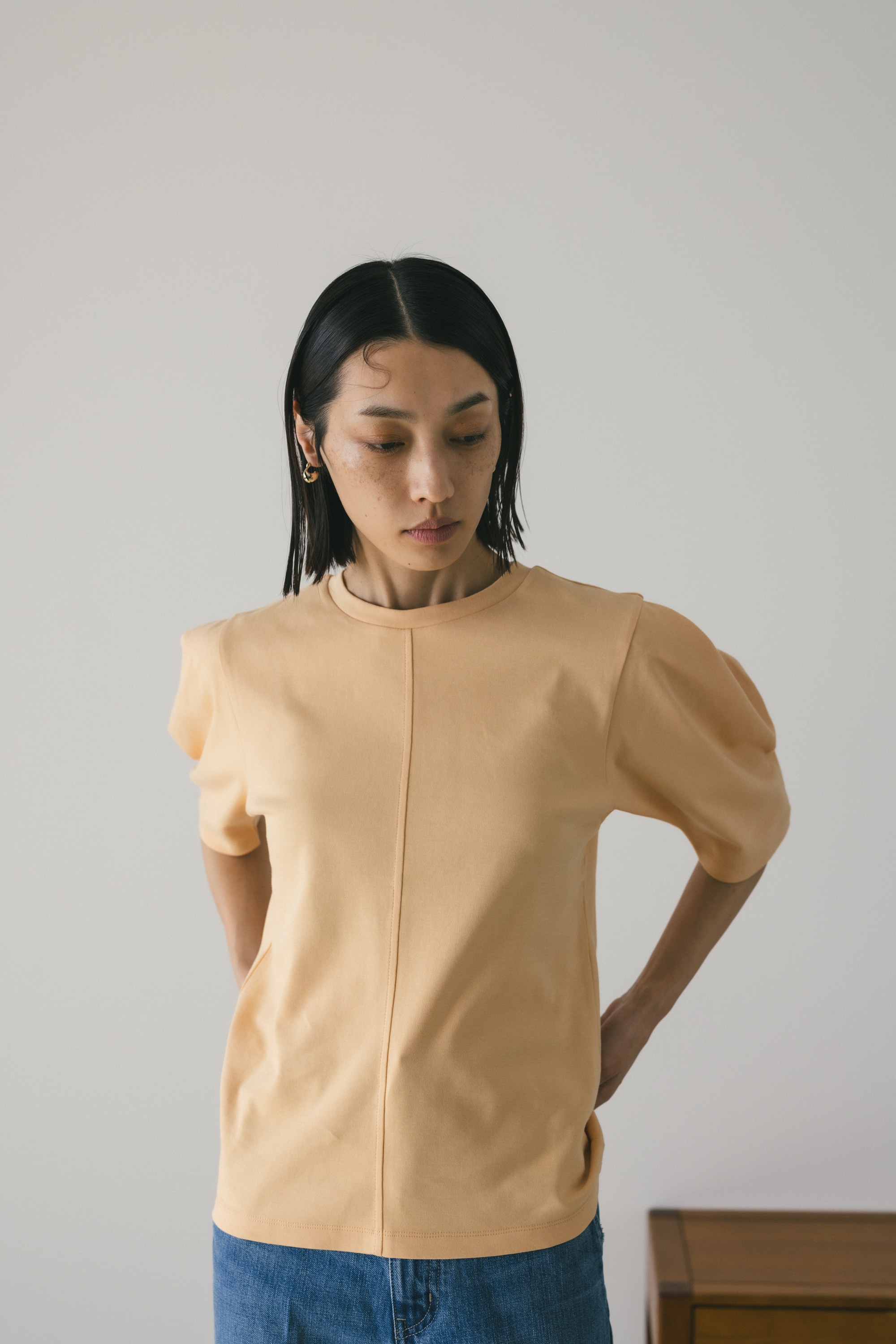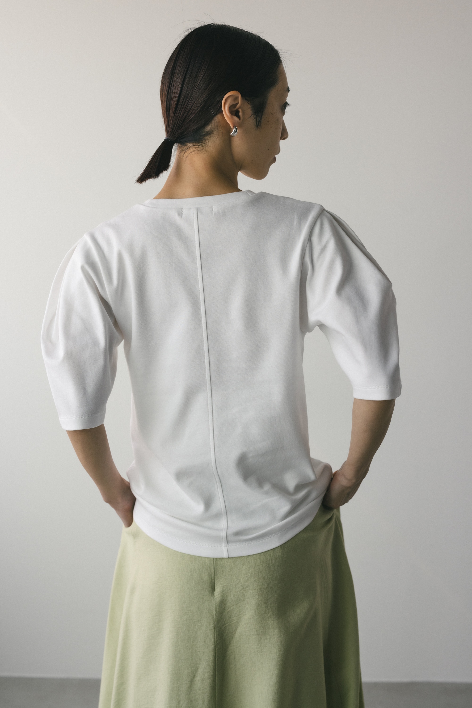 袖に大きく入ったタックスリーブシルエットがポイントのカットトップ。