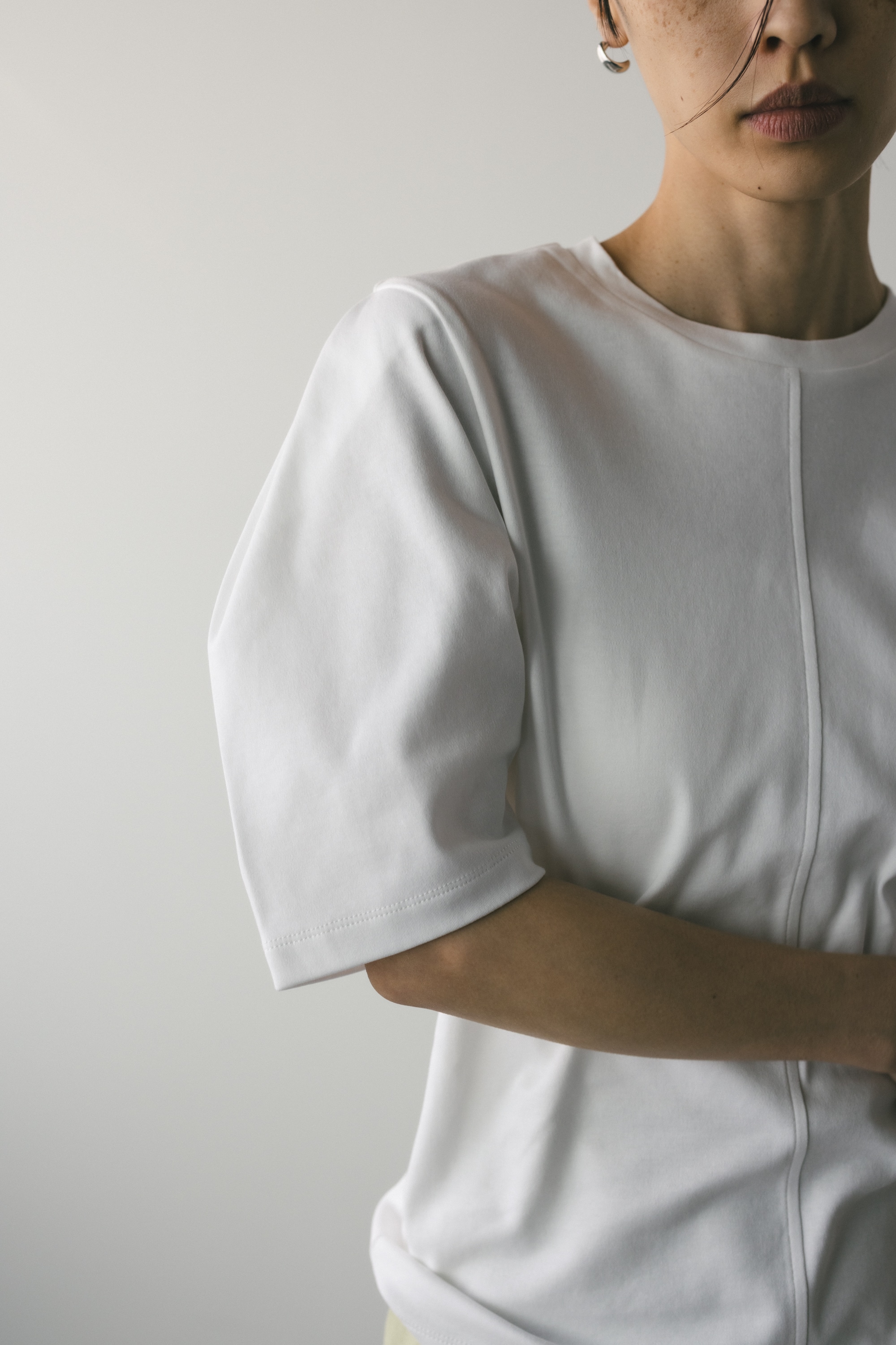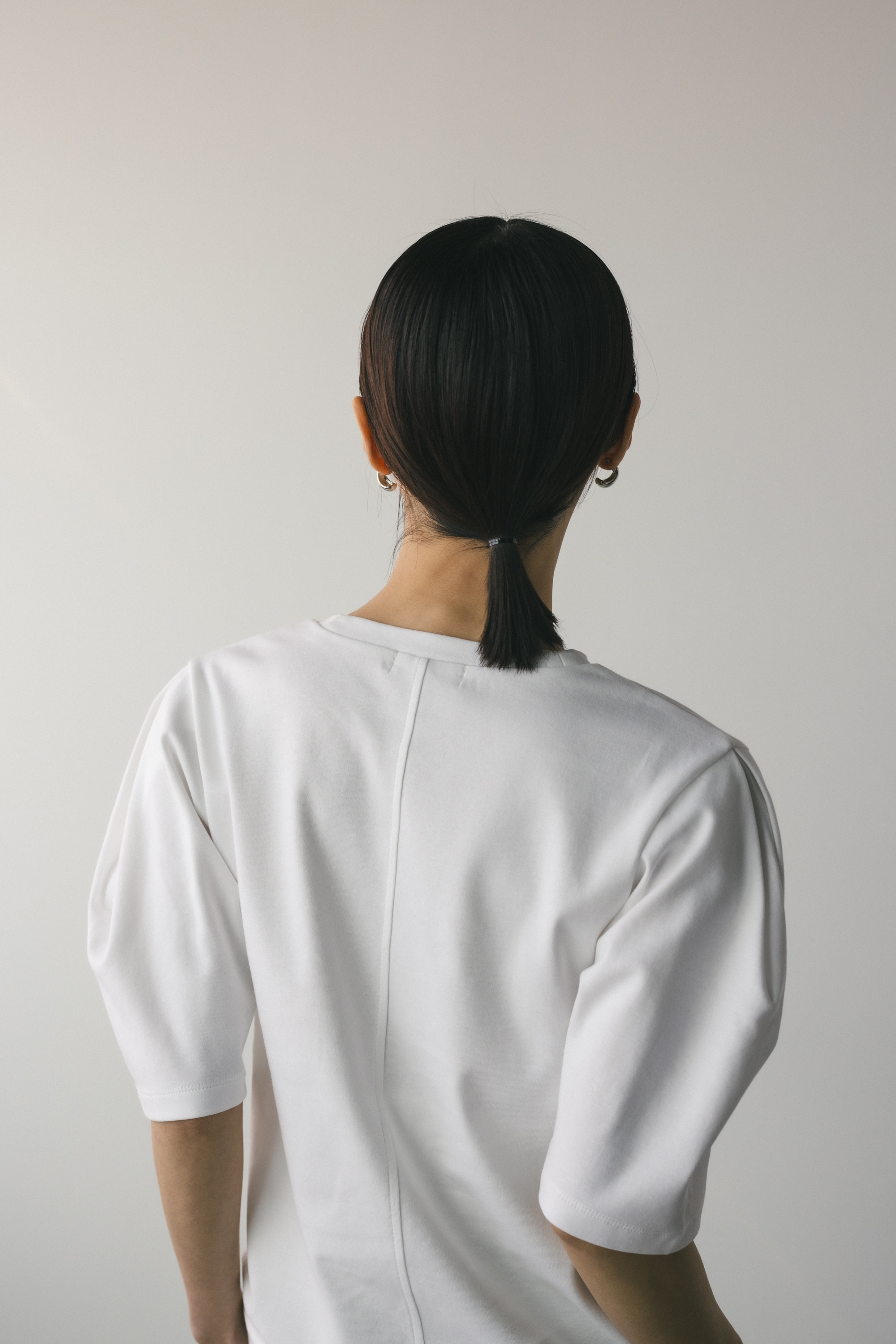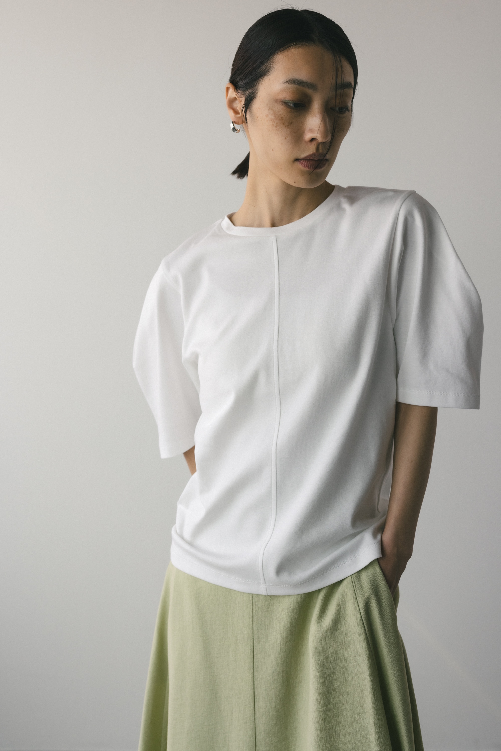 袖に大きく入ったタックスリーブシルエットがポイントのカットトップ。