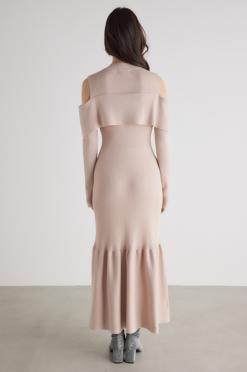 また、ハイネックのニットワンピースにオフショルダーの襟をレイヤードしている様なデザインが、さりげない肌見せと今っぽさを兼ね備えた雰囲気に仕上げたのもPoint。