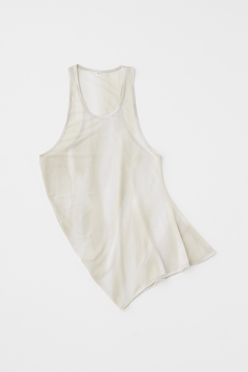 裾がアシンメトリーデザインになっているタンクトップは、着用することで自然にシワができるのも魅力。
