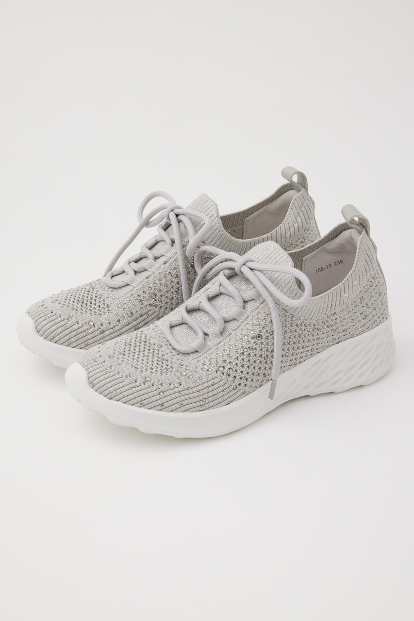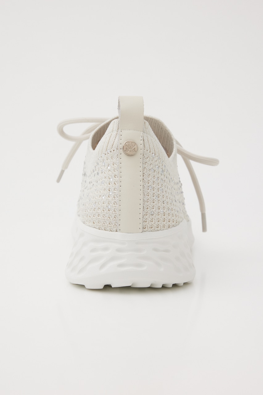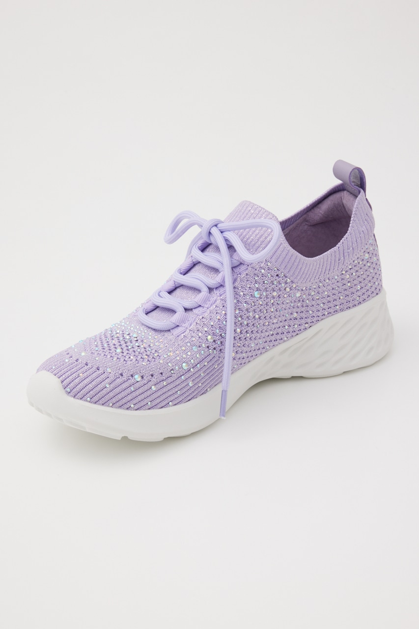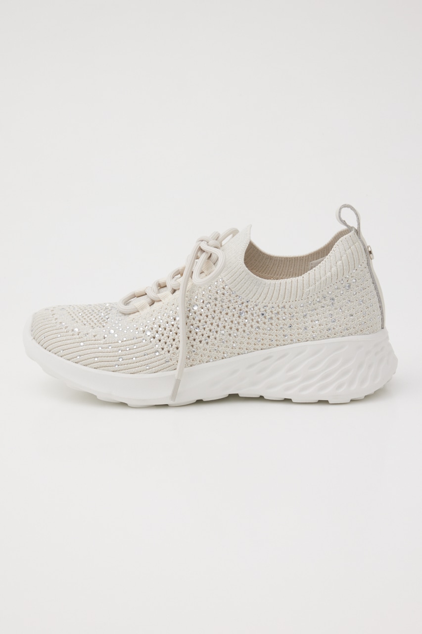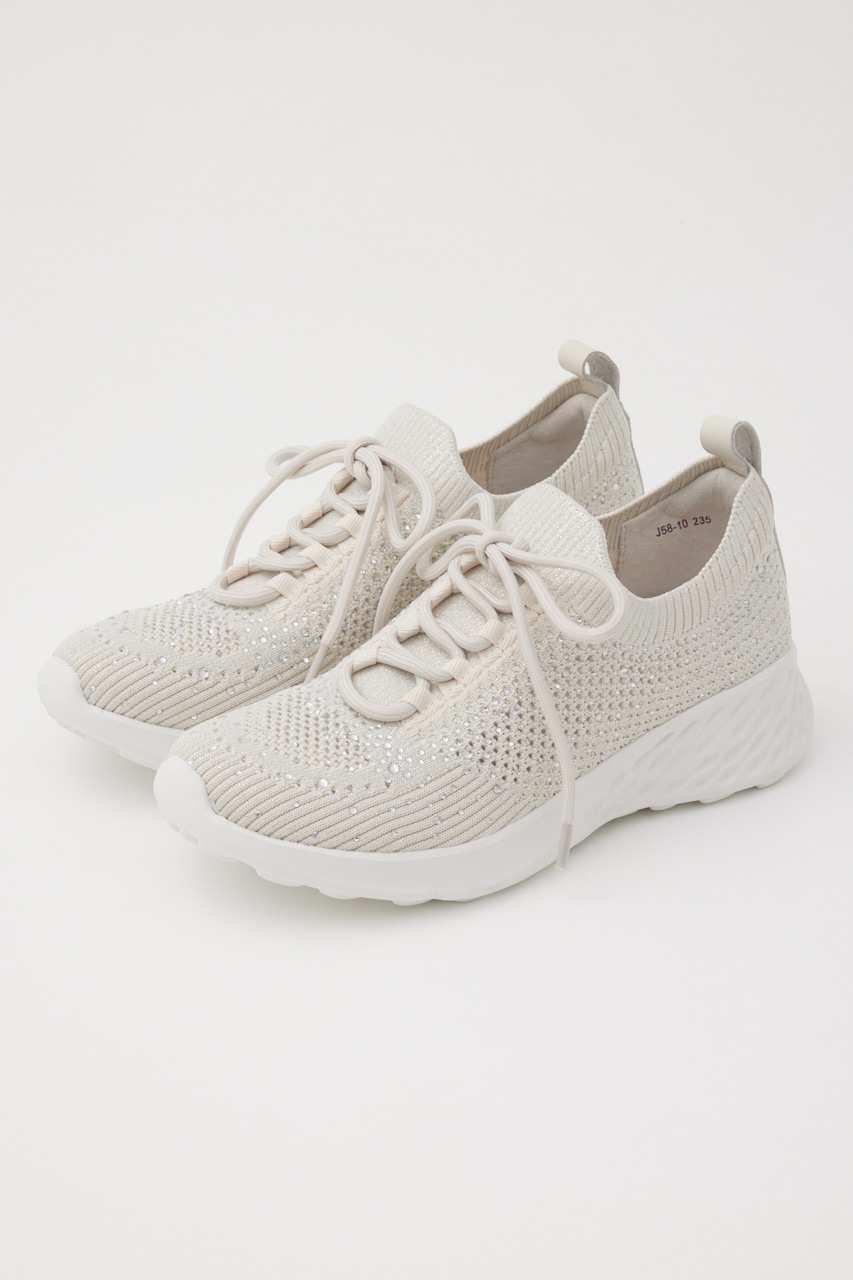 人気のレースアップスリッポンに新デザインが登場。華やかなダイヤカットのクリスタルストーンを散りばめ、通気性も良いラメ混のメッシュニット地に軽量なランニング風ソールで軽快な履き心地を実現。シューレスはデザインなのでスリッポンタイプでそのまま履いていただけます。