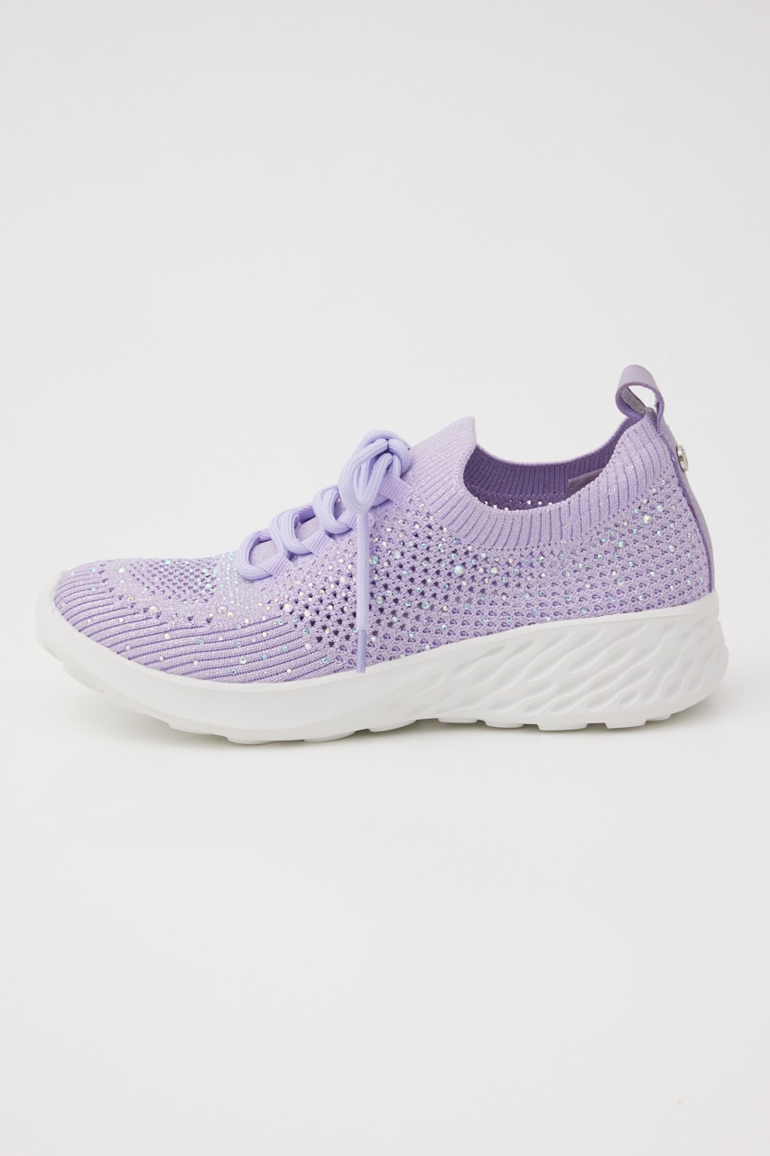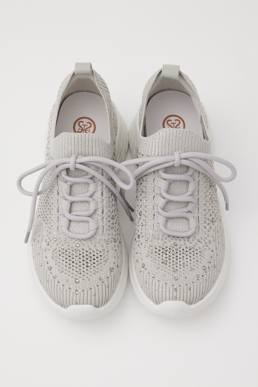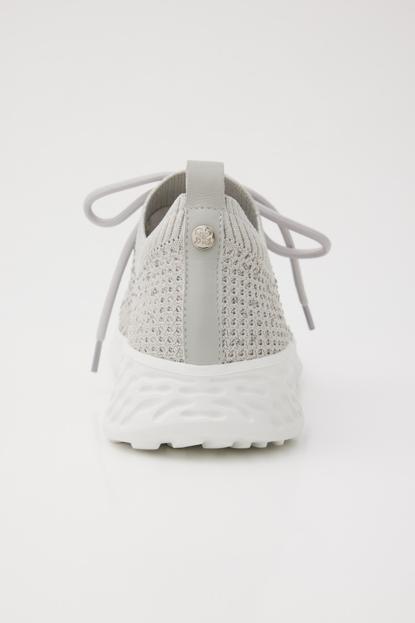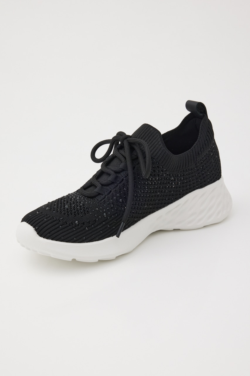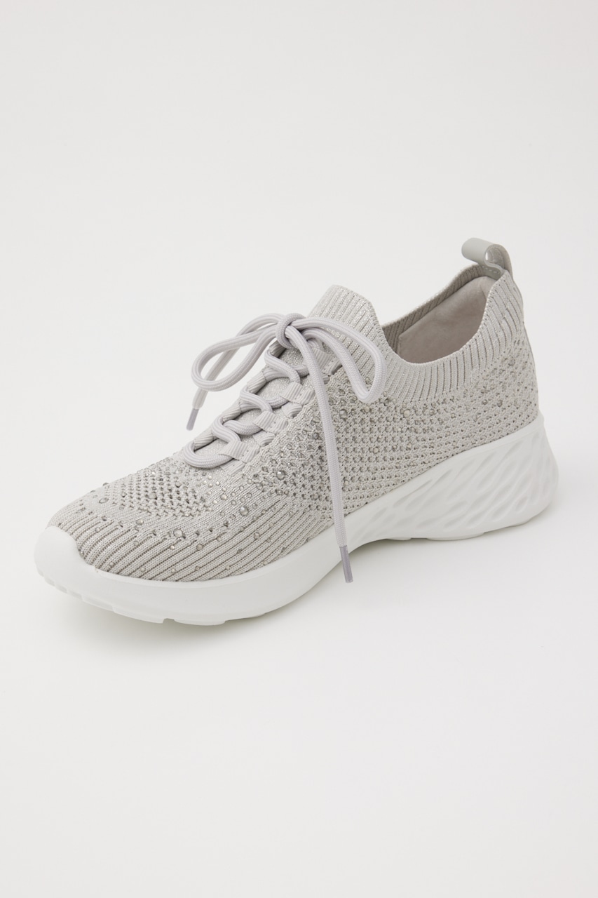 人気のレースアップスリッポンに新デザインが登場。華やかなダイヤカットのクリスタルストーンを散りばめ、通気性も良いラメ混のメッシュニット地に軽量なランニング風ソールで軽快な履き心地を実現。シューレスはデザインなのでスリッポンタイプでそのまま履いていただけます。