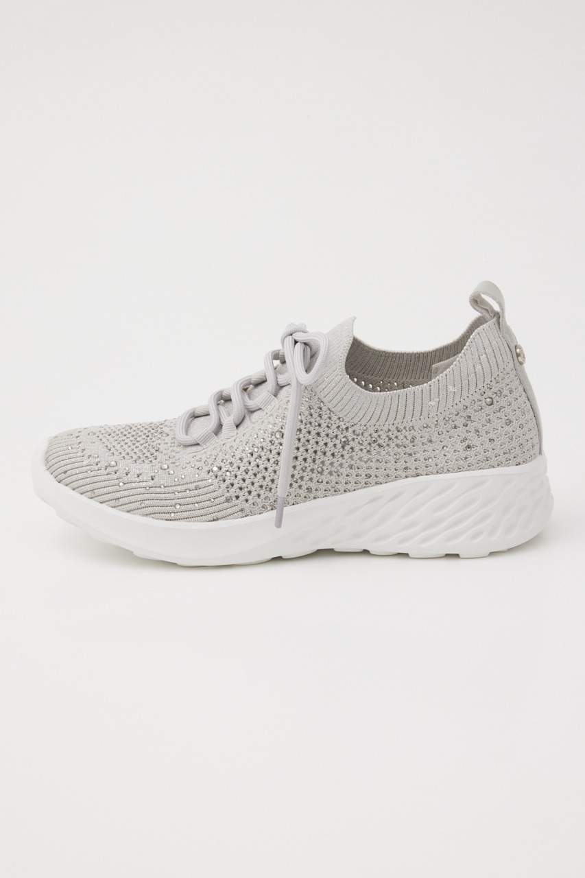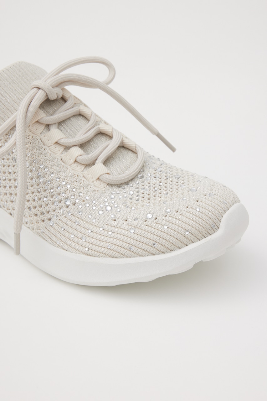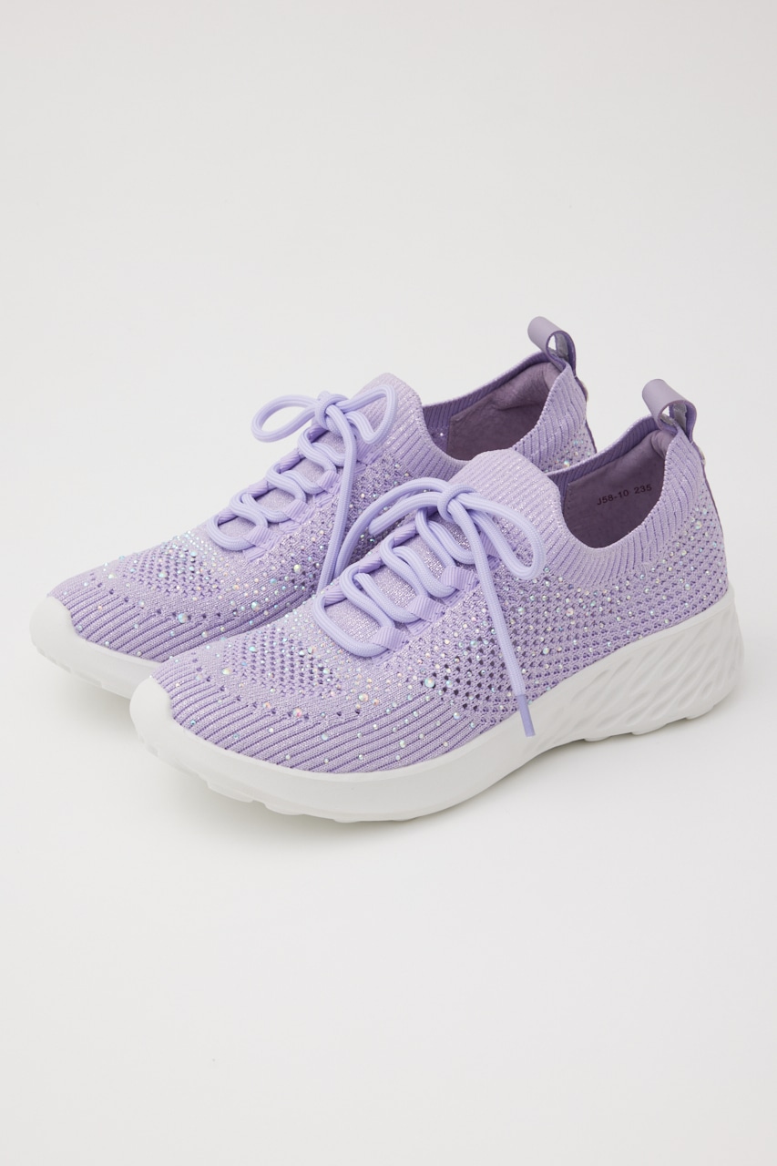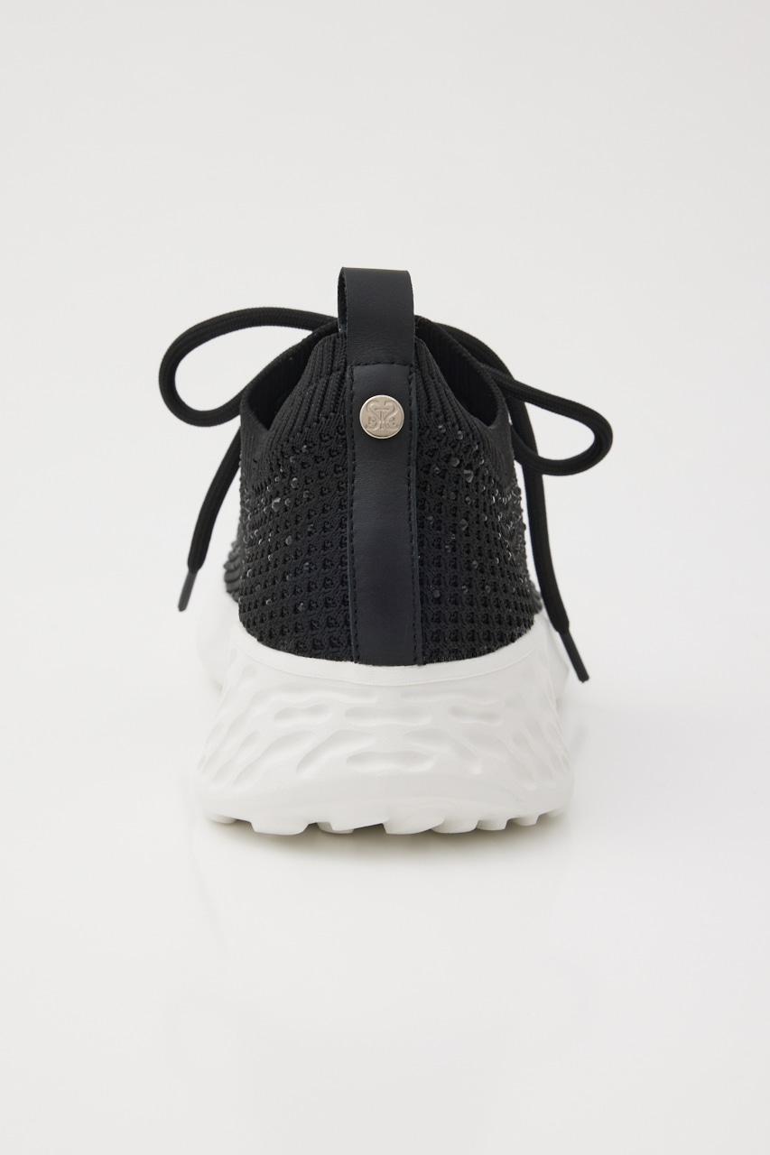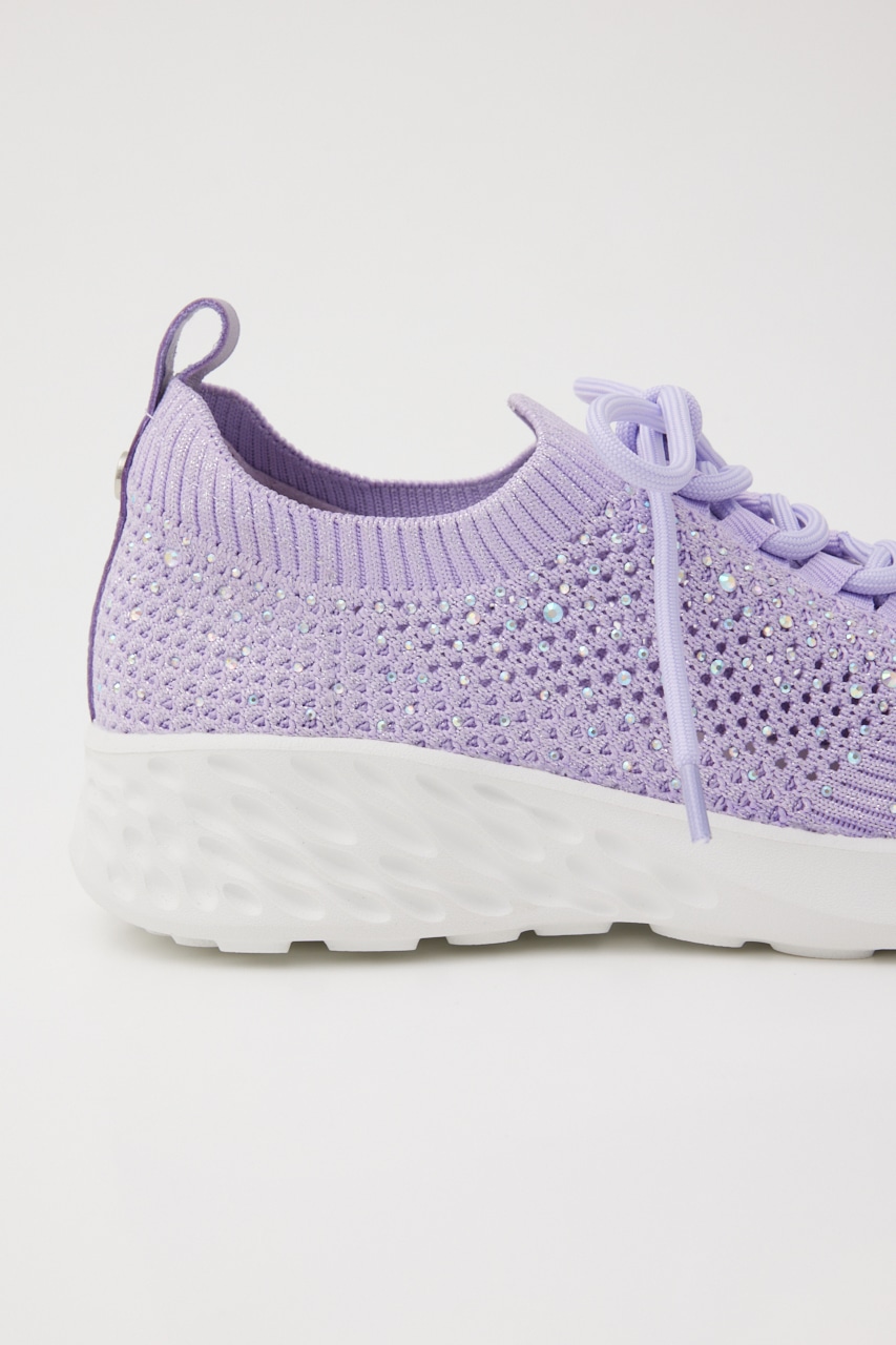 人気のレースアップスリッポンに新デザインが登場。華やかなダイヤカットのクリスタルストーンを散りばめ、通気性も良いラメ混のメッシュニット地に軽量なランニング風ソールで軽快な履き心地を実現。シューレスはデザインなのでスリッポンタイプでそのまま履いていただけます。
