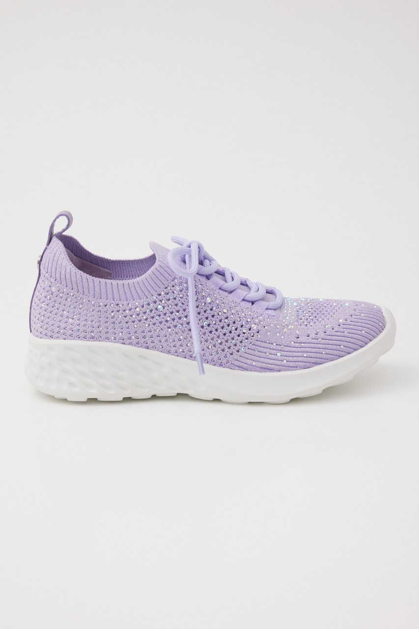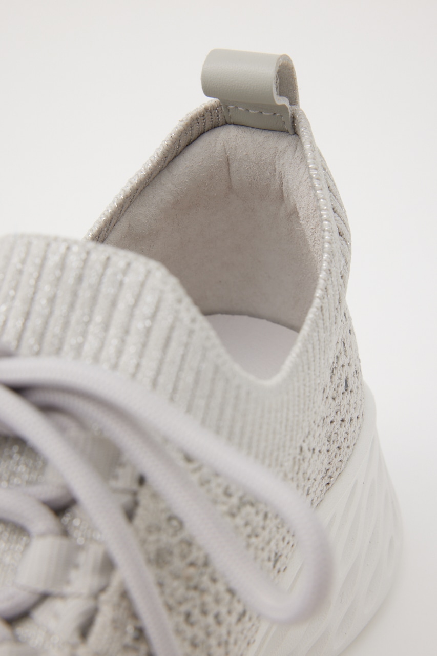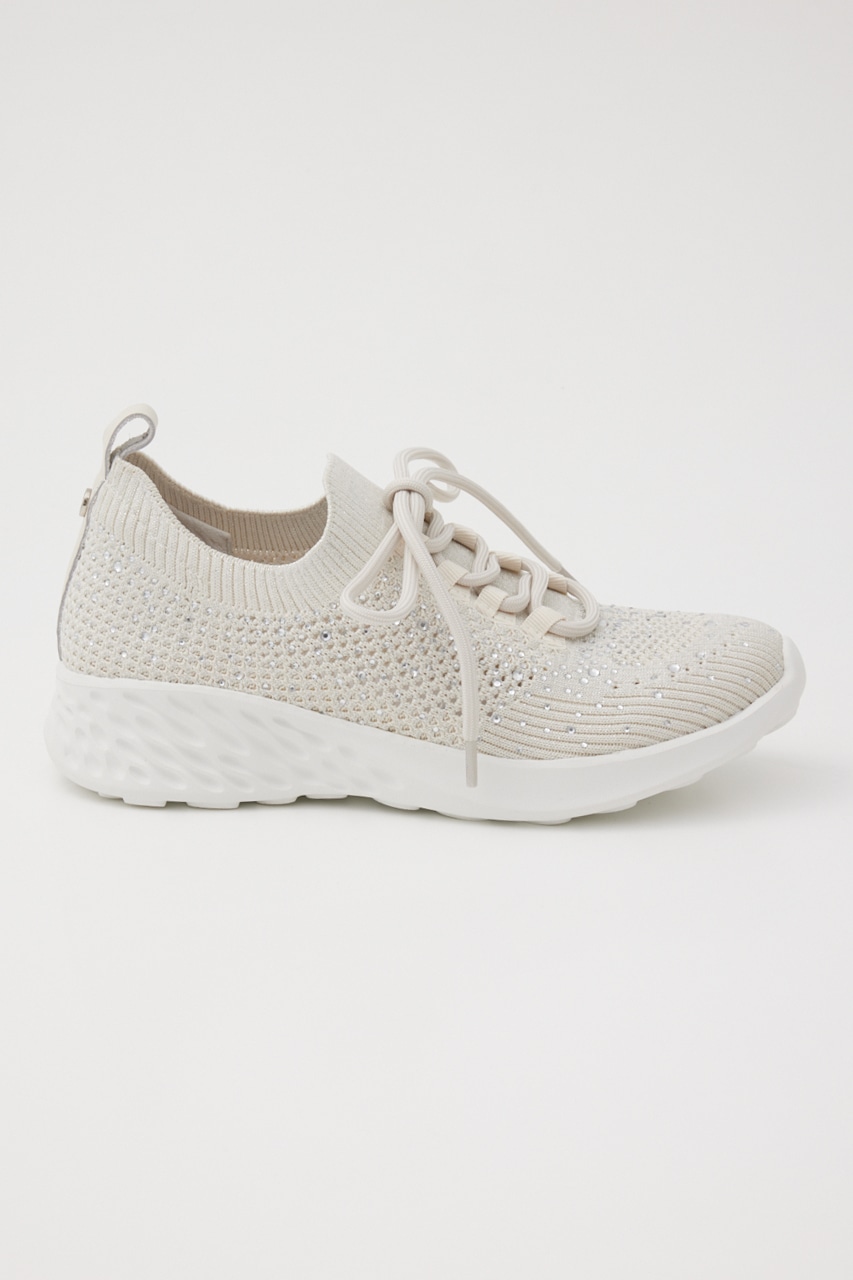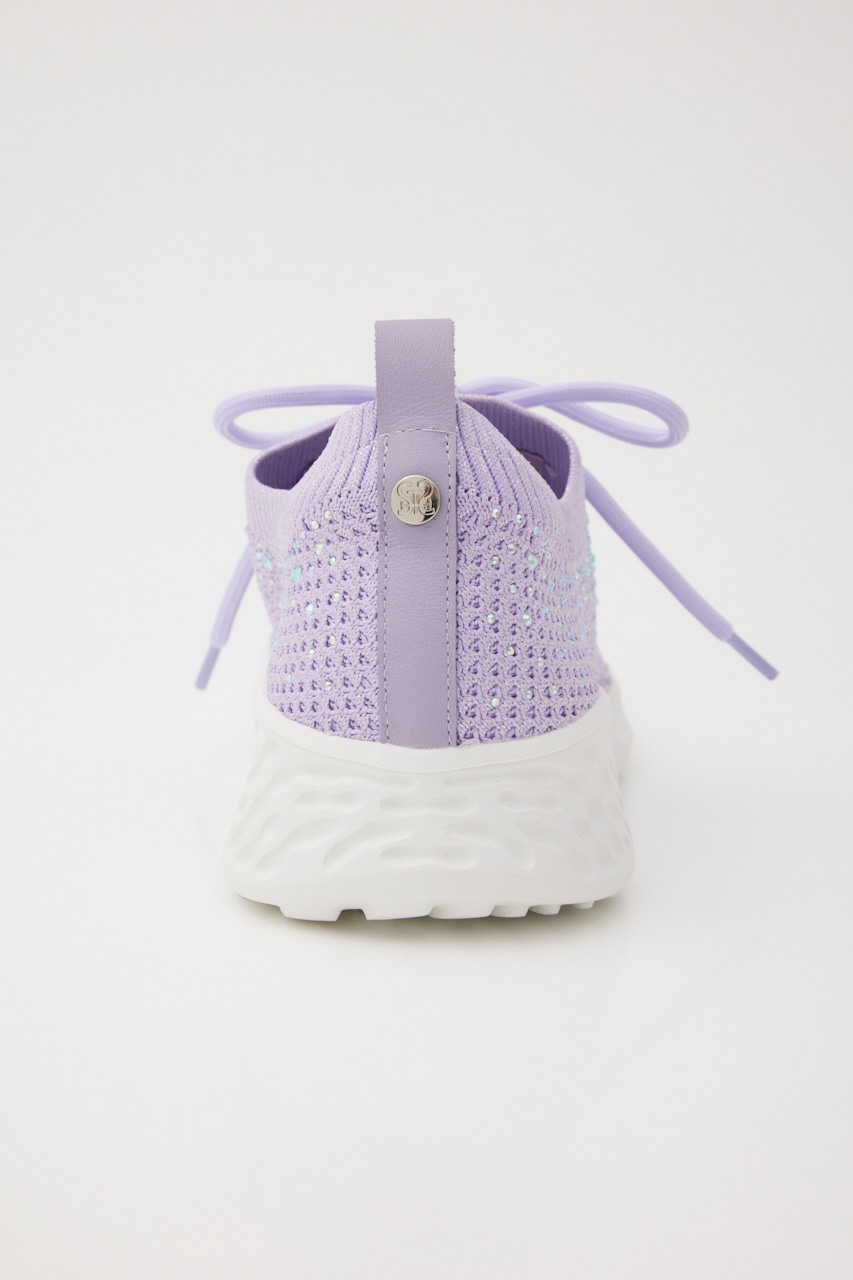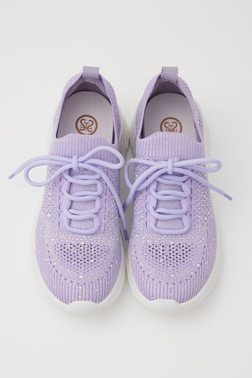 人気のレースアップスリッポンに新デザインが登場。華やかなダイヤカットのクリスタルストーンを散りばめ、通気性も良いラメ混のメッシュニット地に軽量なランニング風ソールで軽快な履き心地を実現。シューレスはデザインなのでスリッポンタイプでそのまま履いていただけます。