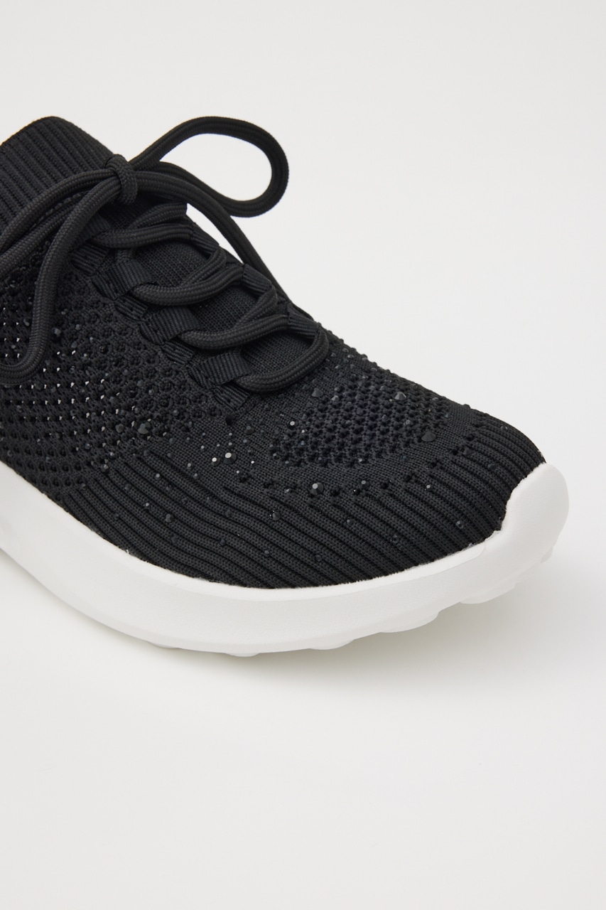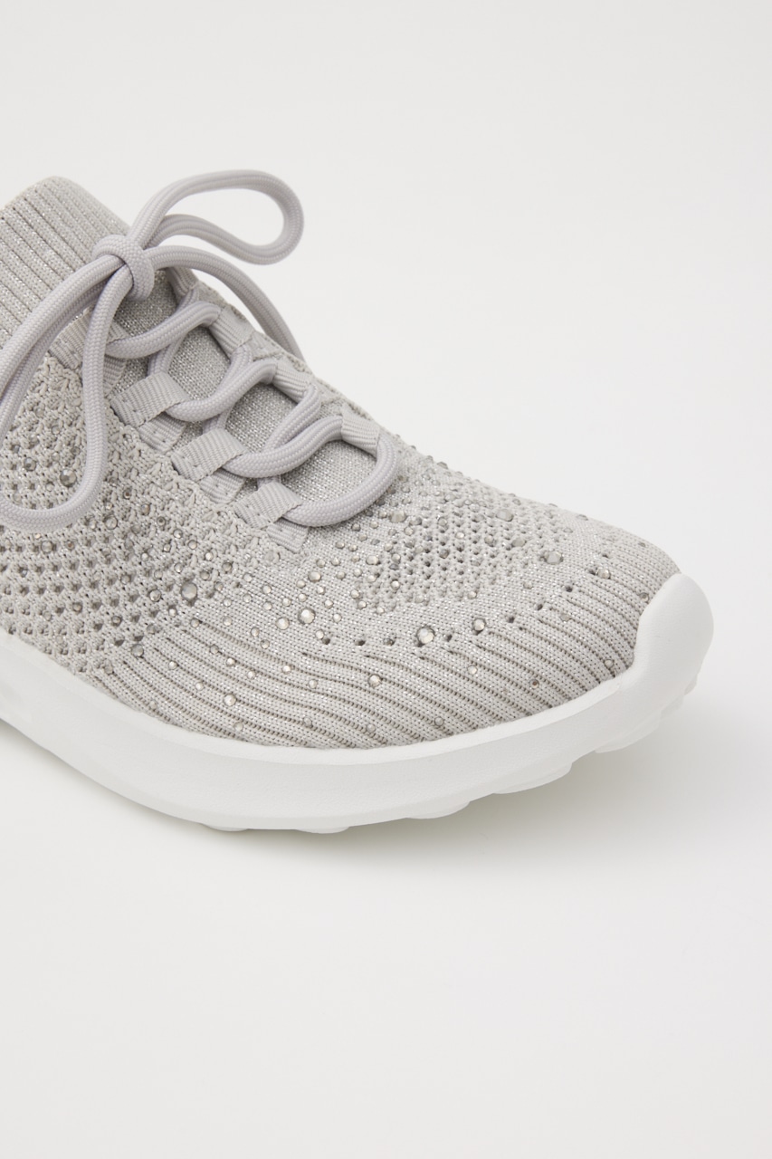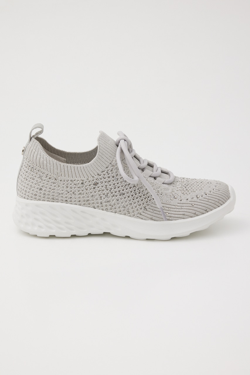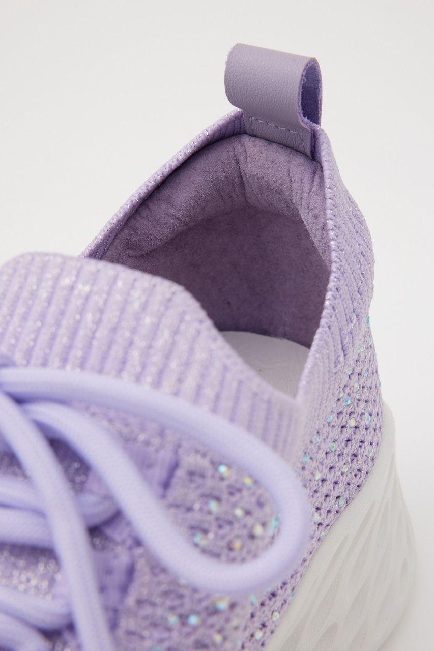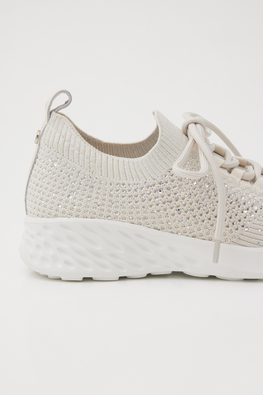 人気のレースアップスリッポンに新デザインが登場。華やかなダイヤカットのクリスタルストーンを散りばめ、通気性も良いラメ混のメッシュニット地に軽量なランニング風ソールで軽快な履き心地を実現。シューレスはデザインなのでスリッポンタイプでそのまま履いていただけます。