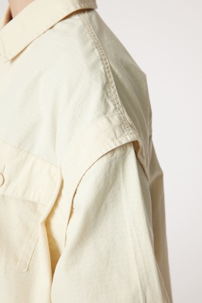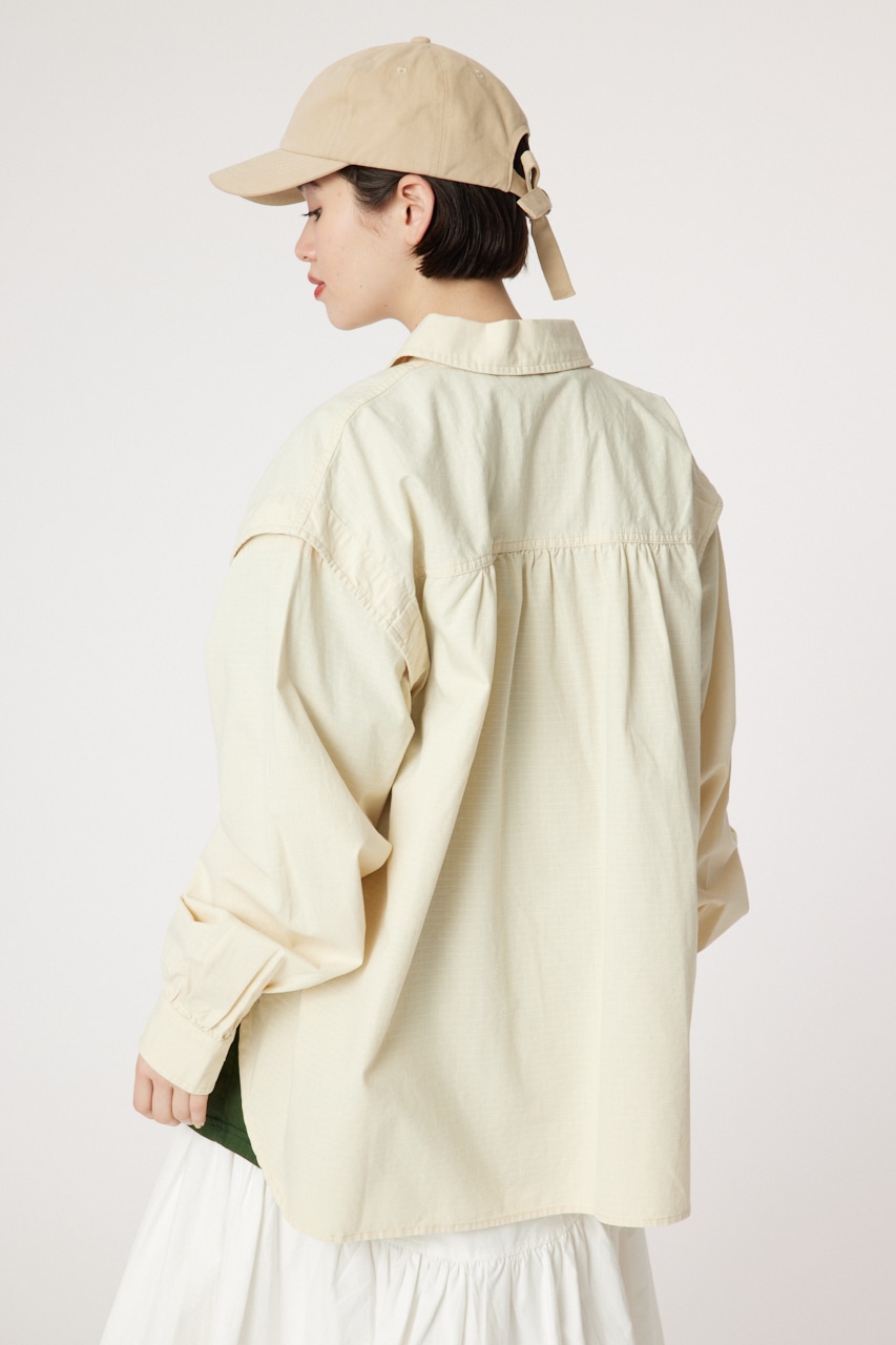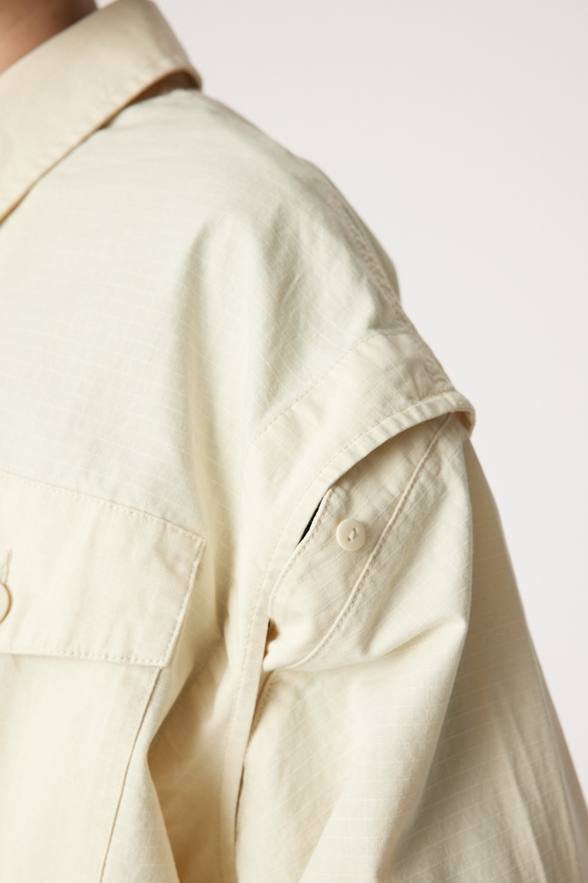 袖が脱着でき、ベストとしても着用可能なミリタリーシャツ。たっぷりとギャザーを入れた丸みのあるシルエットで、袖にもギャザーを入れボリュームスリーブに仕上げました。ユーズド感があり、こなれた着こなしができるアイテムです。