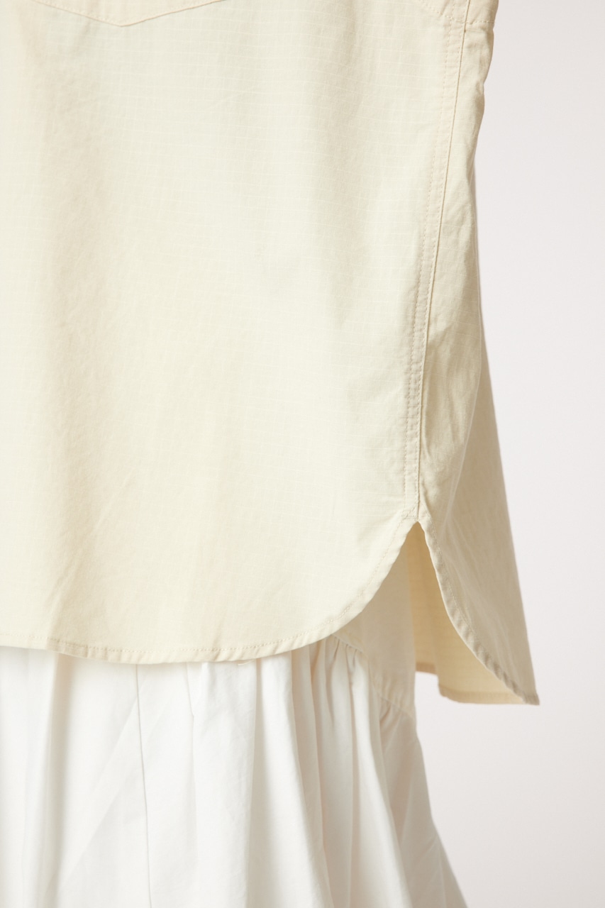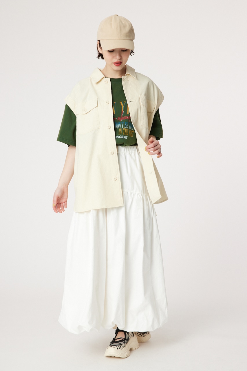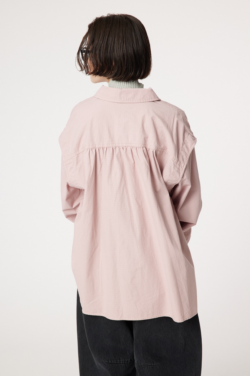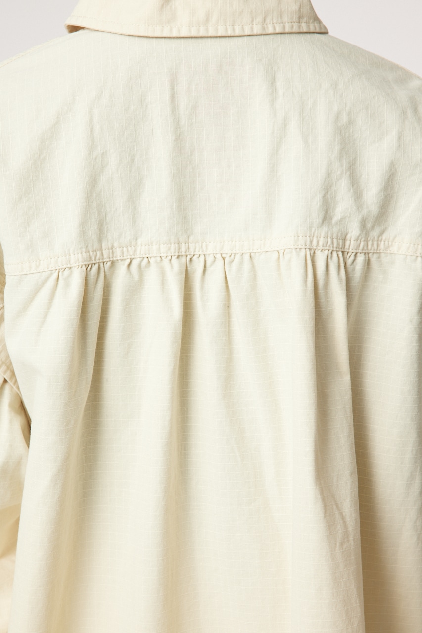 袖が脱着でき、ベストとしても着用可能なミリタリーシャツ。たっぷりとギャザーを入れた丸みのあるシルエットで、袖にもギャザーを入れボリュームスリーブに仕上げました。ユーズド感があり、こなれた着こなしができるアイテムです。