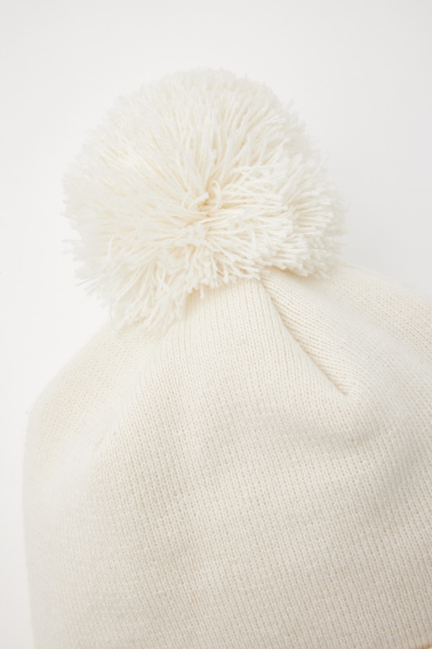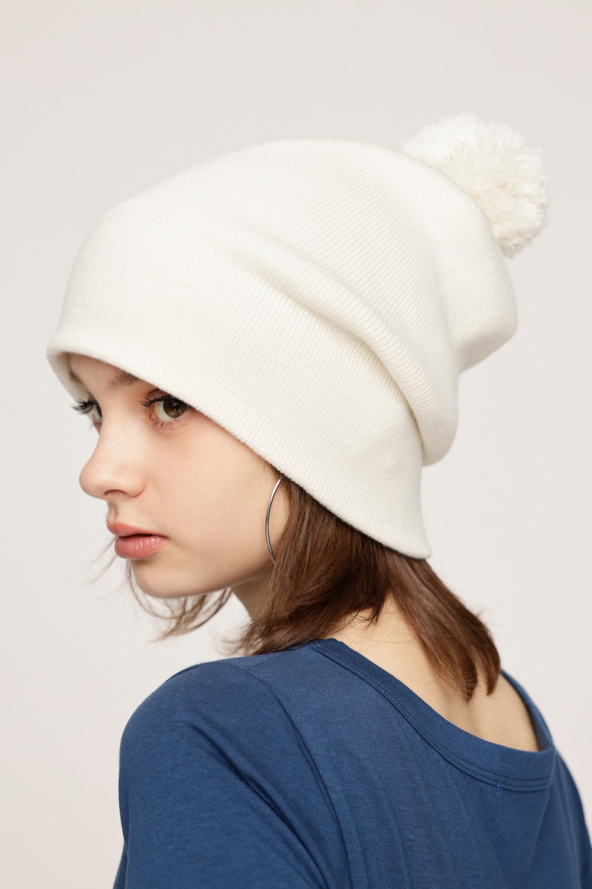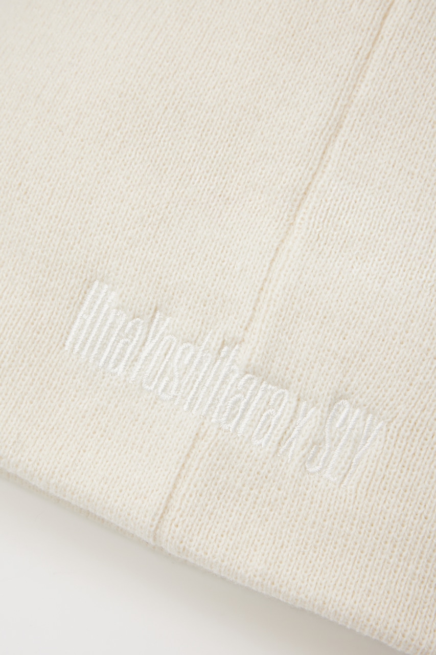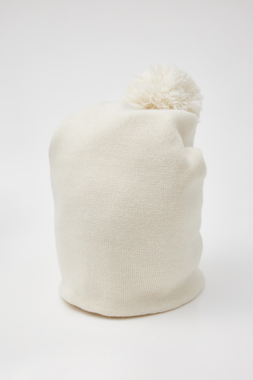 ■DETAIL:アクリル100%の糸で肉厚なリブ仕様に編み上げたポンポンニット。クラウン部分が頭の形状に沿うように設計されているので、丸みを帯びたシルエットになっています。折り返しの裏側にコラボロゴ刺繍を施しているので、伸ばして着用するとロゴが見える2WAY仕様なのもポイント。